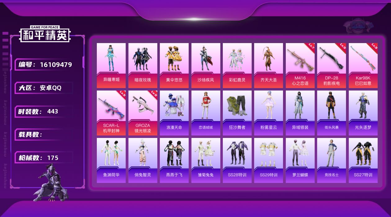 【381179】【可二次】【安卓QQ】龟仙人 汤姆逊-林间仙鹿 M762-奇异狩猎者 SCAR-L-机甲封神 娴静芝兰 GROZA-林间仙鹿 M416-心之恋语 瑞龙福将 醒狮腾龙 浪漫天命 纯白誓言 团圆交子 沙场疾风 迅捷狂鲨 暗夜契约 M762-瑞龙福将 齐天大圣飞行器 SCAR-机甲封神 狂沙舞者 彩虹鹿灵 齐天大圣 暗夜玫瑰 黄伞悠悠 神秘黑猫 怪笑疯兔