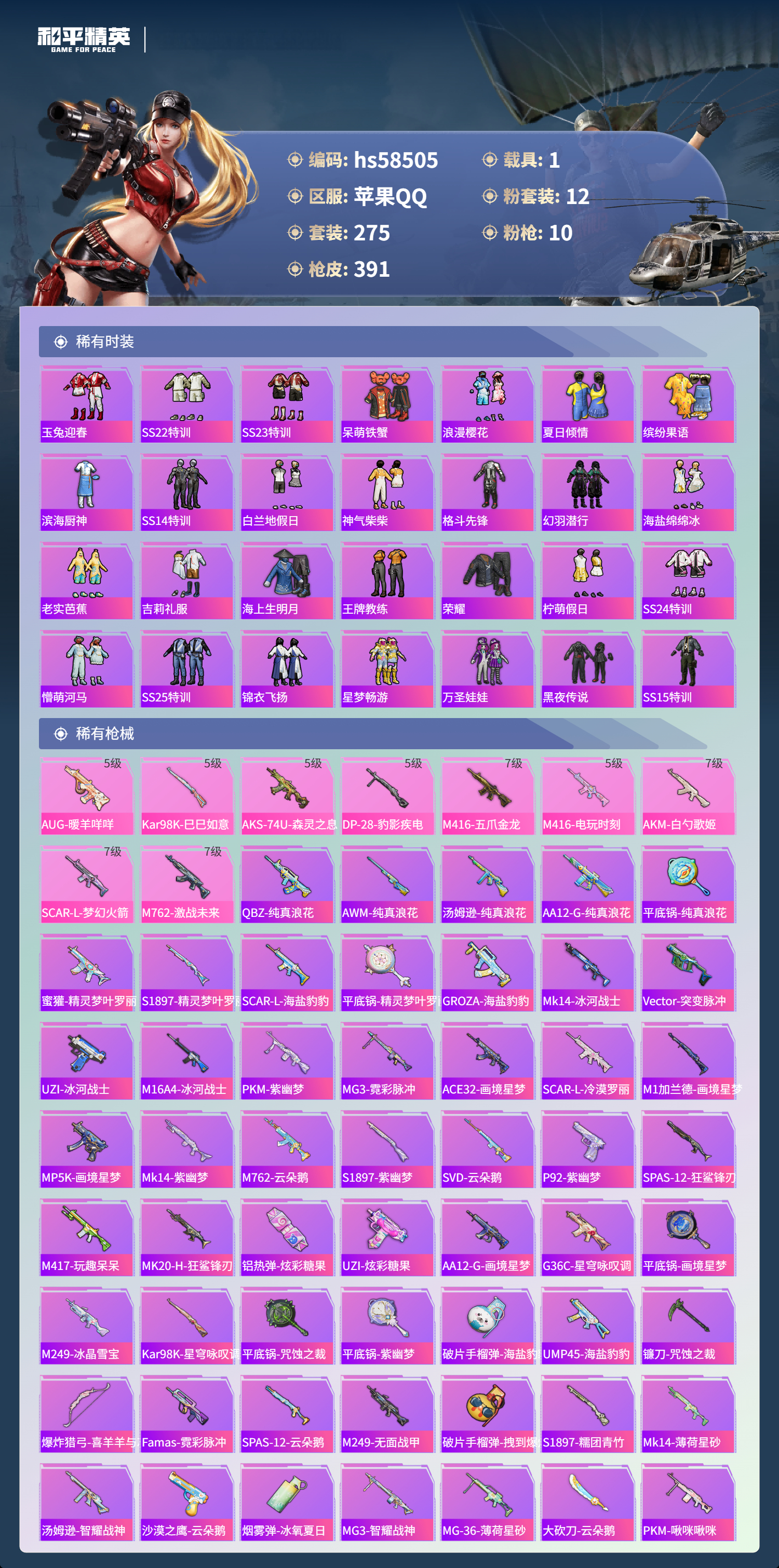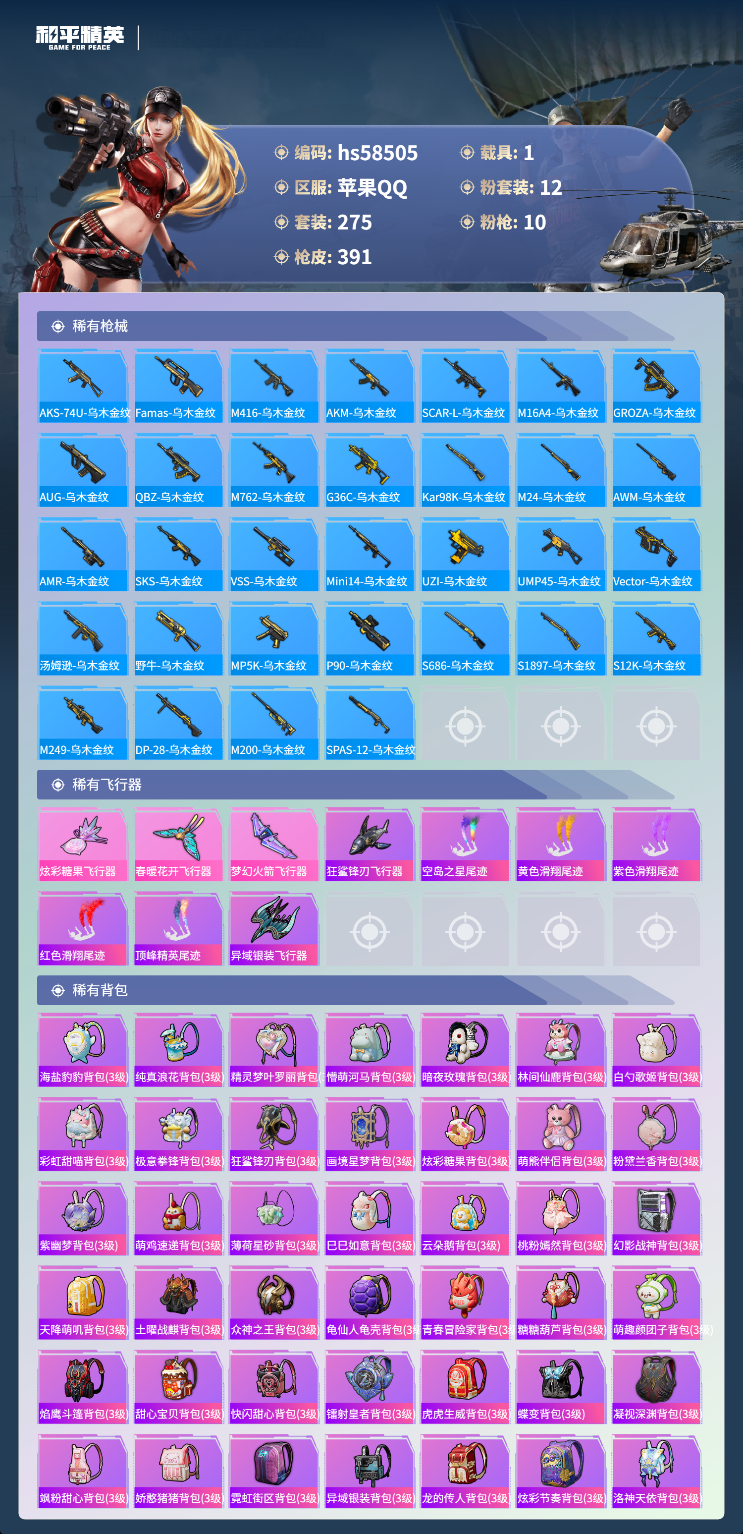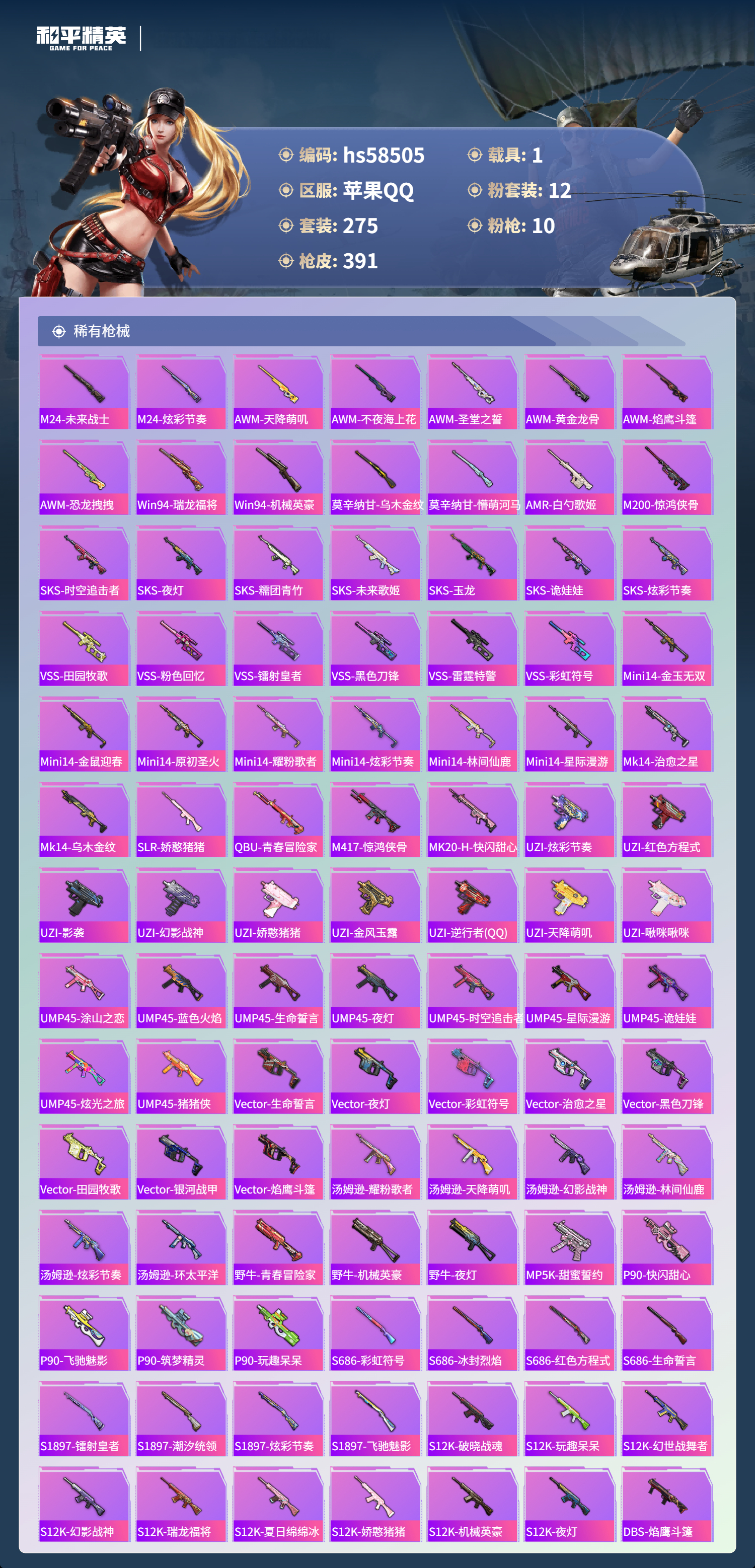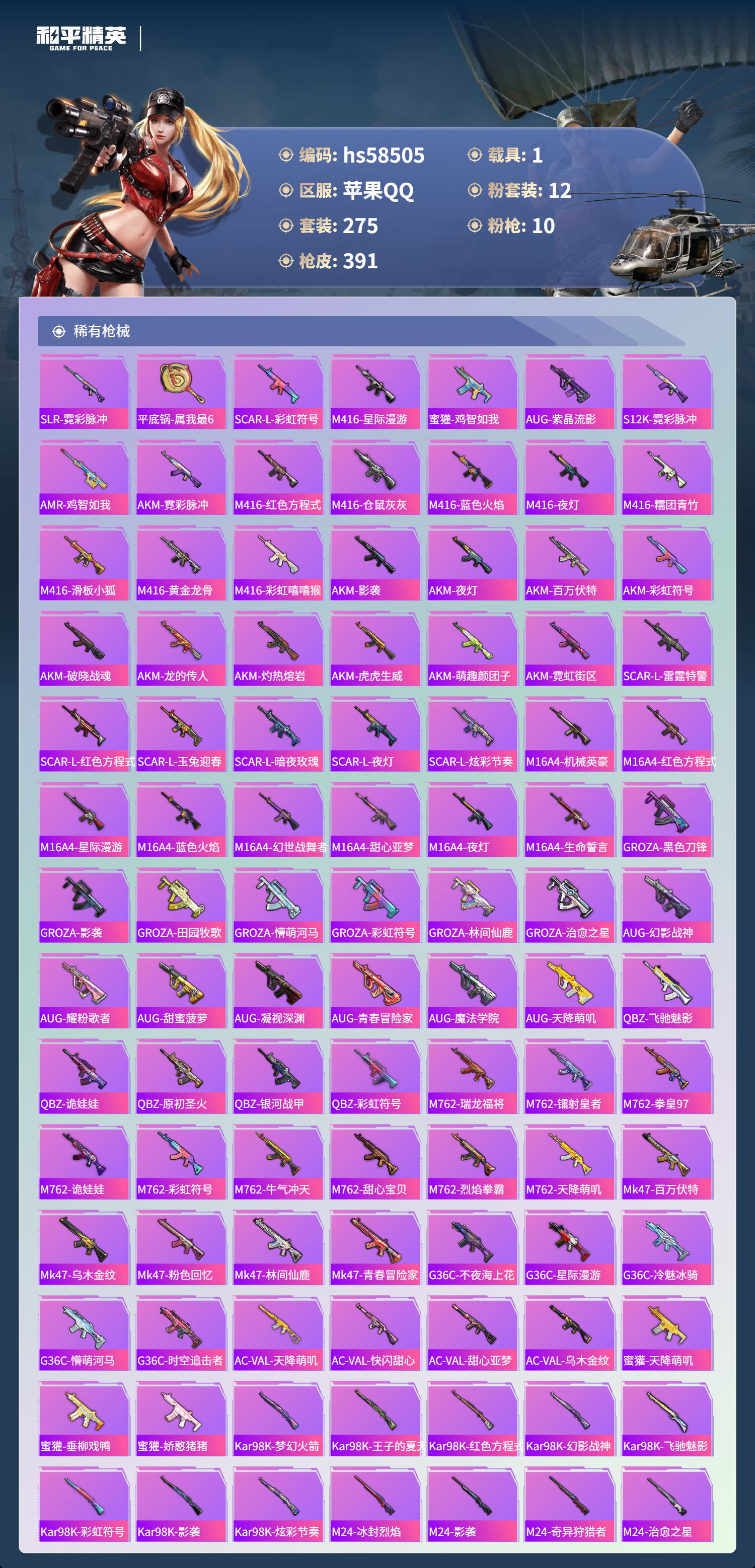 【381187】【不可二次】【苹果QQ】龟仙人 漫步者 M416-星际漫游 都市猎人 AKM-白勺歌姬 Mini14-林间仙鹿 M416-仓鼠灰灰 MK47-林间仙鹿 GROZA-林间仙鹿 山涧鹿灵 幻影随行 幽冥伯爵 AWM-黄金龙骨 SCAR-L-梦幻火箭 M762-瑞龙福将 潮萌小黄鸭 黑色刀锋 海洋之心 狂沙舞者 M416-五爪金龙 萌兔起飞 M24-奇异狩猎者 机械英豪 极速红龙 汤姆