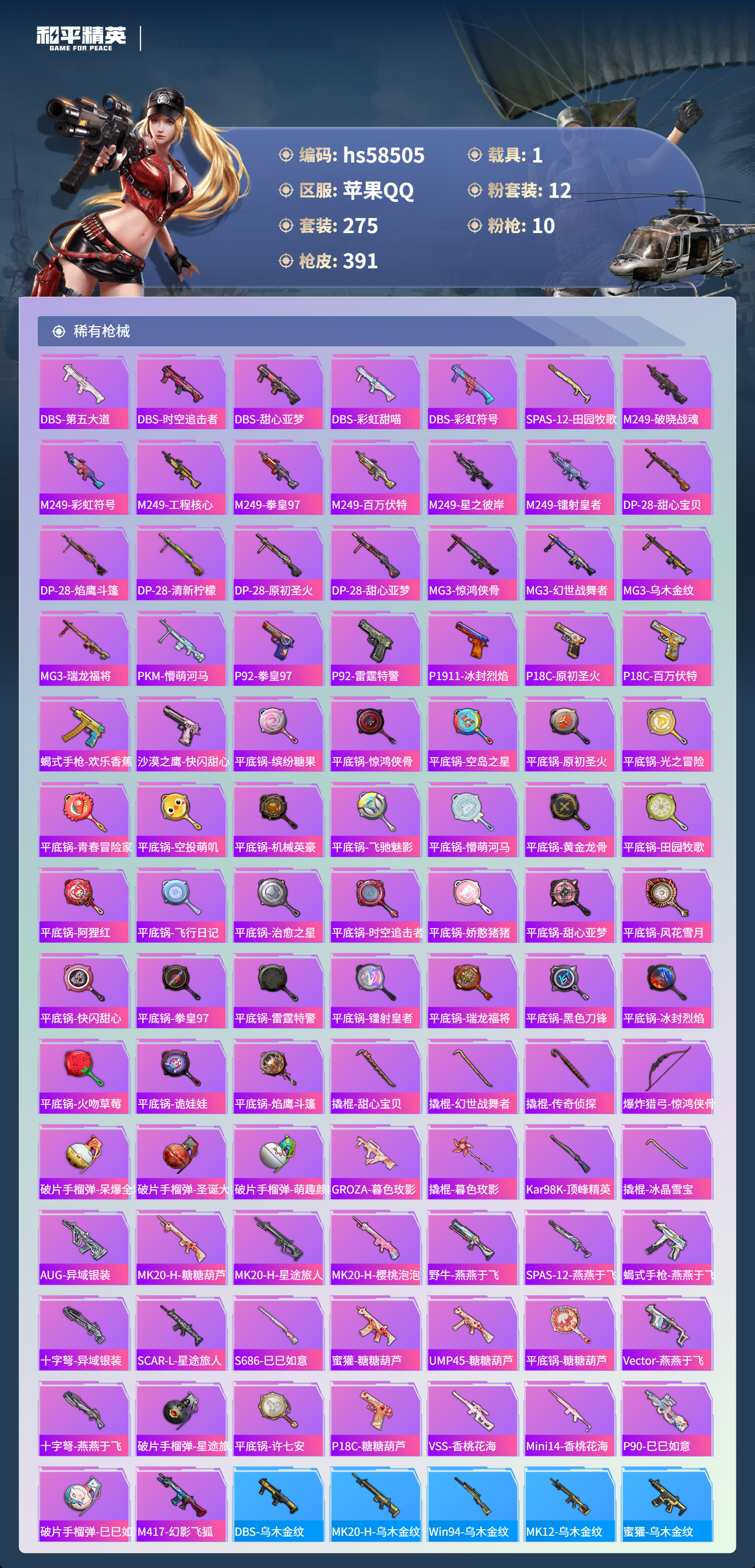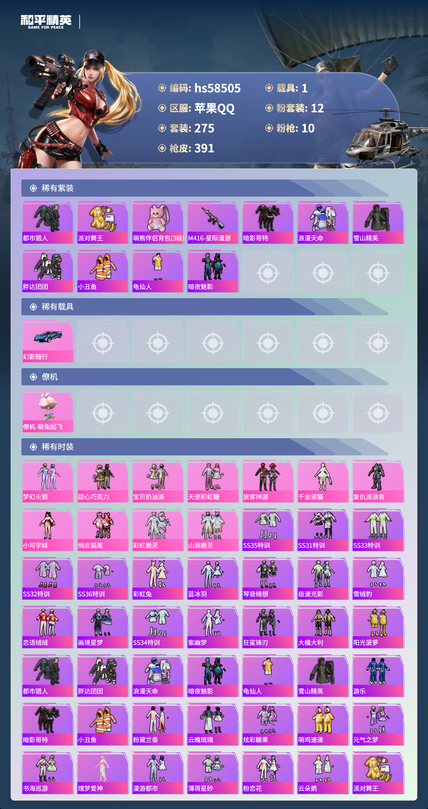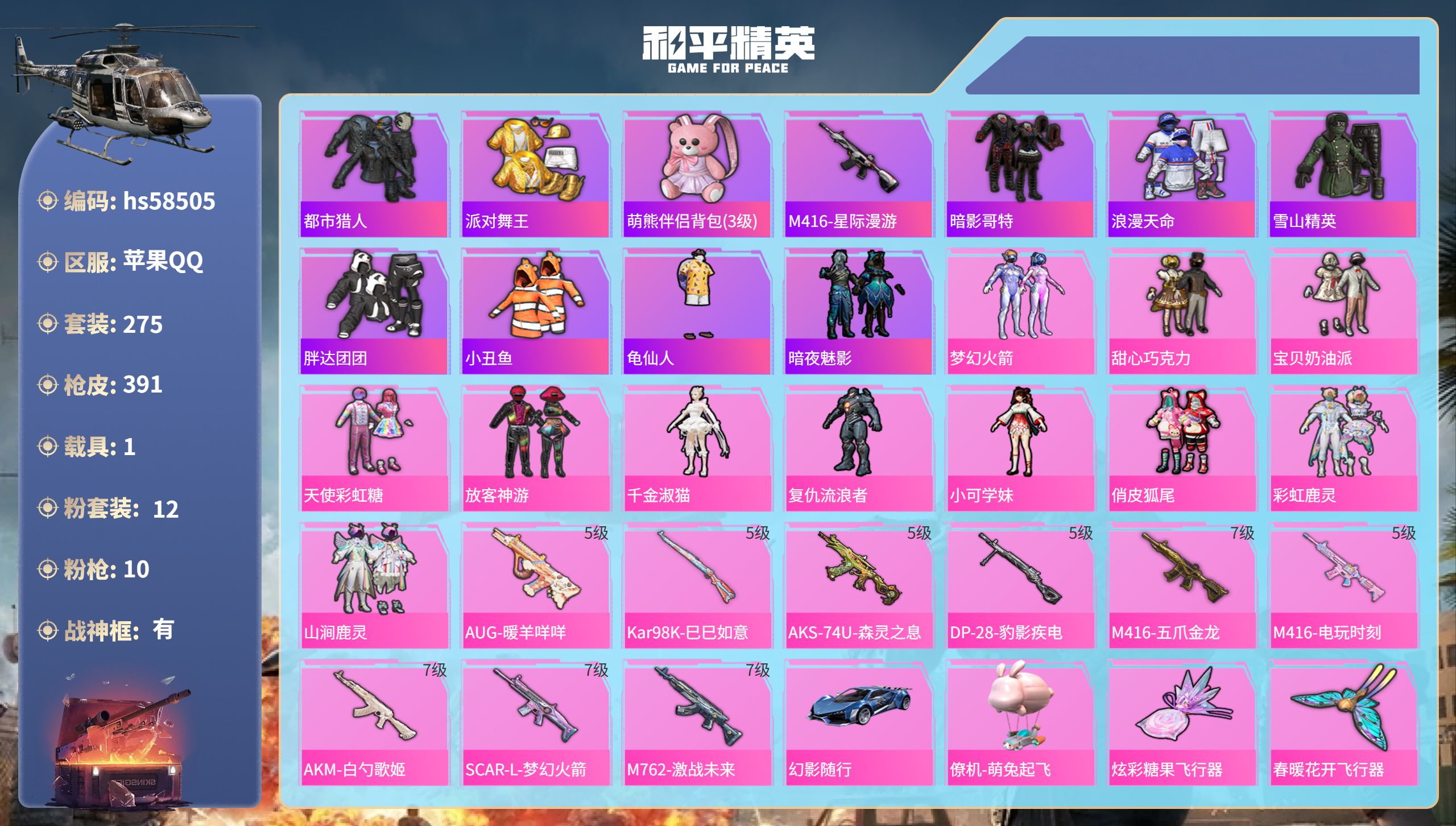 【381187】【不可二次】【苹果QQ】龟仙人 漫步者 M416-星际漫游 都市猎人 AKM-白勺歌姬 Mini14-林间仙鹿 M416-仓鼠灰灰 MK47-林间仙鹿 GROZA-林间仙鹿 山涧鹿灵 幻影随行 幽冥伯爵 AWM-黄金龙骨 SCAR-L-梦幻火箭 M762-瑞龙福将 潮萌小黄鸭 黑色刀锋 海洋之心 狂沙舞者 M416-五爪金龙 萌兔起飞 M24-奇异狩猎者 机械英豪 极速红龙 汤姆
