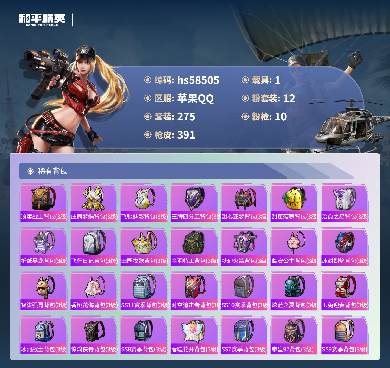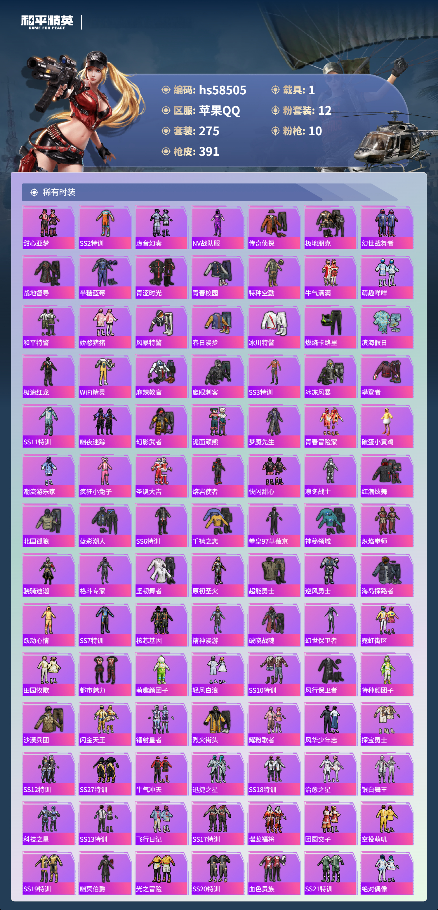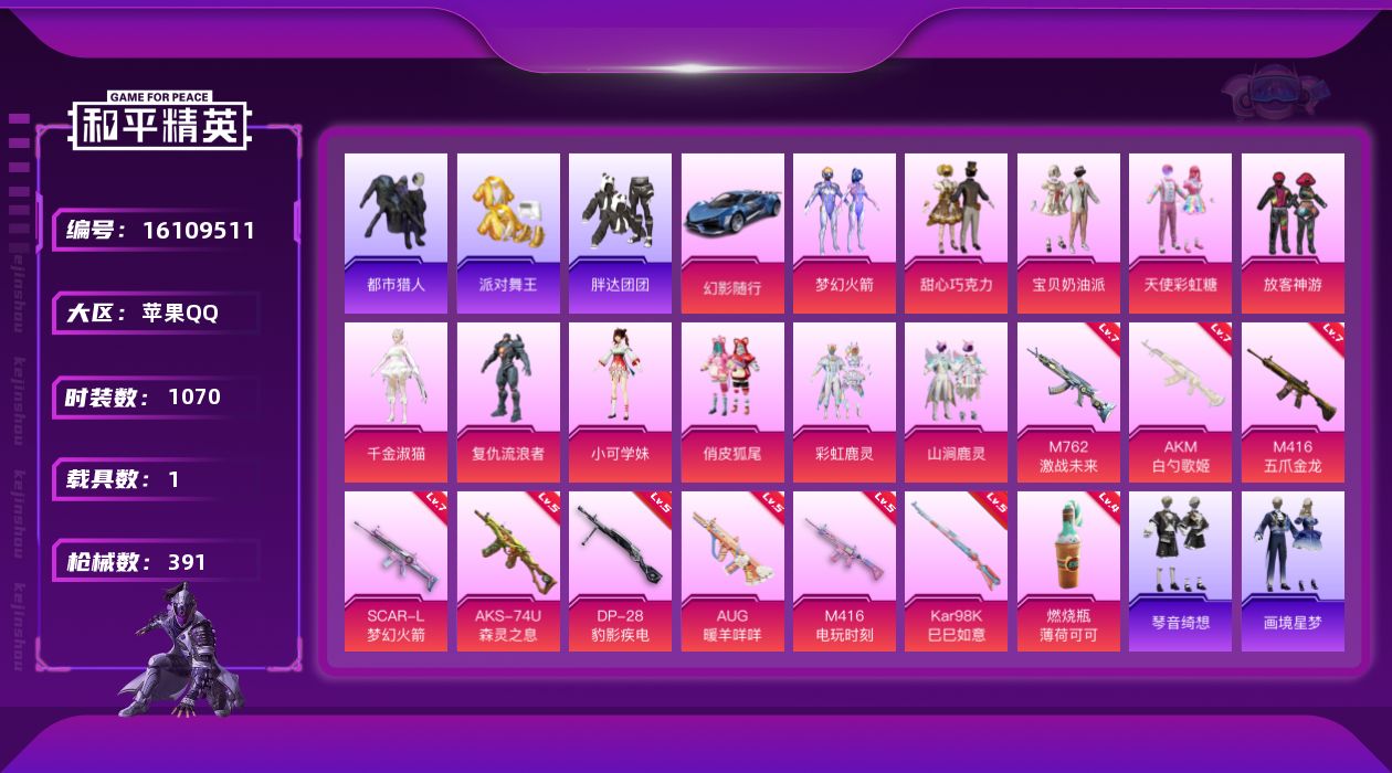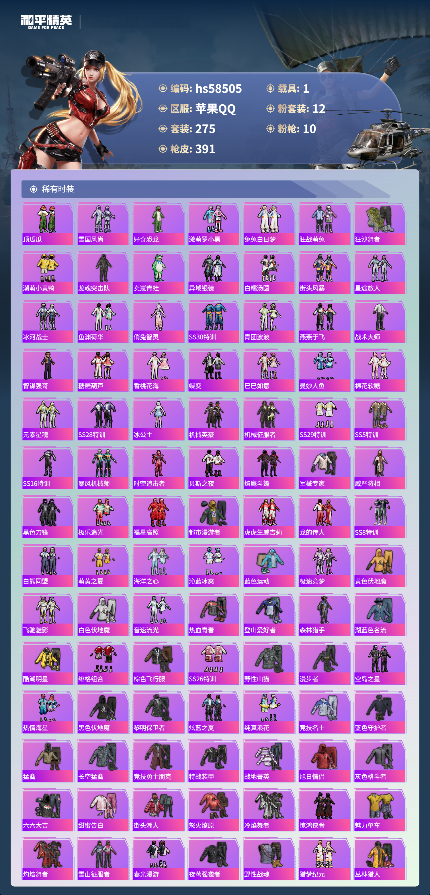 【381187】【不可二次】【苹果QQ】龟仙人 漫步者 M416-星际漫游 都市猎人 AKM-白勺歌姬 Mini14-林间仙鹿 M416-仓鼠灰灰 MK47-林间仙鹿 GROZA-林间仙鹿 山涧鹿灵 幻影随行 幽冥伯爵 AWM-黄金龙骨 SCAR-L-梦幻火箭 M762-瑞龙福将 潮萌小黄鸭 黑色刀锋 海洋之心 狂沙舞者 M416-五爪金龙 萌兔起飞 M24-奇异狩猎者 机械英豪 极速红龙 汤姆