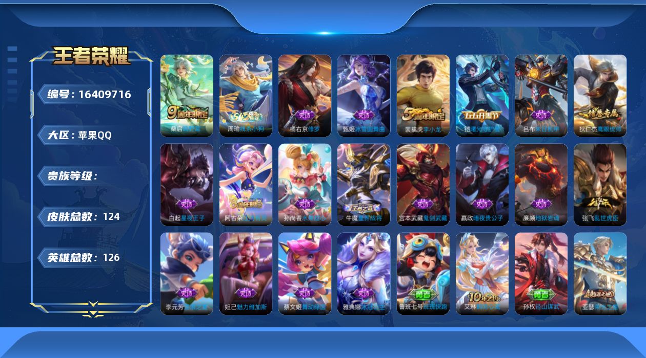 【423958】【可二次】【QQ(苹果)】大漠名商 不知火舞 乱世虎臣 鹰眼统帅 韩信 星夜王子 擒涛扼浪 星界战将 水果甜心 舞动绿茵 沙漠行僧 演武夺筹 驱傩正仪 海盐诗旅 娜可露露 万华元夜 逐浪之夏 暗夜贵公子 冰冠公主 末日机甲 修罗 艾琳 地狱岩魂 橘右京 江河有灵 古海寻踪 赵云 鬼剑武藏 冰雪圆舞曲 探海日记 魅力维加斯 李小龙 云中旅人 曙光守护者