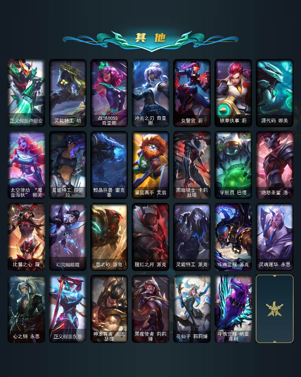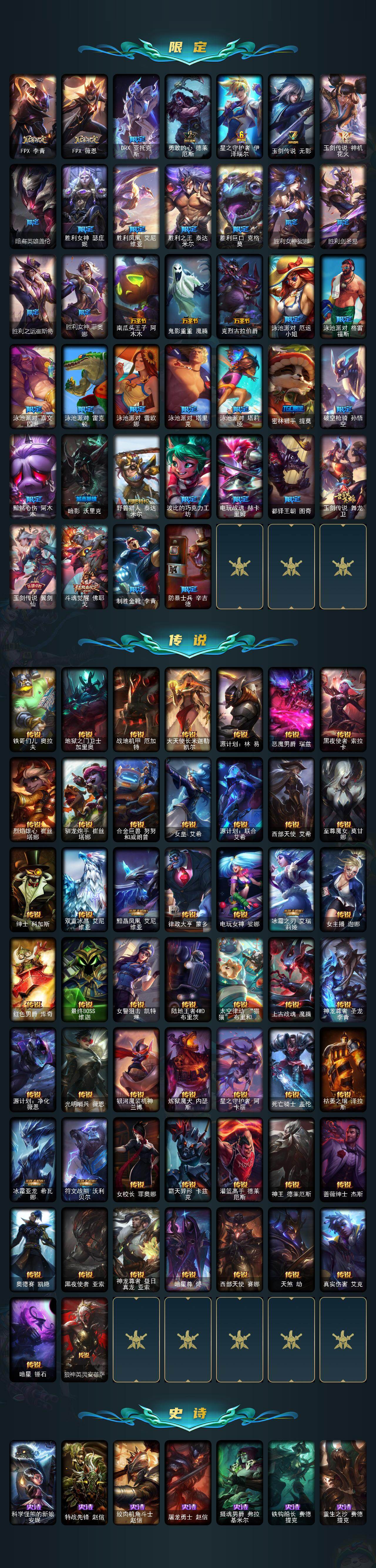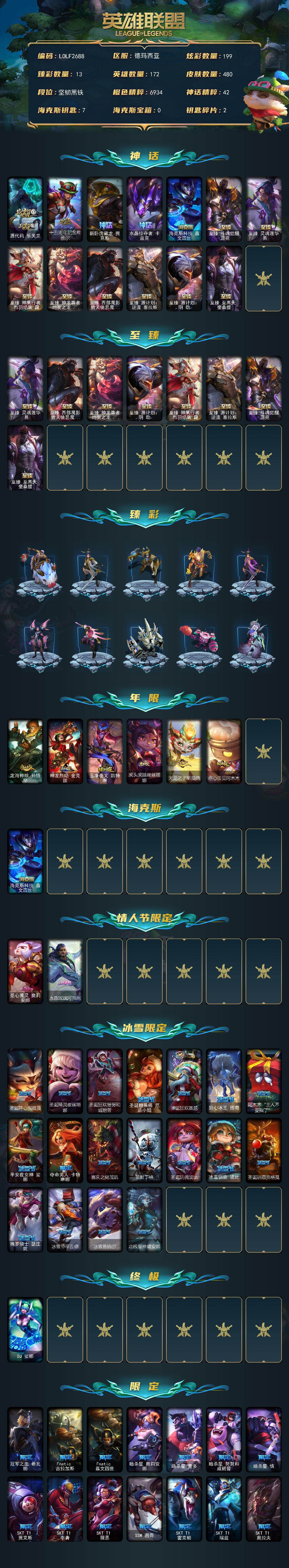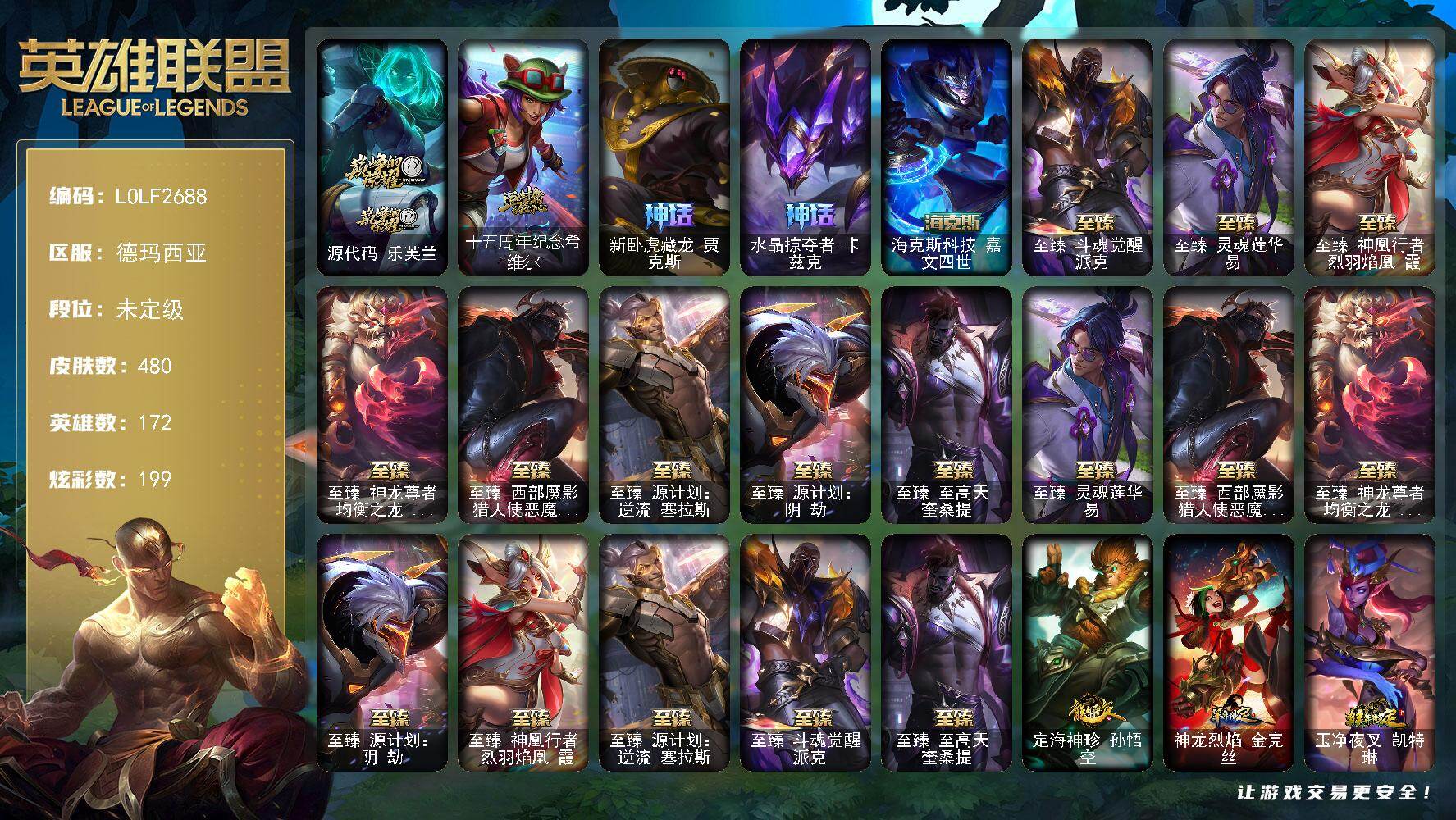【446422】【LOLF2688】172英雄/480皮肤/1终极/13神话/80限定/13臻彩/199炫彩/51传说/91史诗/未定级/源代码乐芙兰/十五周年纪念希维尔/新卧虎藏龙贾克斯/水晶掠夺者卡兹克/海克斯科技嘉文四世/至臻至高天奎桑提/至臻斗魂觉醒派克/至臻灵魂莲华易/至臻神凰行者烈羽焰凰霞/至臻神龙尊者均衡之龙沃利贝尔/至臻西部魔影猎天使恶魔泰隆/至臻源计划:逆流塞拉斯/至臻源计划: