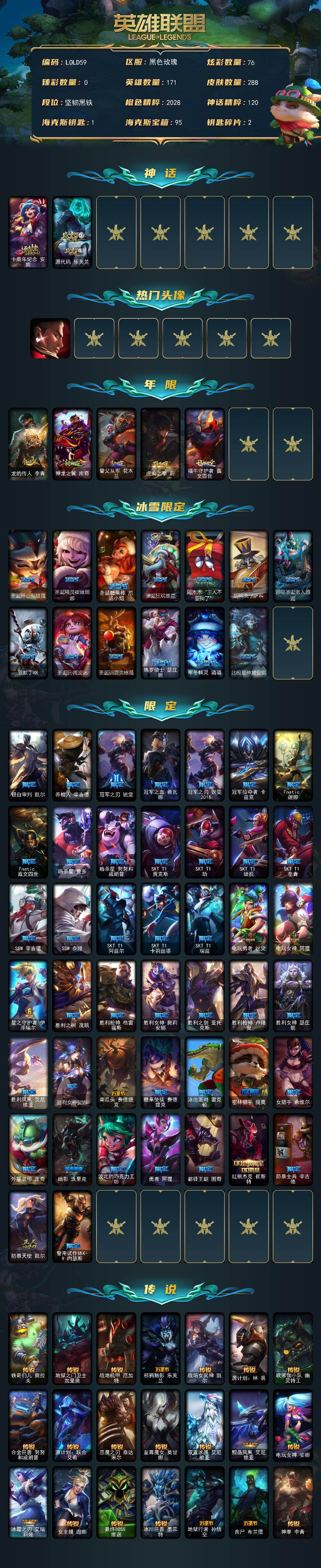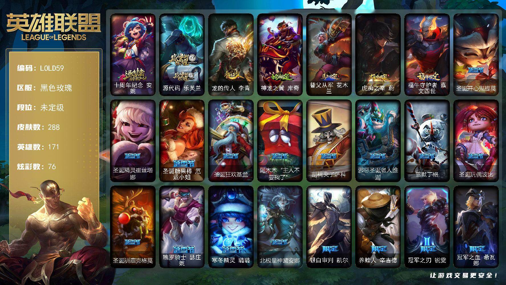 【446979】【LOLD59】171英雄/288皮肤/2神话/62限定/76炫彩/32传说/71史诗/未定级账号等级:490/十周年纪念安妮/源代码乐芙兰/觅心游侠卢锡安/龙的传人李青/神龙之翼库奇/替父从军花木兰/虎痴之拳蔚/福牛守护者嘉文四世/圣诞开心鬼提莫/圣诞精灵崔丝塔娜/圣诞糖果棒厄运小姐/圣诞狂欢基兰/阿木木:“主人不要我了”/胡桃夹子萨科/邪恶圣诞老人维迦/雪默丁格/圣诞玩偶波比