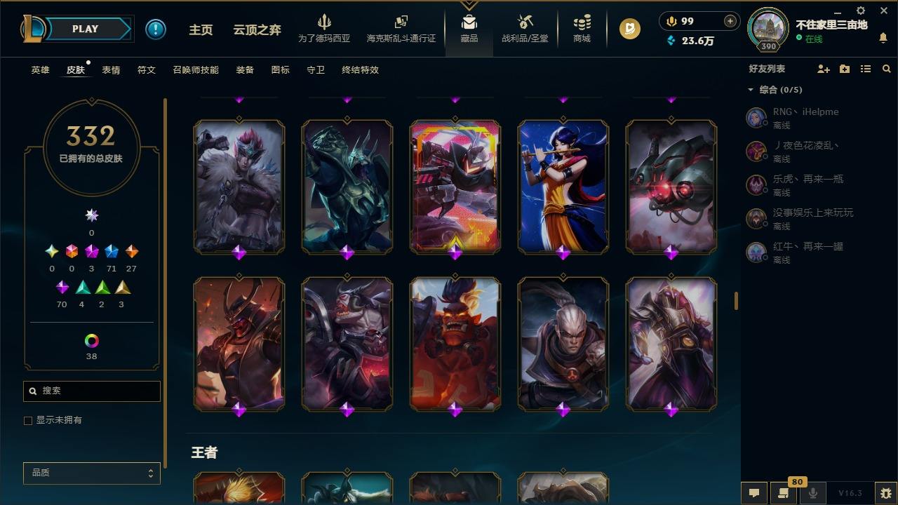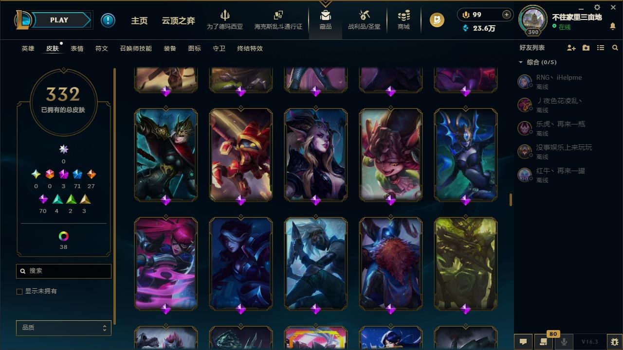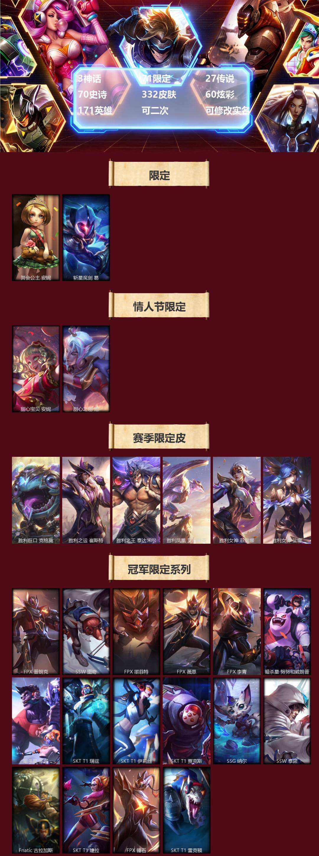 【447376】[16587376]3神话 71限定 27传说 70史诗 332皮肤 60炫彩 171英雄 可二次 可修改实名 【限定】斩星魔剑 易,舞会公主 安妮【情人节限定】甜心宝贝 安妮,甜心之翎 洛【赛季限定皮】胜利凤凰 艾尼维亚,胜利女神-菲奥娜,胜利之运 崔斯特,胜利女神 娑娜,胜利巨口 克格莫,胜利之王 泰达米尔【冠军限定系列】S1FNC 酒桶,S2 暗杀星 蒙多,S2 暗杀星 努