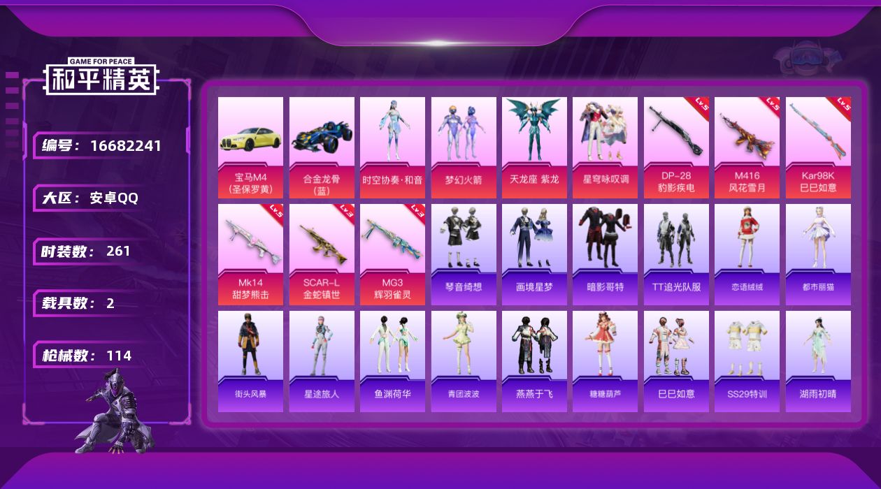 【460036】【不可二次】【安卓QQ】合金龙骨蓝色 M416-风花雪月 梦幻火箭 漫步者 暗影哥特 时空协奏·和音 AWM-黄金龙骨