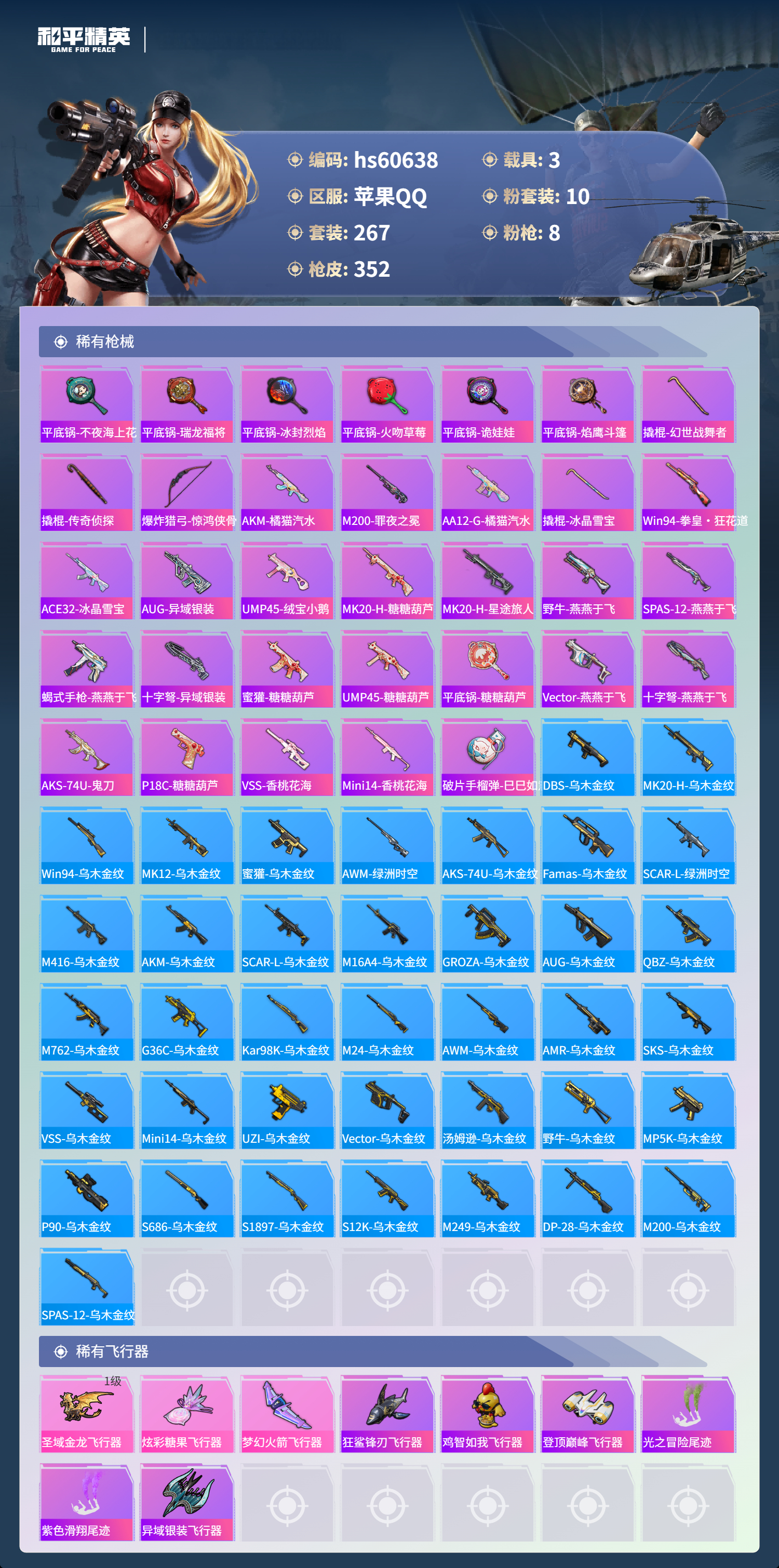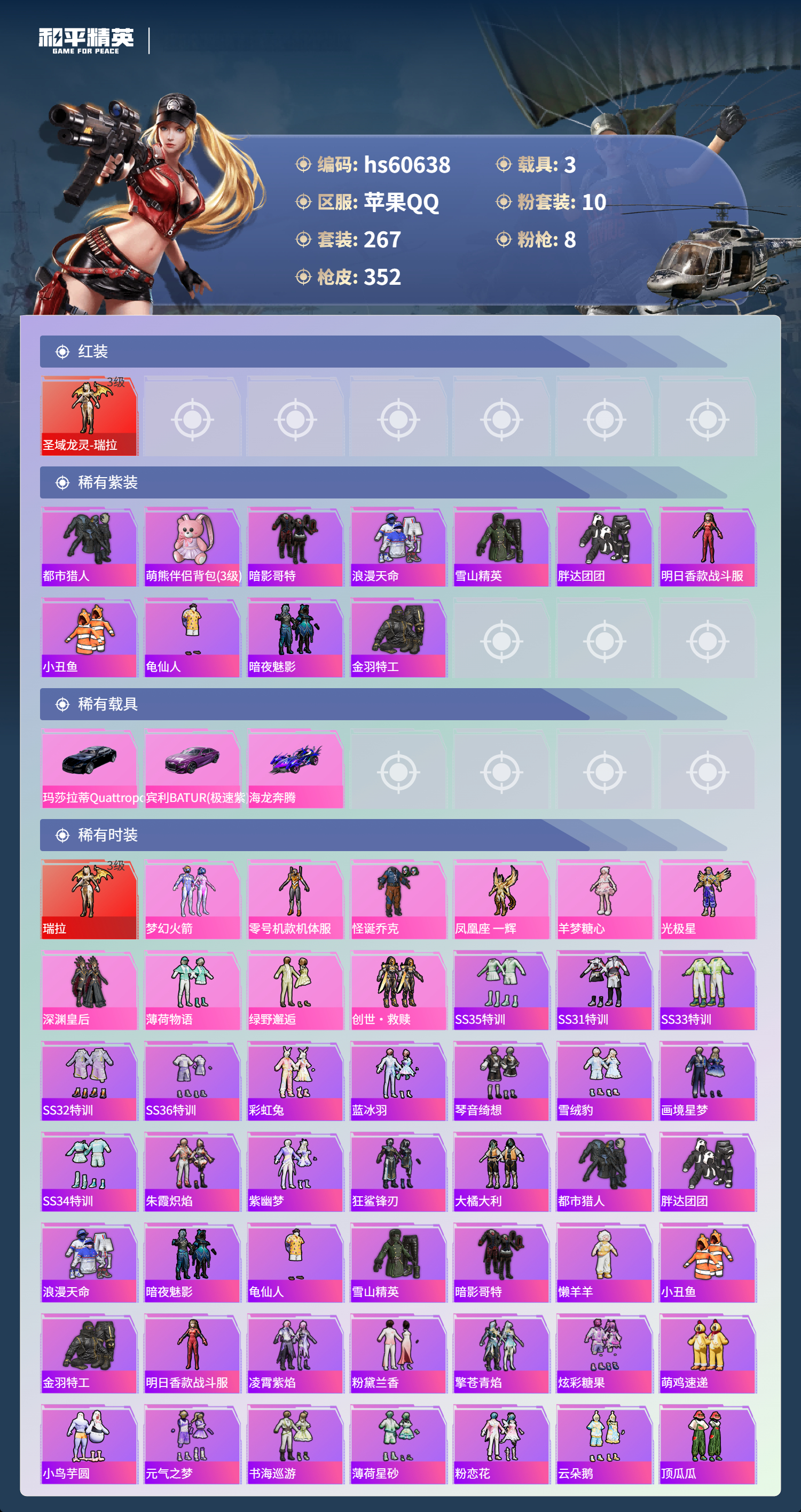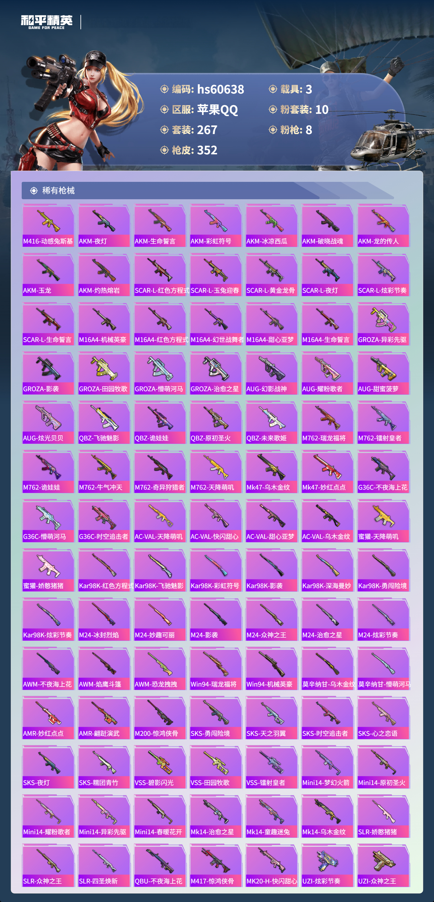【465540】【不可二次】【苹果QQ】龟仙人 水银刺客 深渊皇后 漫步者 迪迦奥特曼 都市猎人 M249-古堡领主 海龙奔腾 韶华初心 机械英豪 极速红龙 M762-奇异狩猎者 UMP45-量子极限 软嫩糖心蛋 M416-心之恋语 黄螳螂 瑞龙福将 浪漫天命 梦幻火箭飞行器 胖达团团 团圆交子 SS1特训 怪诞乔克 暗夜契约 M762-瑞龙福将 狂沙舞者 金羽特工 梦幻火箭 圣域龙灵-瑞拉 薄