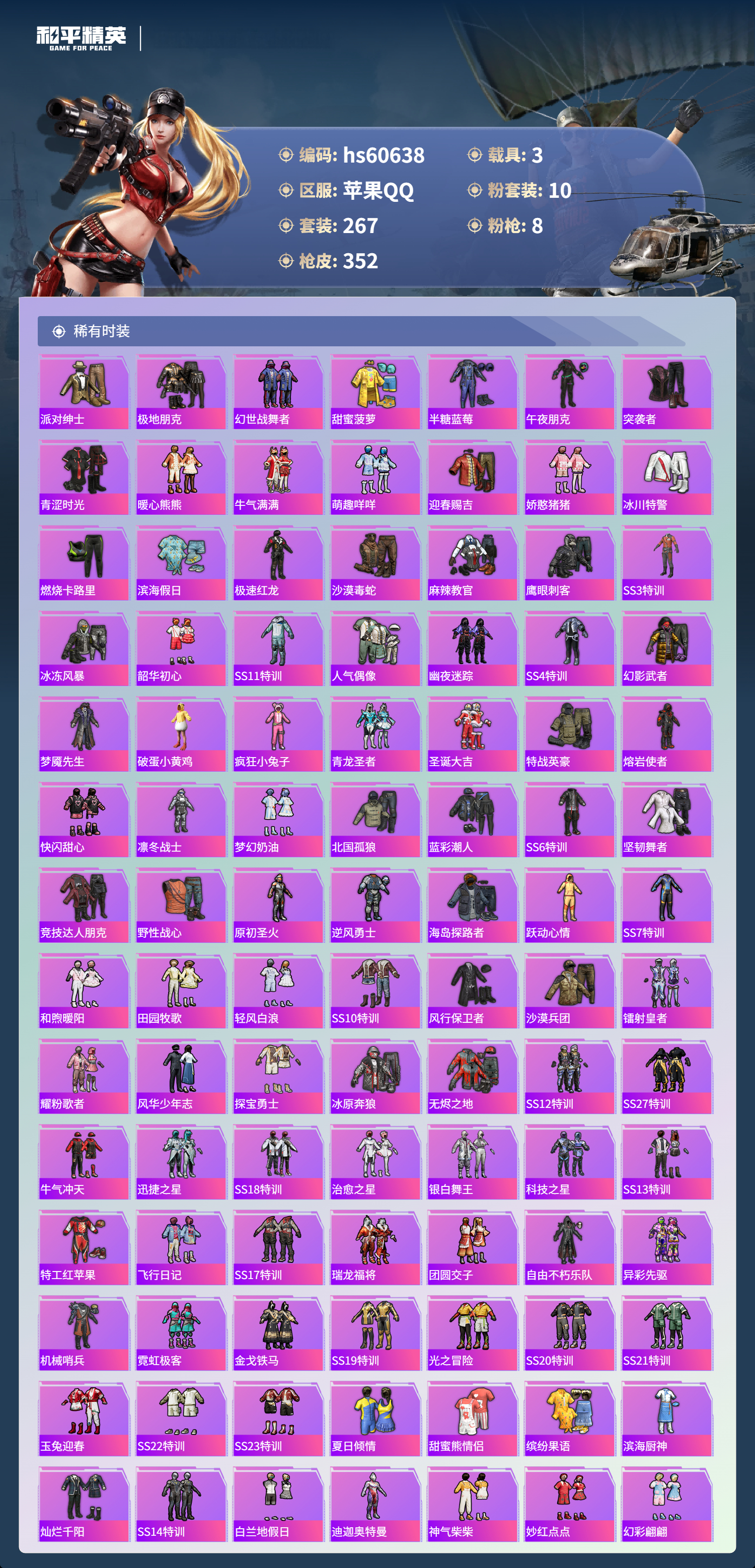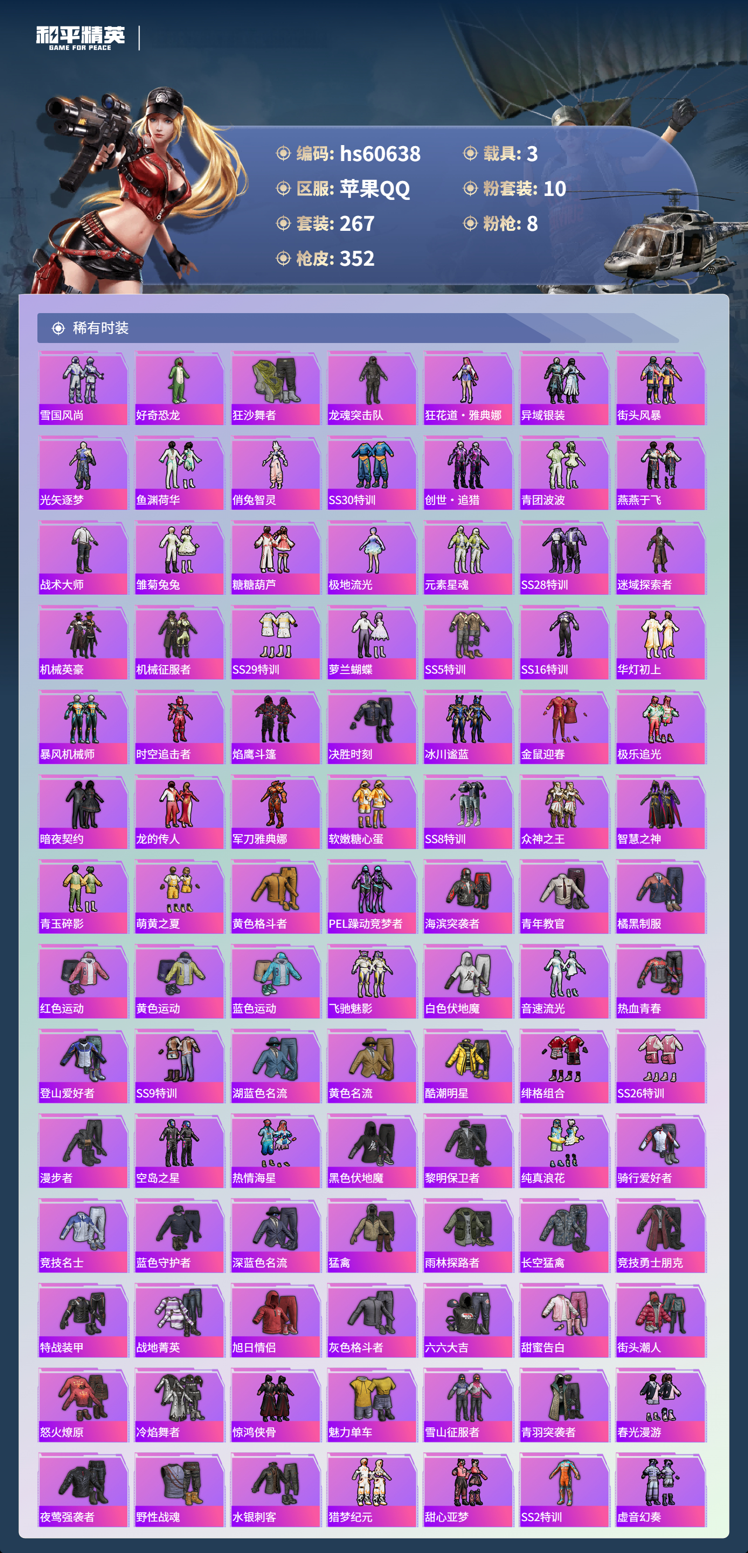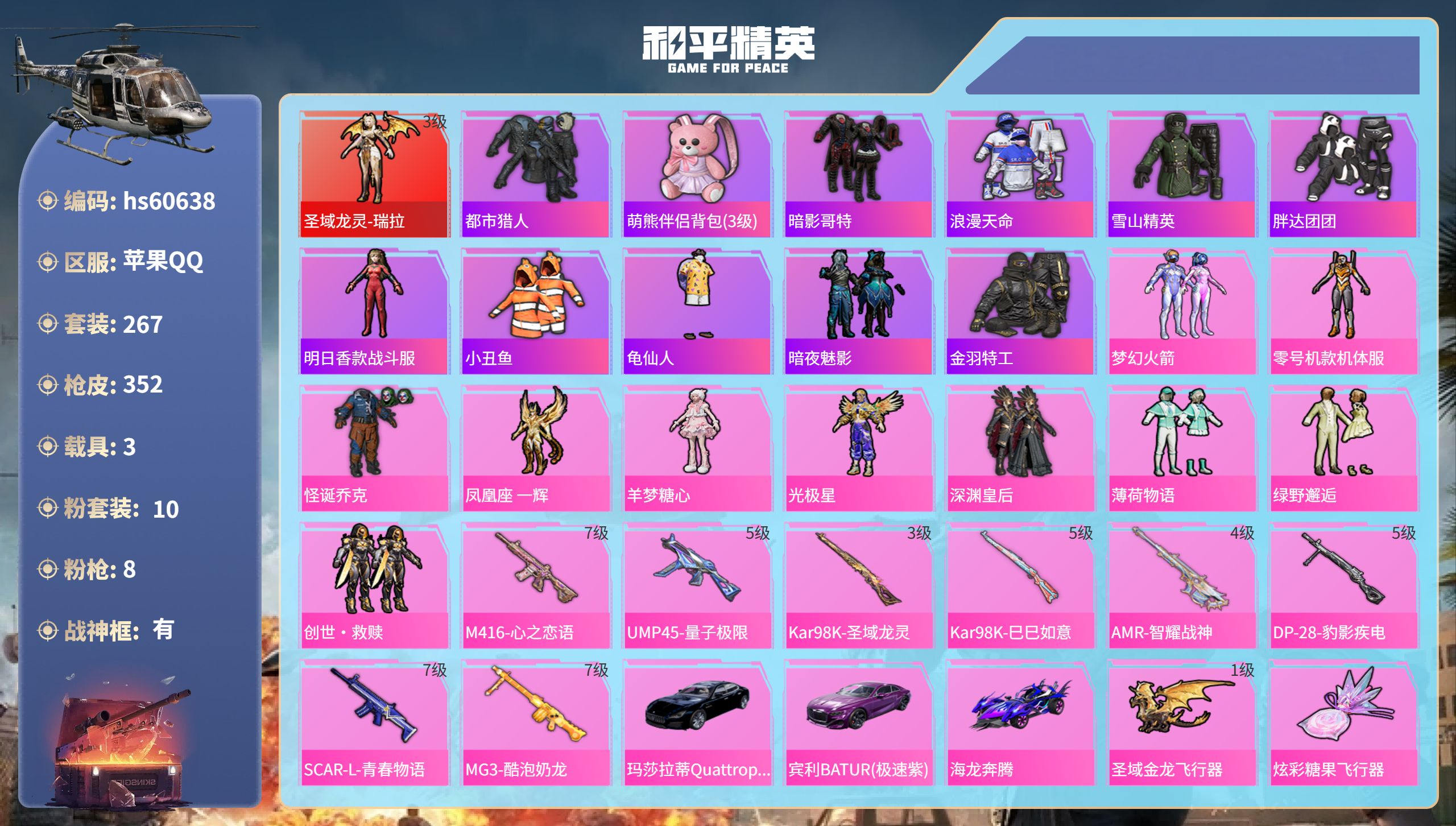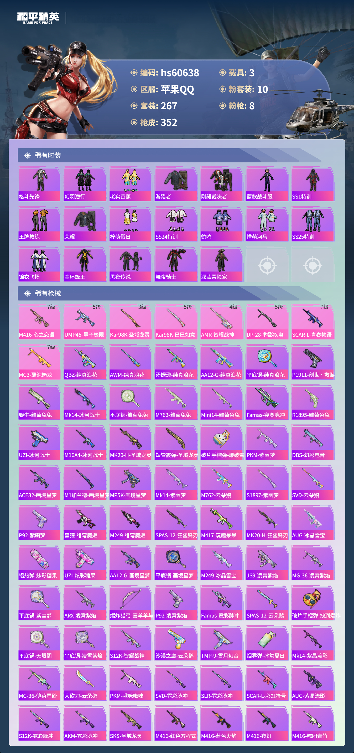 【465540】【不可二次】【苹果QQ】龟仙人 水银刺客 深渊皇后 漫步者 迪迦奥特曼 都市猎人 M249-古堡领主 海龙奔腾 韶华初心 机械英豪 极速红龙 M762-奇异狩猎者 UMP45-量子极限 软嫩糖心蛋 M416-心之恋语 黄螳螂 瑞龙福将 浪漫天命 梦幻火箭飞行器 胖达团团 团圆交子 SS1特训 怪诞乔克 暗夜契约 M762-瑞龙福将 狂沙舞者 金羽特工 梦幻火箭 圣域龙灵-瑞拉 薄