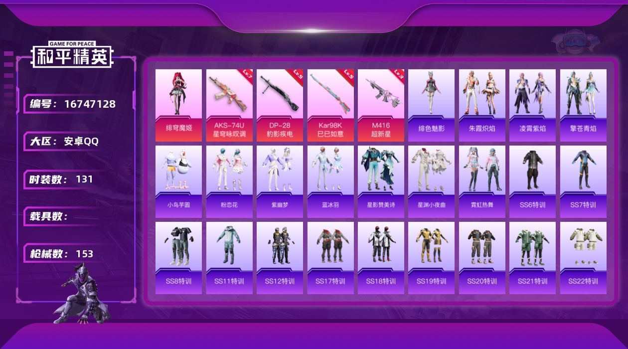 【467177】[16747128]安卓 【枪皮号 绯穹魔姬/M416-超新星(三级)/AKS-74U-星穹咏叹调(七级)】手Q-1粉装-4特效枪-0载具-2粉色飞行器-44923热力值-6王牌印记-131套装-153枪皮【粉色套装】:角色-绯穹魔姬【粉色枪皮等级】:M416-超新星(三级),AKS-74U-星穹咏叹调(七级),Kar98K-巳巳如意(五级),DP-28-豹影疾电(五级)【粉色枪