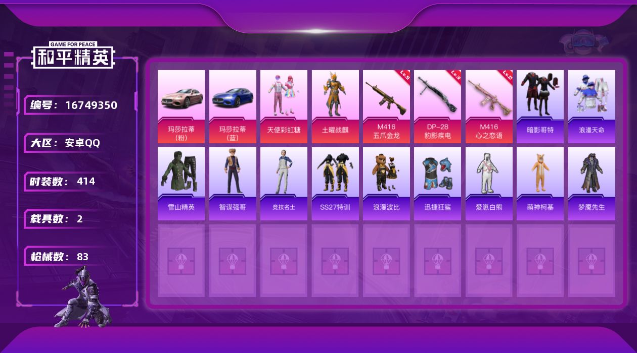 【467443】【不可二次】【安卓QQ】SS1特训 M416-五爪金龙 迅捷狂鲨 萌神柯基 至尊龙雀飞行服 土耀战麟 玛莎拉蒂蓝色 软嫩糖心蛋 M416-心之恋语 AKM-缤纷海域 天使彩虹糖 浪漫波比 玛莎拉蒂粉色 浪漫天命 暗影哥特 雪山精英 土曜战麒