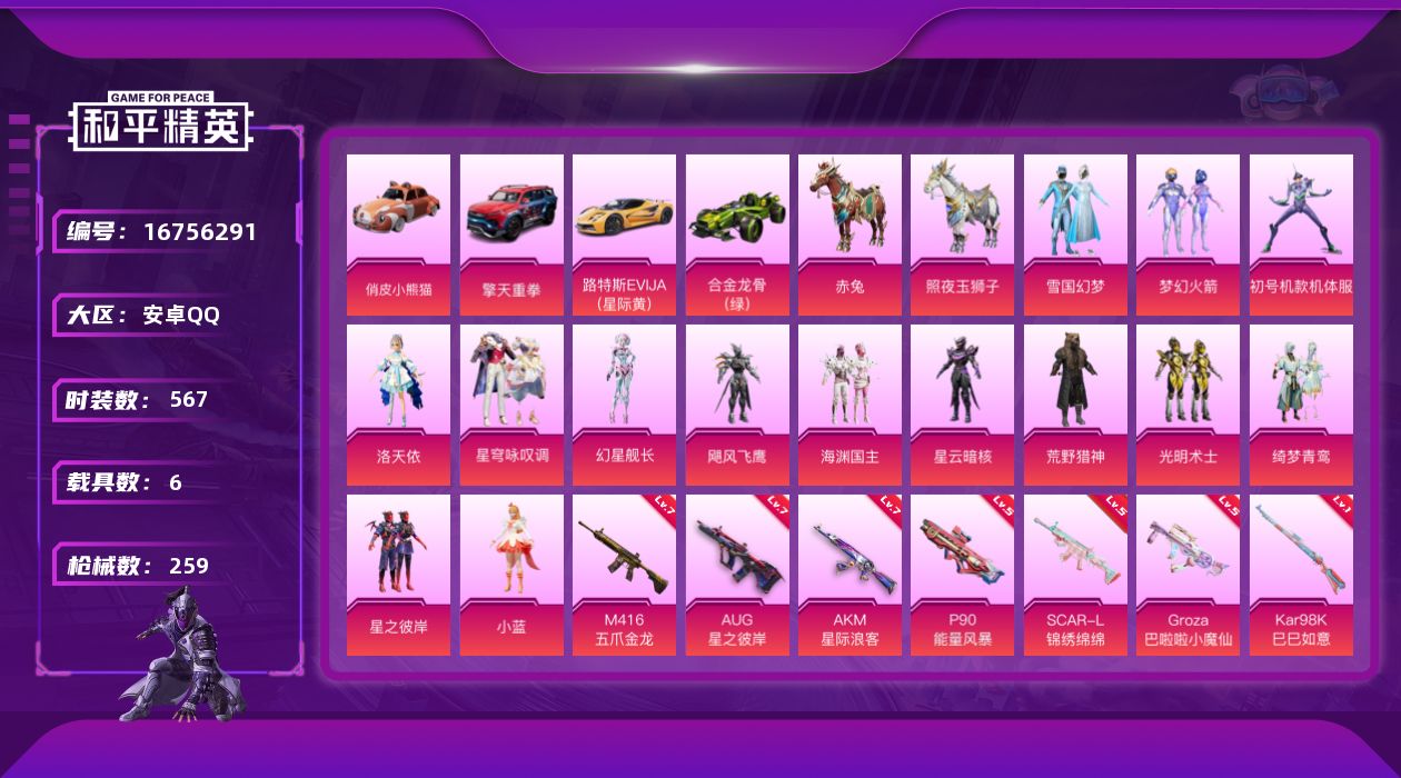 【467978】【可二次】【安卓QQ】AKM-星际浪客 雪国梦幻 M416-五爪金龙 路特斯EV黄色 漫步者 拂晓神骑飞行器 星际浪客飞行器 洛天依 星之彼岸飞行器 梦起落英 俏皮小熊猫 星之彼岸 软嫩糖心蛋 瑞龙福将 AUG-星之彼岸 团圆交子 GROZA-巴啦啦小魔仙 赤兔 P90-能量风暴 飓风飞鹰 合金龙骨绿色 M762-瑞龙福将 黑色刀锋 绮梦青鸾 新侠客行 荒野猎神 SCAR-L-锦