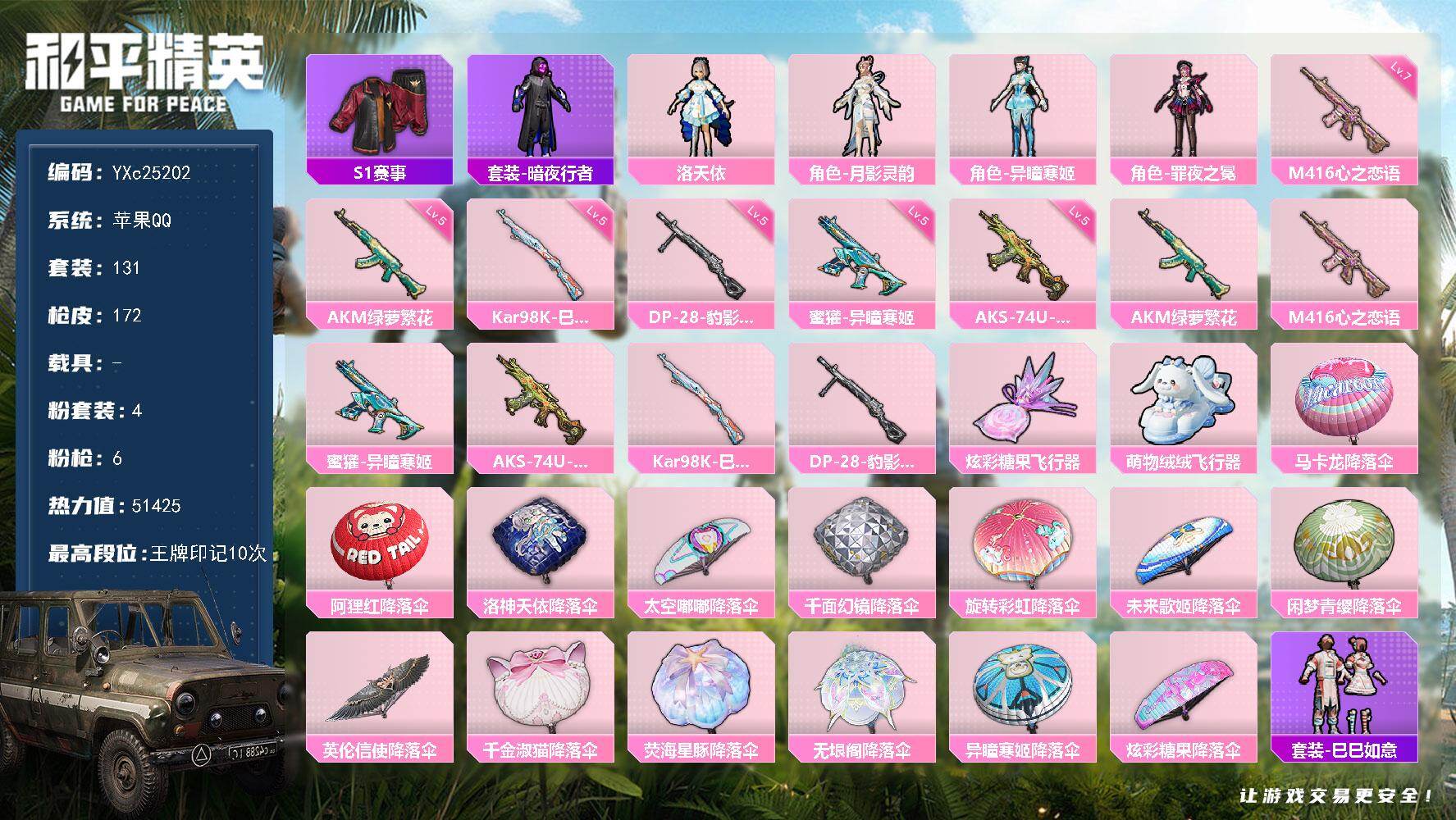 【469671】【不可二次】【苹果QQ】AKM-绿萝繁花 阿狸红降落伞 千面幻镜降落伞 洛神天依降落伞 韶华初心 马卡龙降落伞 洛天依 极速红龙 太空嘟嘟降落伞 M416-心之恋语 雪山精英 旋转彩虹降落伞 激萌罗小黑 团圆交子