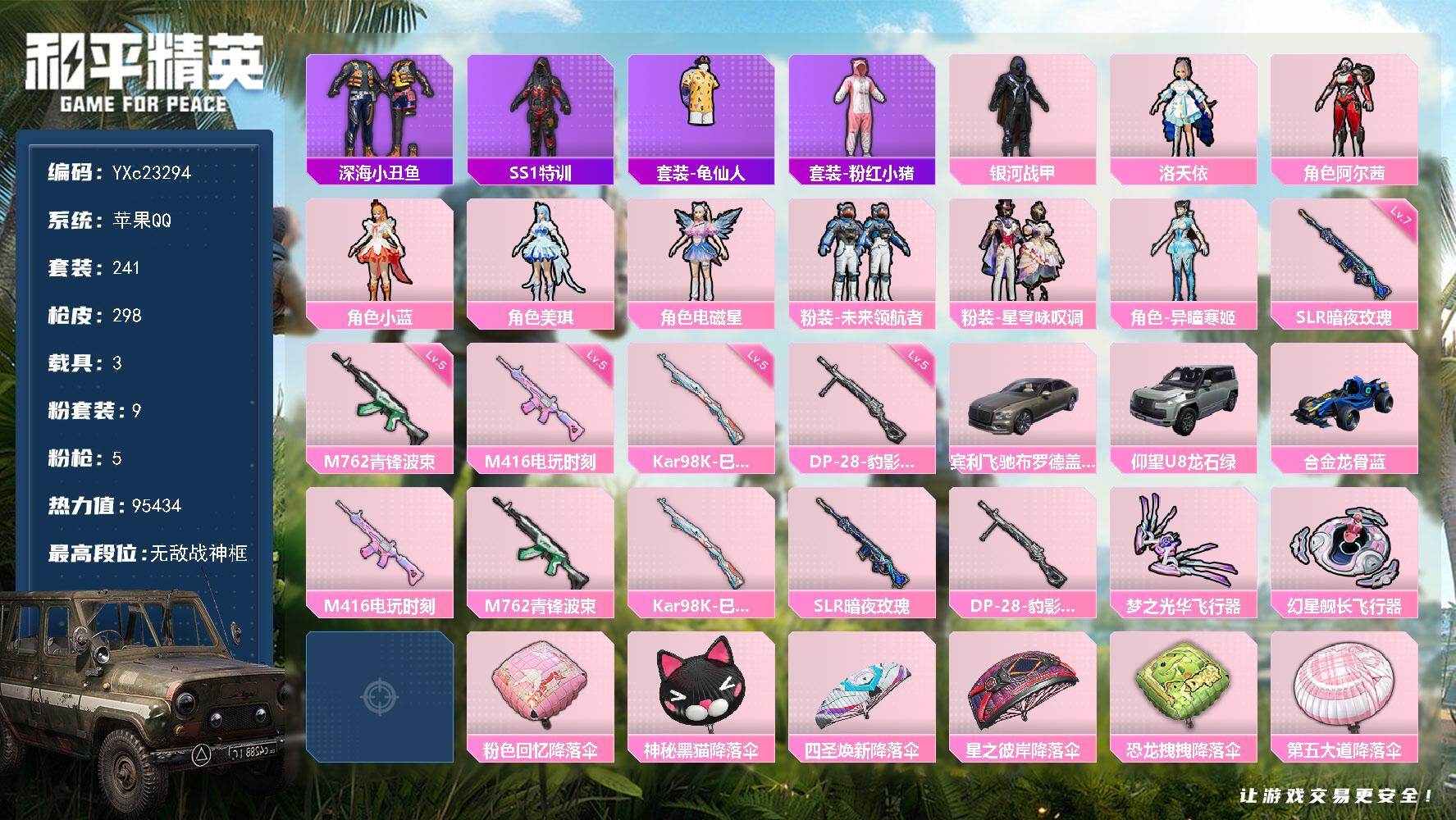 【469721】【可二次】【苹果QQ】合金龙骨蓝色 龟仙人 M762-青锋波束 梦之光华飞行器 洛天依 银河战甲 极速红龙 豚鼠丹丹 鹤发童颜 M762-奇异狩猎者 M416-电玩时刻 第五大道降落伞 浪漫假日 深海小丑鱼 瑞龙福将 迅捷之星 团圆交子 粉色回忆降落伞 SS1特训 仰望U8(龙石绿) M762-瑞龙福将 星之彼岸降落伞 四圣焕新降落伞 狂战萌兔 AKM-缤纷海域 粉红小猪 神秘黑