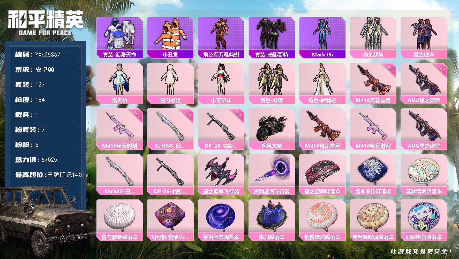 【470267】【不可二次】【安卓QQ】绚金战神 迅捷狂鲨 M24-奇异狩猎者 洛神天依降落伞 星之彼岸降落伞 洛天依 星之彼岸飞行器 狂沙舞者 M416-电玩时刻 筑梦精灵降落伞 M416-风花雪月 星之彼岸 AUG-星之彼岸 浪漫天命 暗影哥特 疾风龙骑