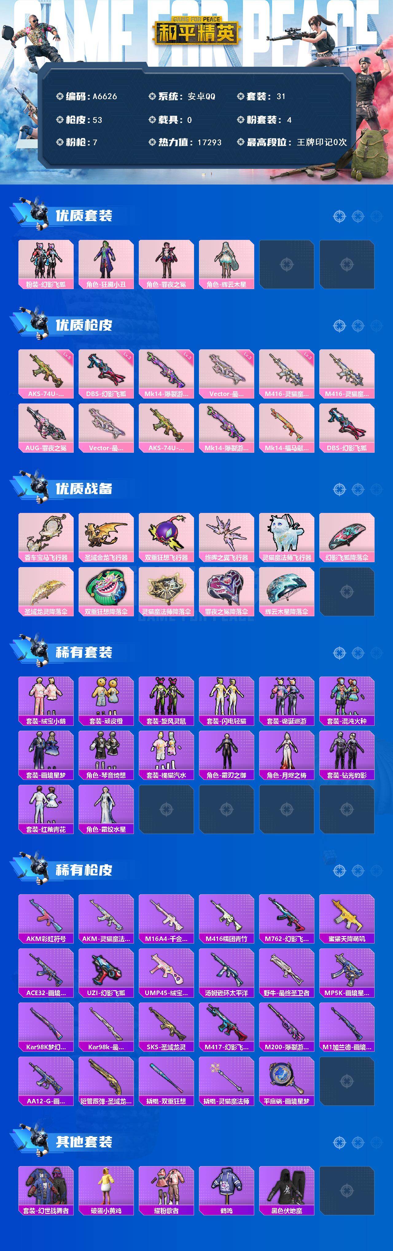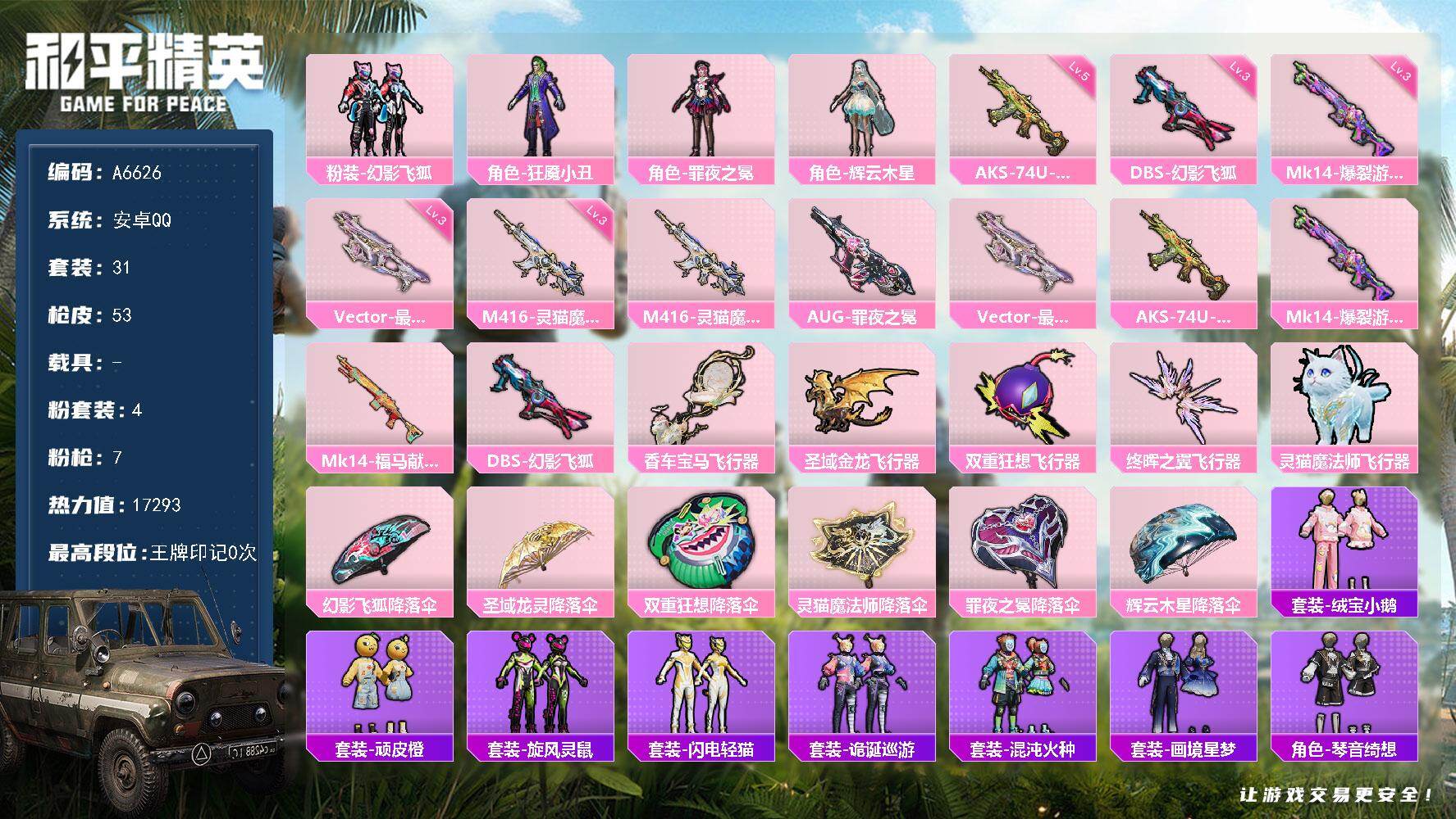 【471062】【A6626】安卓【品质号/2王牌印记/粉装-幻影飞狐/角色-狂魇小丑/角色-罪夜之冕/角色-辉云木星/M416-灵猫魔法师(三级)/Vector-最终圣卫者(三级)/AKS-74U-森灵之息(五级)/Mk14-爆裂游戏(三级)/DBS-幻影飞狐(三级)/4粉装-7特效枪-0载具-5粉色飞行器-17293热力值】 手Q-4粉装-7特效枪-0载具-5粉色飞行器-17293热力值-2