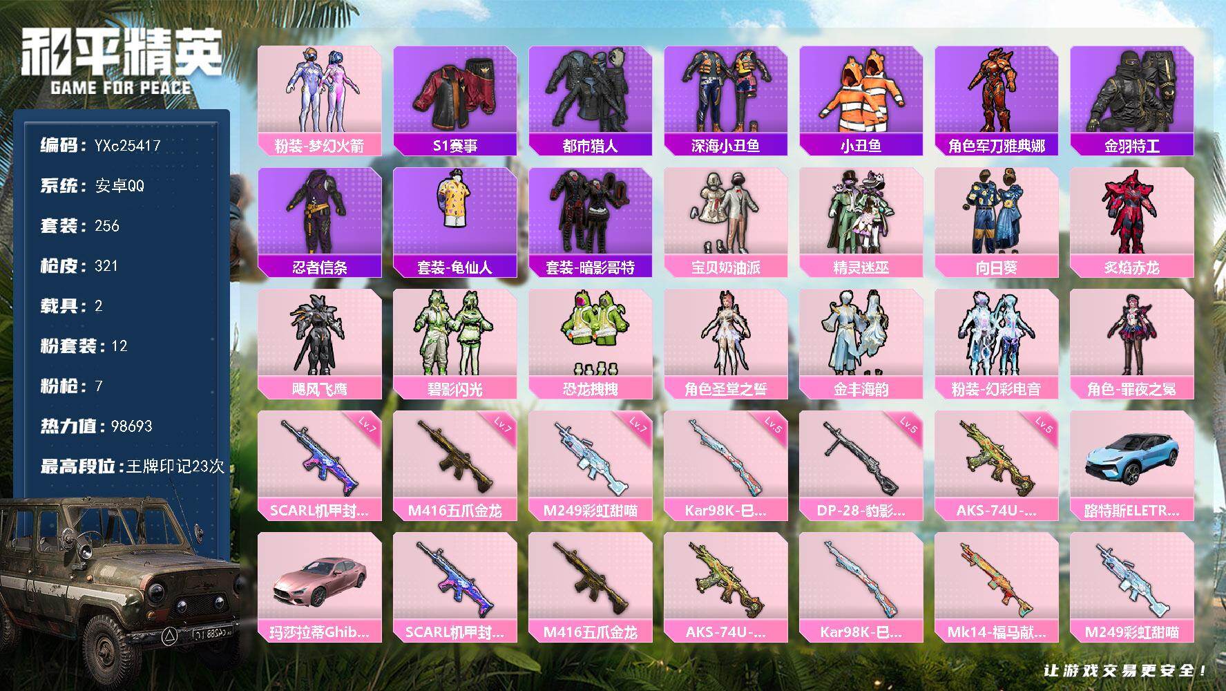 【471494】【不可二次】【安卓QQ】龟仙人 恐龙拽拽 春暖花开降落伞 大橘为重 漫步者 都市猎人 M249-古堡领主 精灵迷巫降落伞 忍者信条 深海小丑鱼 碧影闪光 五号元素 飓风飞鹰 迅捷狂鲨 蝎王蛇后 M762-瑞龙福将 齐天大圣飞行器 黑色刀锋 幻影战神降落伞 马卡龙降落伞 金羽特工 星之信仰降落伞 古战神甲降落伞 白月香洋装 神秘黑猫 静谧青瓷 路特斯EL蓝色 梦幻火箭降落伞 M41