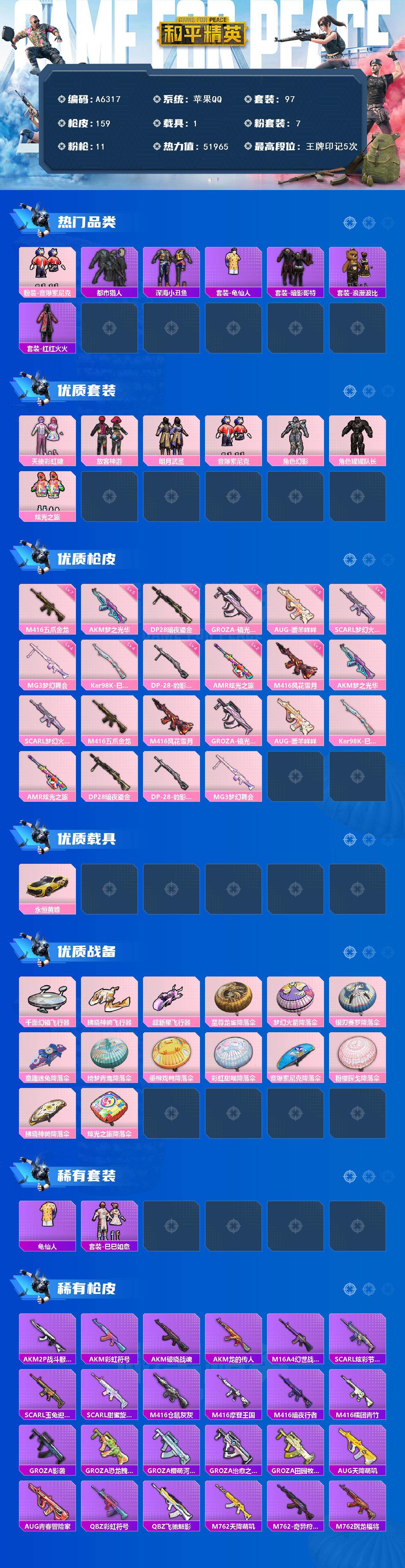 【472305】【可二次】【苹果QQ】龟仙人 梦幻火箭降落伞 M416-五爪金龙 漫步者 都市猎人 童趣迷兔降落伞 M762-奇异狩猎者 放客神游 恶魔人蛛 M416-仓鼠灰灰 街舞达人 深海小丑鱼 浪漫波比 银刃赛罗降落伞 MG3-梦幻舞会 迅捷之星 激萌罗小黑 垂柳戏鸭降落伞 绮梦青鸾降落伞 M762-瑞龙福将 千面幻镜飞行器 音爆索尼克 彩虹甜喵降落伞 摩登艾咪 至尊龙雀降落伞 音爆索尼克