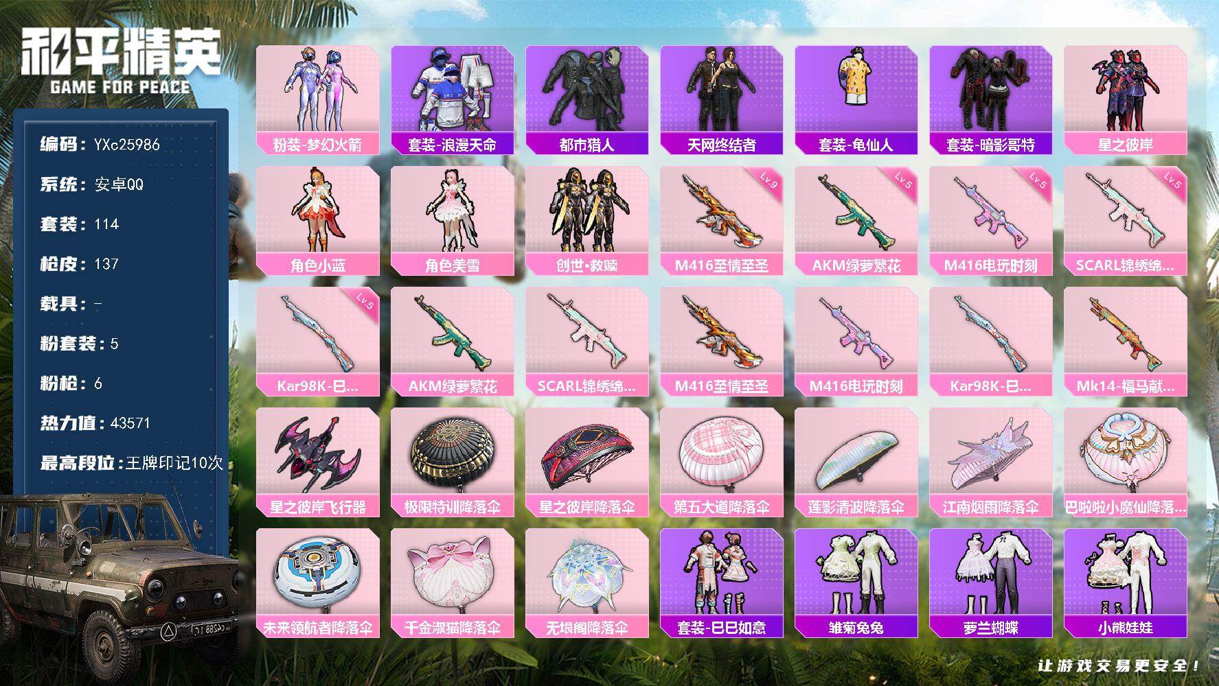 【477004】【不可二次】【安卓QQ】龟仙人 AKM-绿萝繁花 水银刺客 极限特训降落伞 漫步者 都市猎人 星之彼岸降落伞 星之彼岸飞行器 M416-电玩时刻 SCAR-L-锦绣绵绵 M416-至情至圣 第五大道降落伞 梦幻火箭 星之彼岸 狂战萌兔 浪漫天命 暗影哥特
