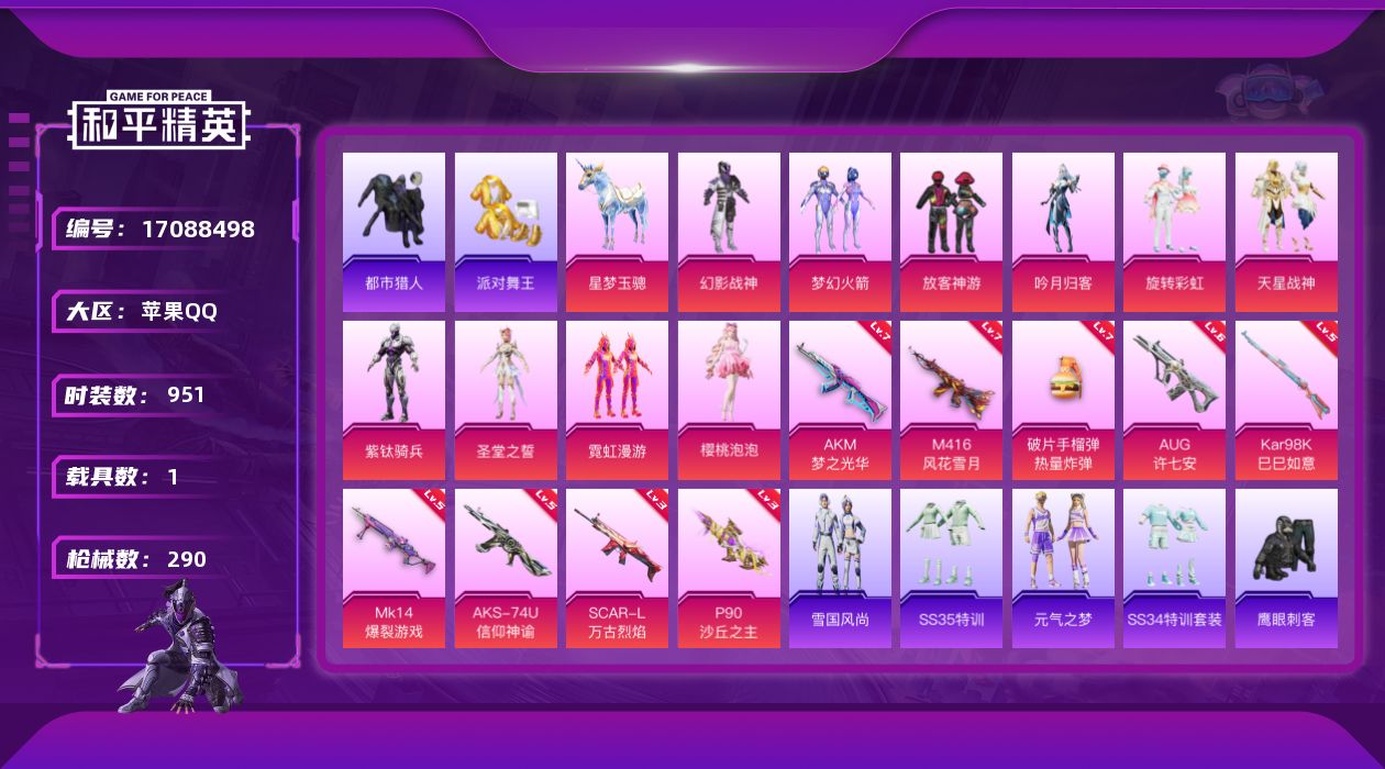【478639】【可二次】【苹果QQ】都市猎人 东方飞龙 极速红龙 放客神游 吟月归客 M416-风花雪月 梦幻火箭 AKM-梦之光华 浪漫假日 浪漫波比 幻影战神 瑞龙福将 团圆交子