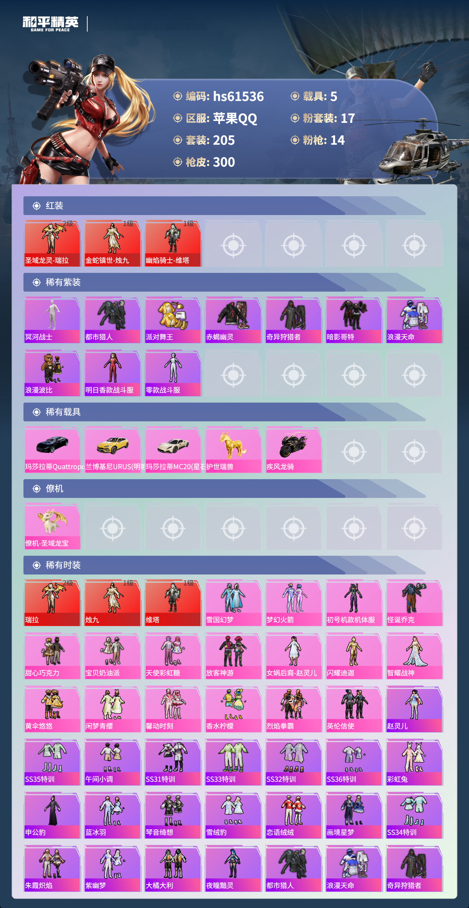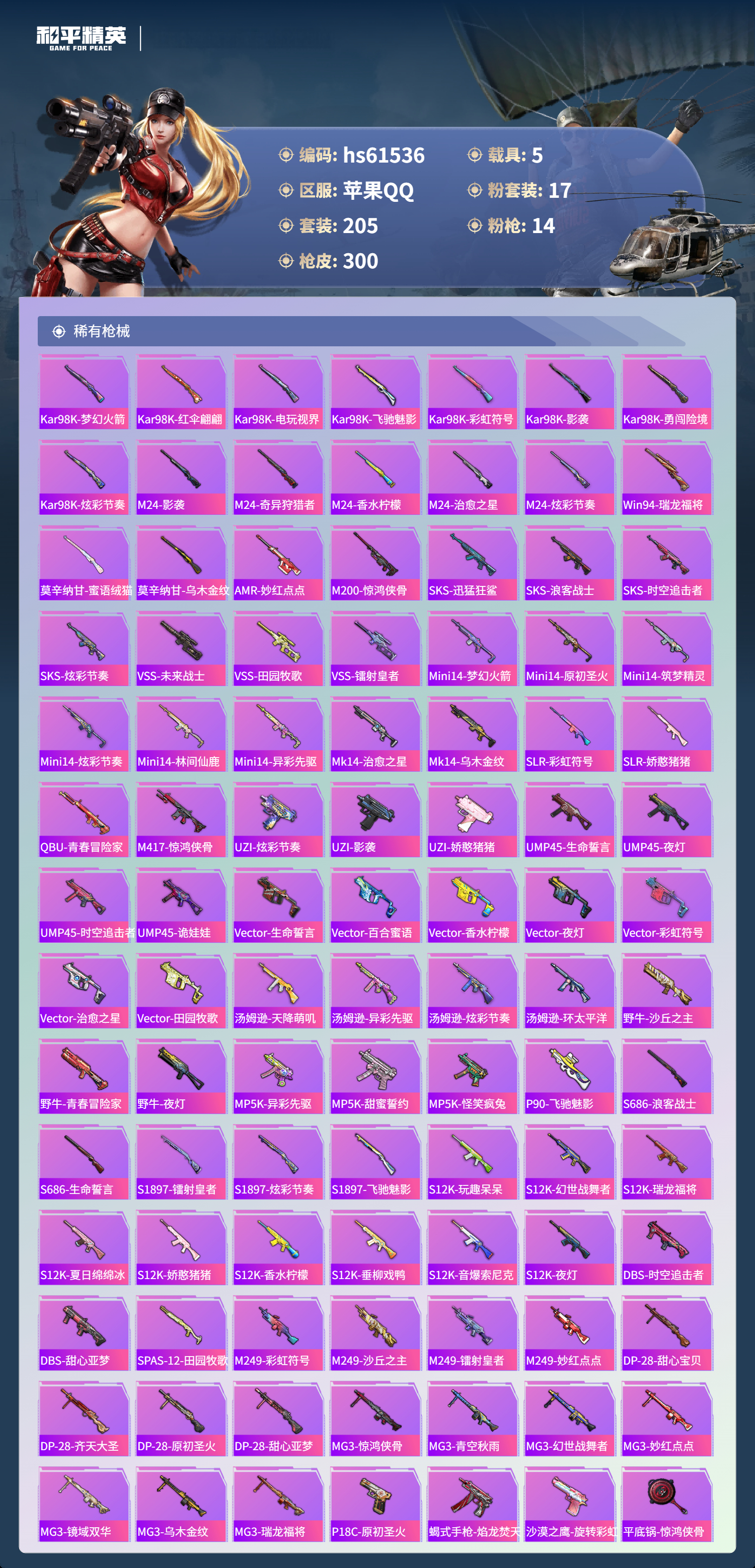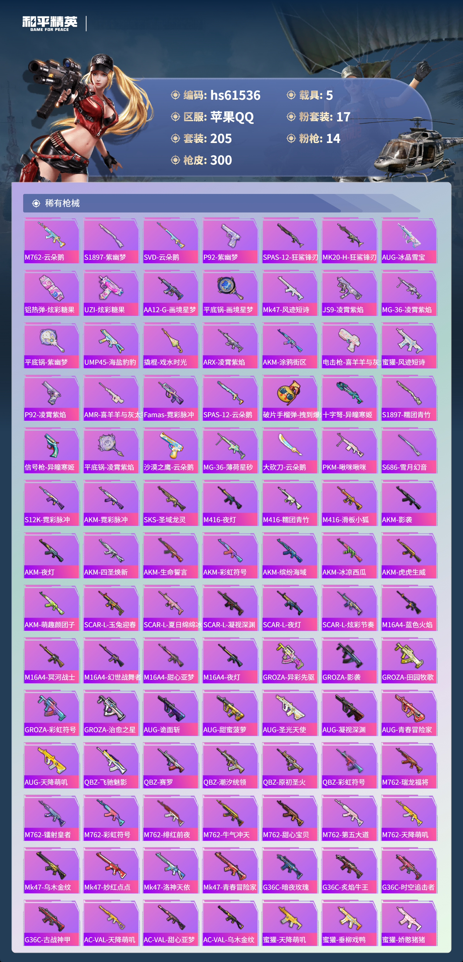 【479839】【可二次】【苹果QQ】M762-甜蜜誓约 漫步者 都市猎人 Mini14-林间仙鹿 浪漫波比 馨动时刻 醒狮腾龙 纯白誓言 M24-镜域双华 VSS-烈焰拳霸 怪诞乔克 M762-瑞龙福将 龙翔九天飞行器 兰博SUV黄色 AKM-炫紫旋律 香水柠檬 黄伞悠悠 静谧青瓷 疾风龙骑 木乃伊 雪国梦幻 迪迦奥特曼 M24-奇异狩猎者 金蛇镇世-烛九 赤蝎幽灵 放客神游 闪耀迪迦型 M2