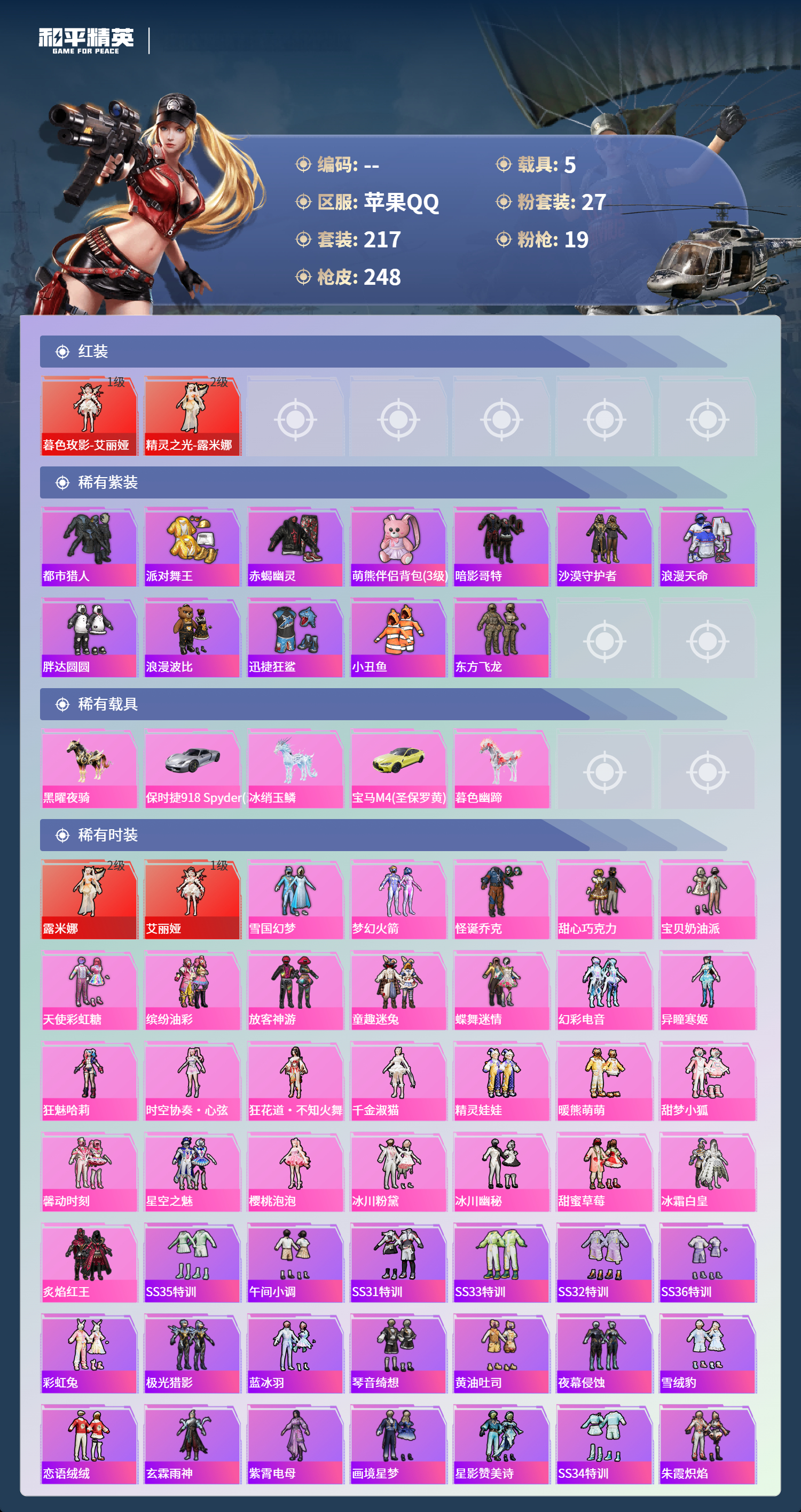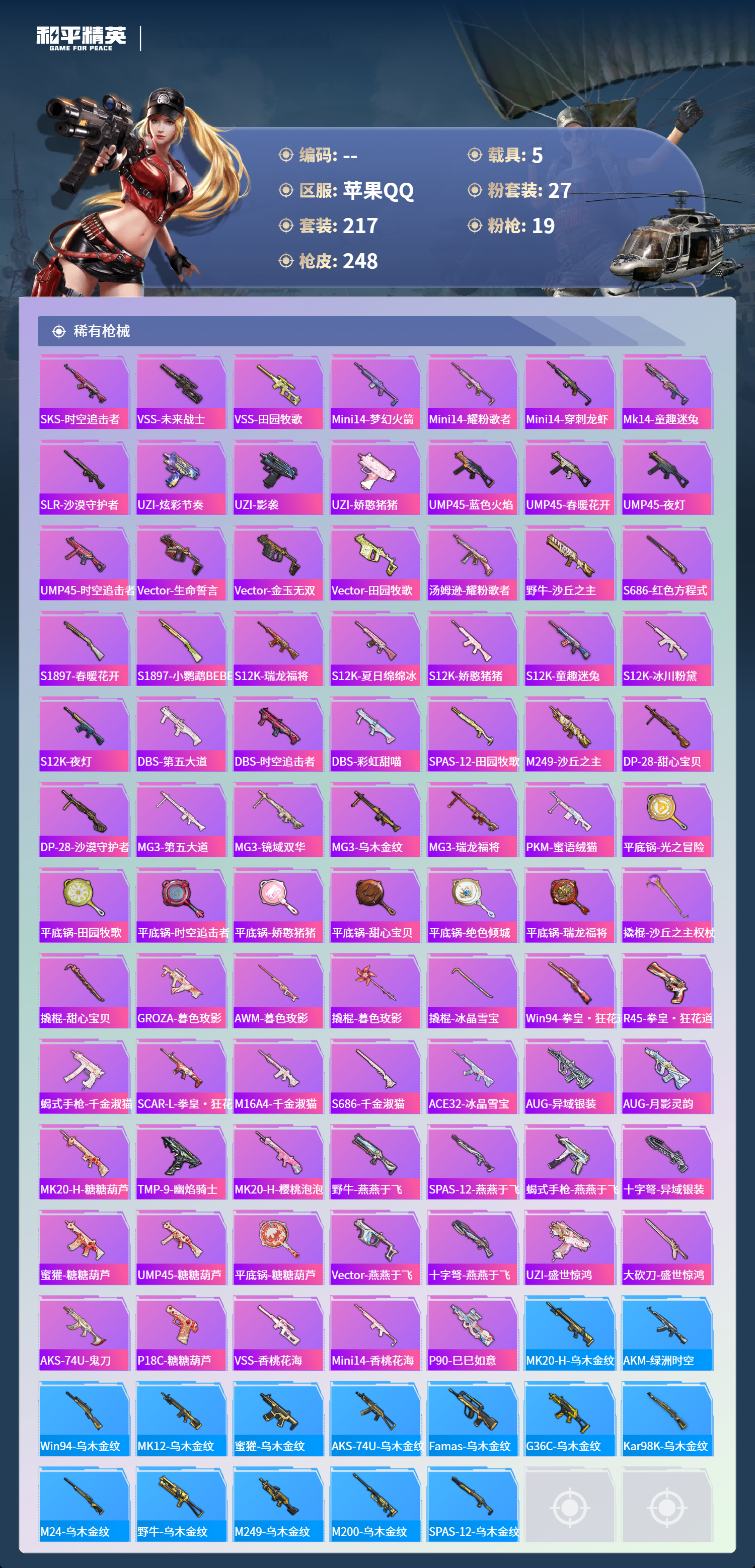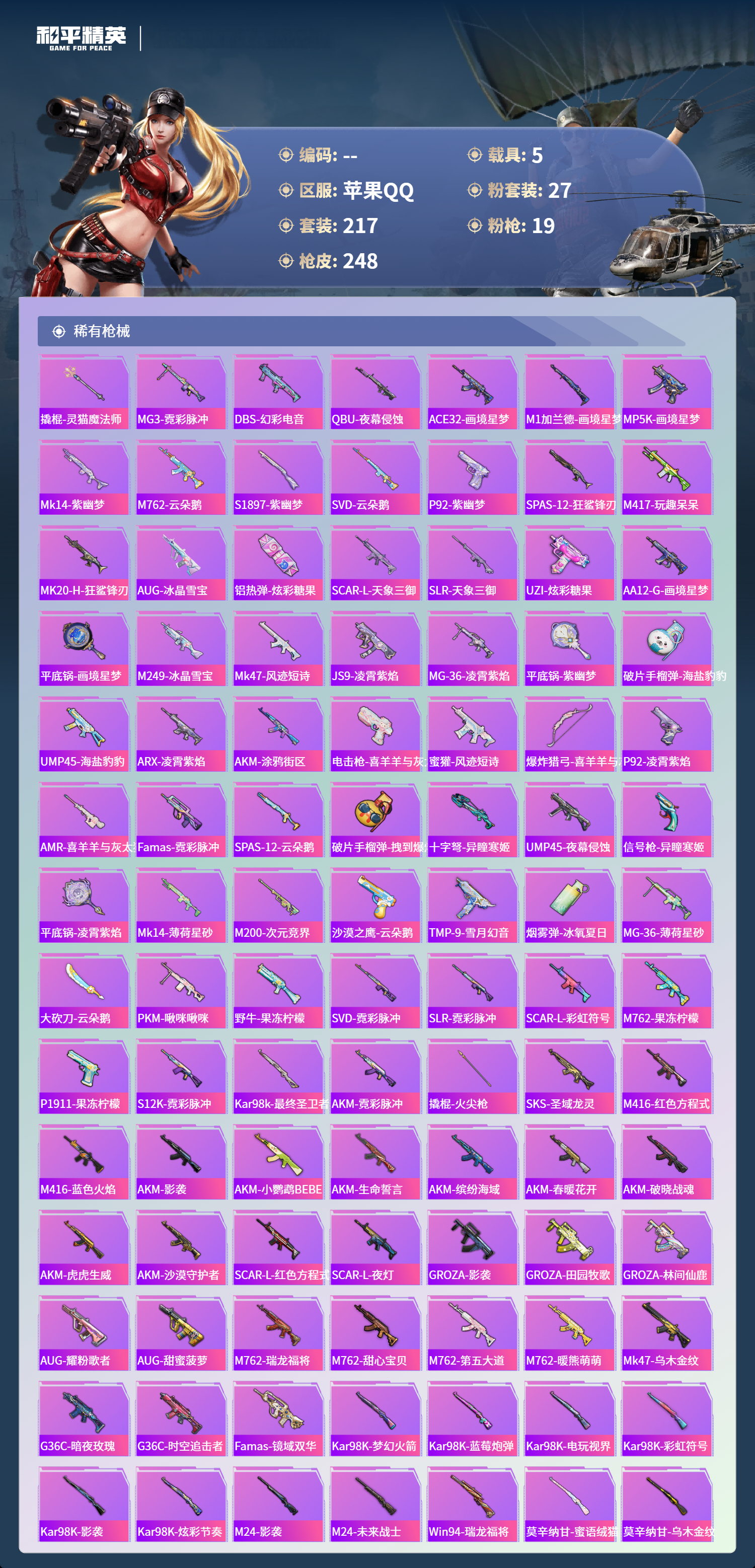 【480269】【不可二次】【苹果QQ】雪国梦幻 漫步者 P90-沙丘之主 都市猎人 炙焰红王 东方飞龙 极速红龙 赤蝎幽灵 精灵之光-露米娜 放客神游 星空之魅 仓鼠灰灰 GROZA-林间仙鹿 缤纷油彩 浪漫波比 馨动时刻 童趣迷兔 瑞龙福将 激萌小黄鸭 蝶舞迷情 软软马卡龙 沙漠守护者 浪漫天命 镜光幻境飞行翼 胖达圆圆 团圆交子 红熊茄茄 怪诞乔克 迅捷狂鲨 M762-瑞龙福将 潮萌小黄鸭