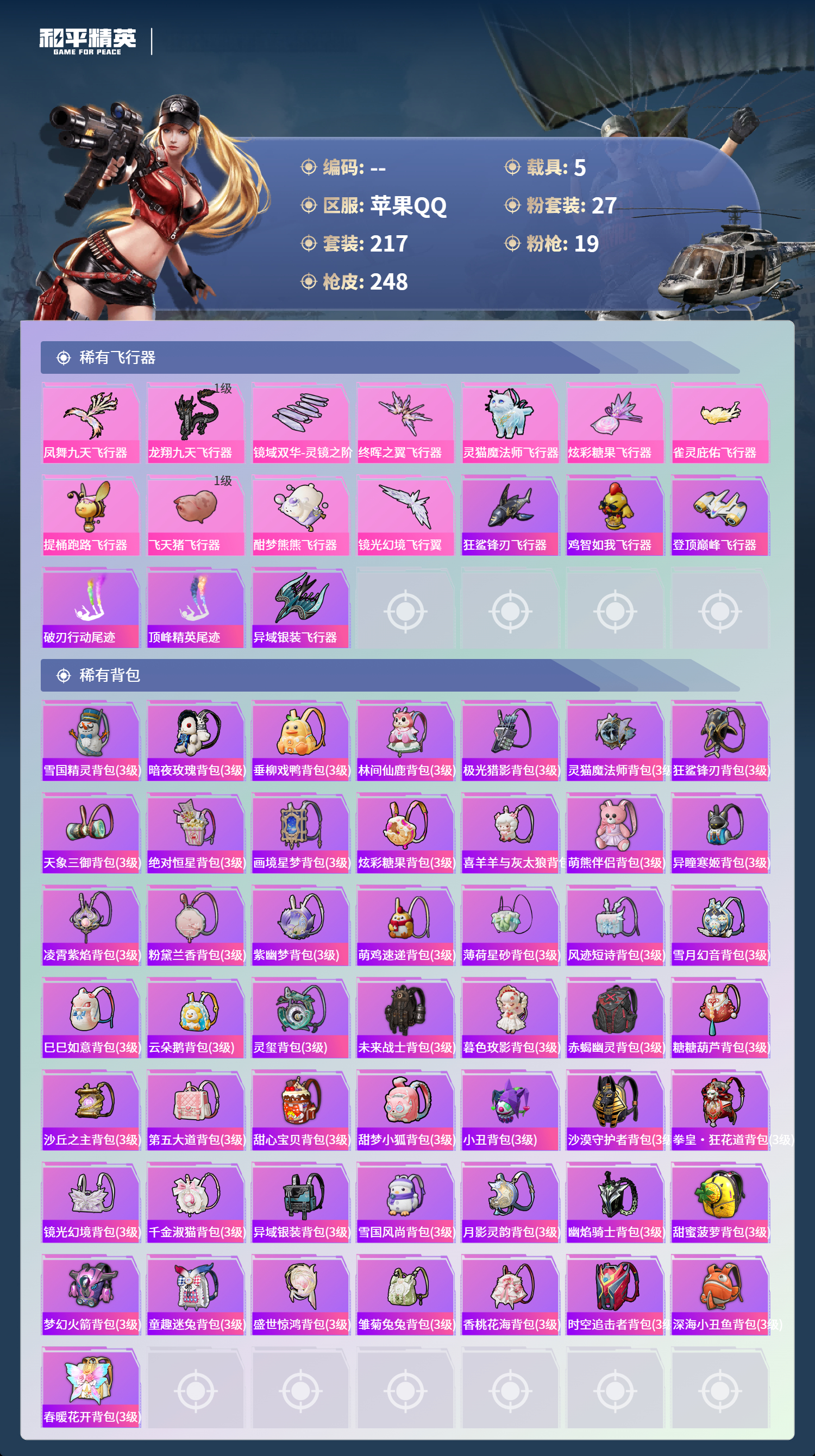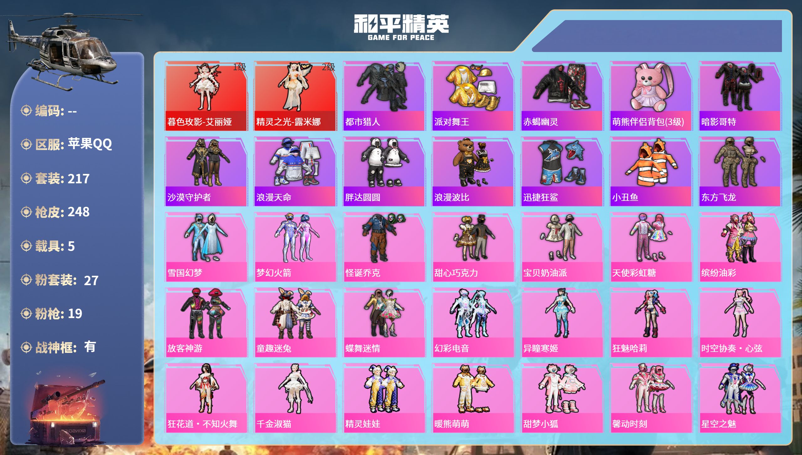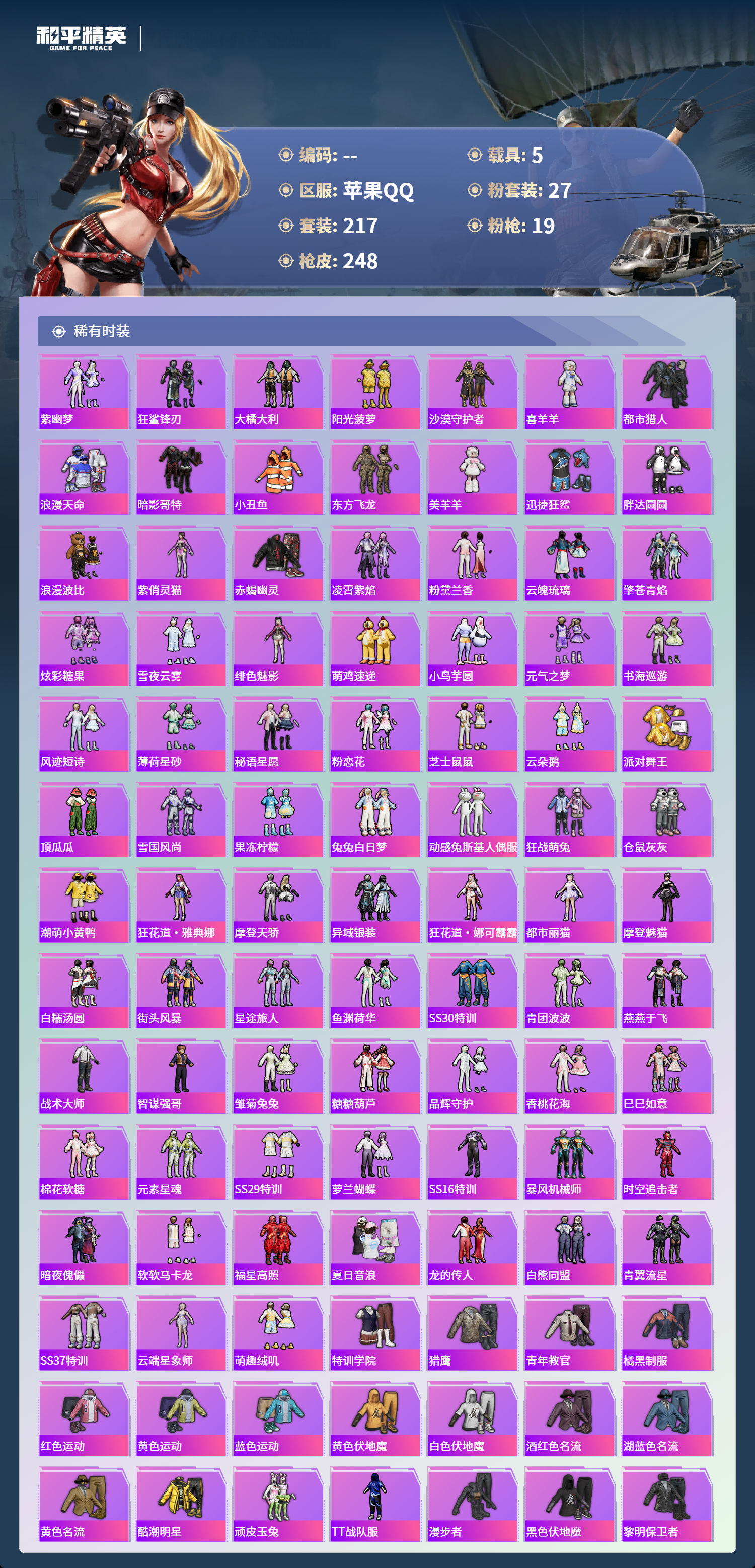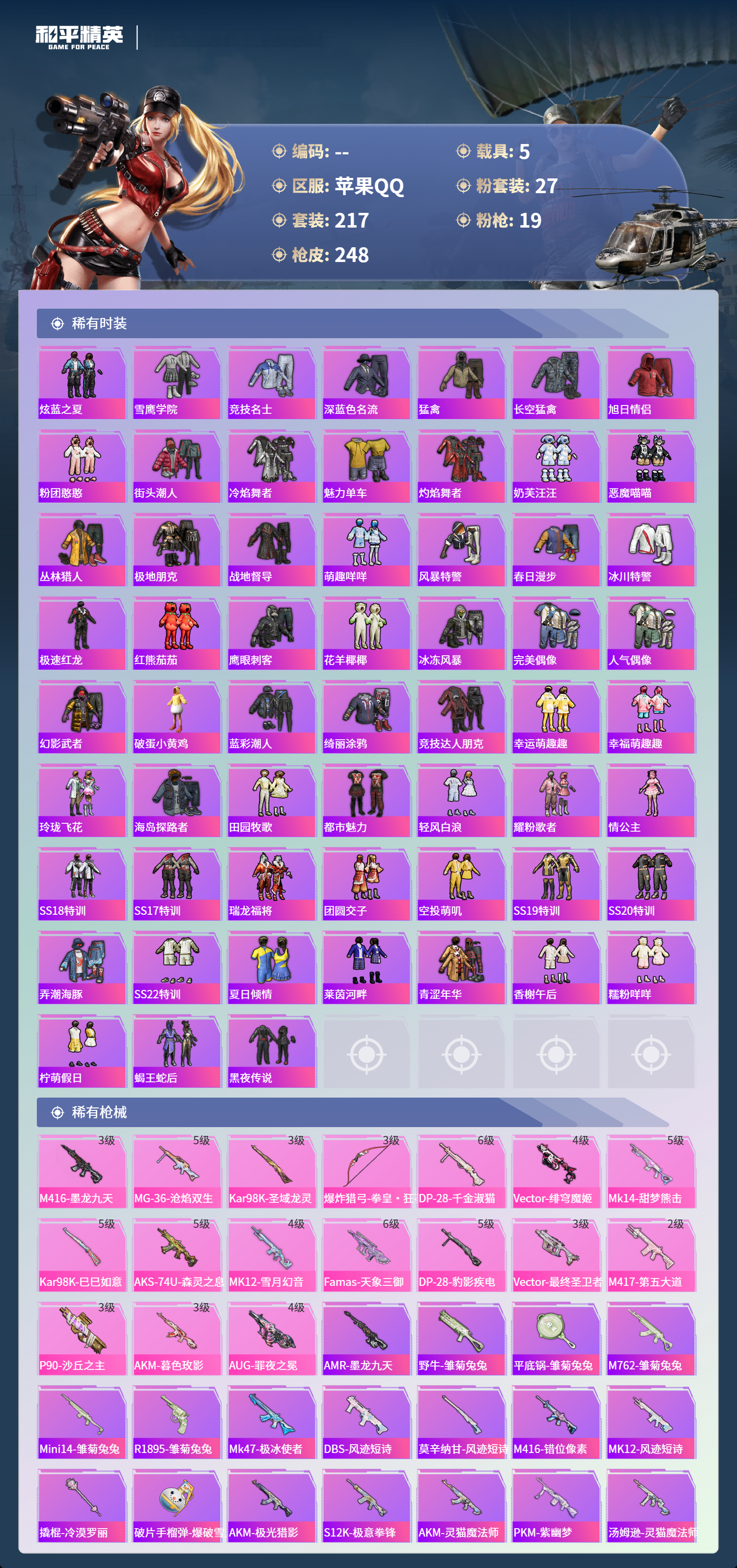 【480269】【不可二次】【苹果QQ】雪国梦幻 漫步者 P90-沙丘之主 都市猎人 炙焰红王 东方飞龙 极速红龙 赤蝎幽灵 精灵之光-露米娜 放客神游 星空之魅 仓鼠灰灰 GROZA-林间仙鹿 缤纷油彩 浪漫波比 馨动时刻 童趣迷兔 瑞龙福将 激萌小黄鸭 蝶舞迷情 软软马卡龙 沙漠守护者 浪漫天命 镜光幻境飞行翼 胖达圆圆 团圆交子 红熊茄茄 怪诞乔克 迅捷狂鲨 M762-瑞龙福将 潮萌小黄鸭