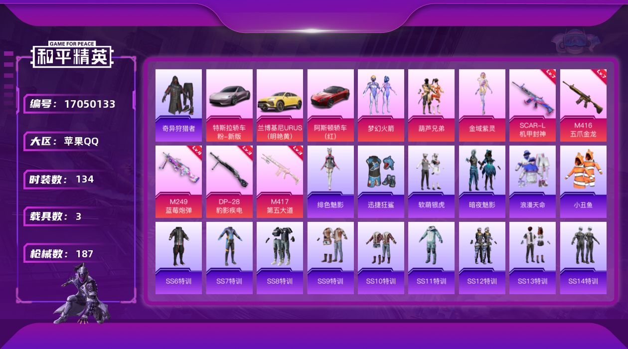【480943】【可二次】【苹果QQ】葫芦兄弟 梦幻火箭 M416-五爪金龙 阿斯顿马丁S红色 奇异狩猎者 M249-蓝莓炮弹 SCAR-机甲封神 M417射手步枪 特斯拉R沁心粉 兰博SUV黄色