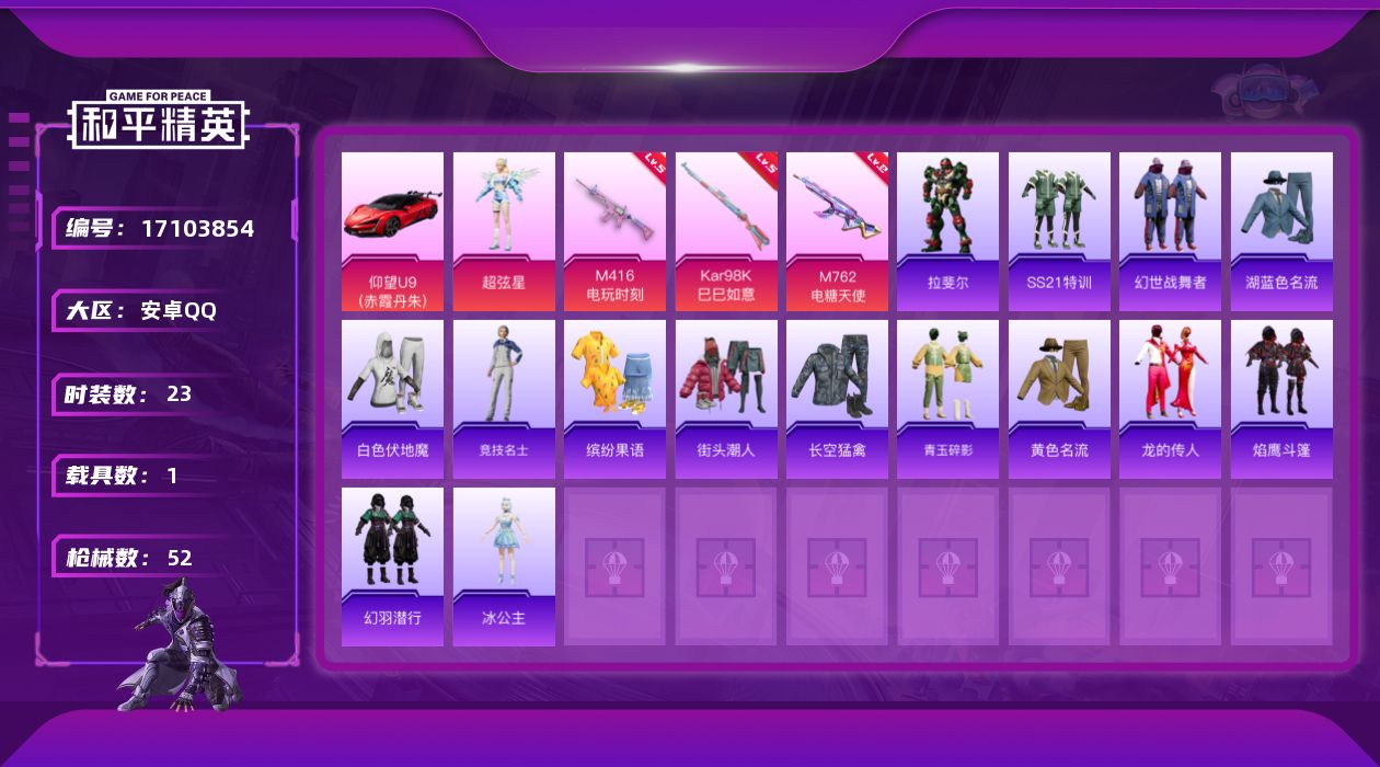 【481842】[17103854]安卓【仰望U9(赤霞丹朱/】 手Q-1粉装-3特效枪-1载具-2粉色飞行器-15461热力值-0王牌印记-23套装-52枪皮【粉色套装】:角色-超弦星【粉色枪皮等级】:M416-电玩时刻(五级),M762-电糖天使(二级),Kar98K-巳巳如意(五级)【粉色载具】:仰望U9(赤霞丹朱)【粉色枪皮】:M416-电玩时刻,M762-电糖天使,Kar98K-巳巳如