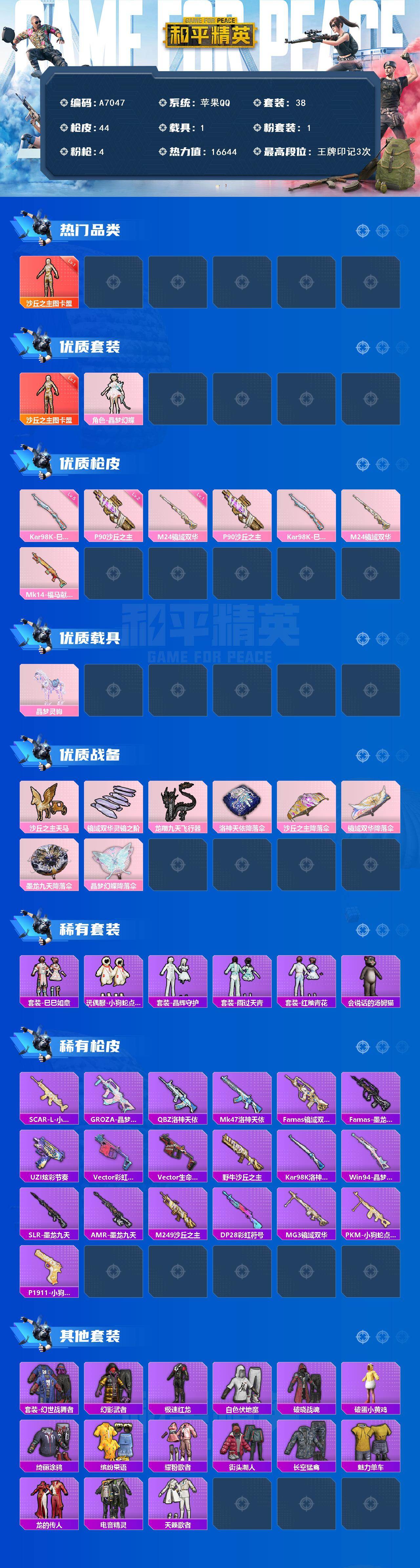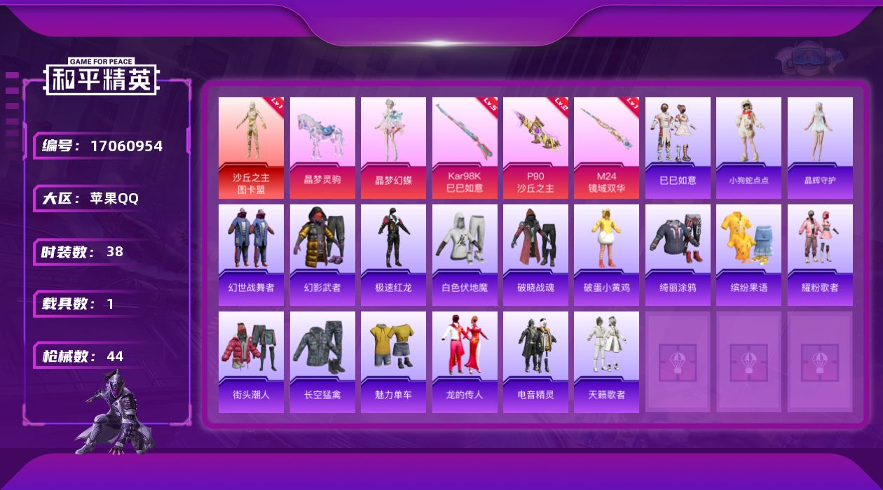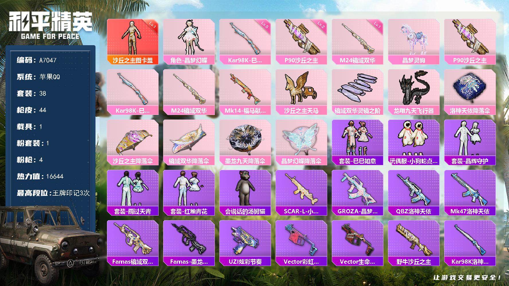 【482428】[17060954]苹果 【沙丘之主-图卡盟(一级)/晶梦灵驹】手Q-1神装-1粉装-4特效枪-1载具-3粉色飞行器-16644热力值-3王牌印记-38套装-44枪皮【红色神装等级】:【红色角色神装】:沙丘之主-图卡盟【粉色套装】:角色-晶梦幻蝶【粉色枪皮等级】:P90-沙丘之主(二级),Kar98K-巳巳如意(五级),M24-镜域双华(一级)【粉色载具】:【粉色枪皮】:P90-