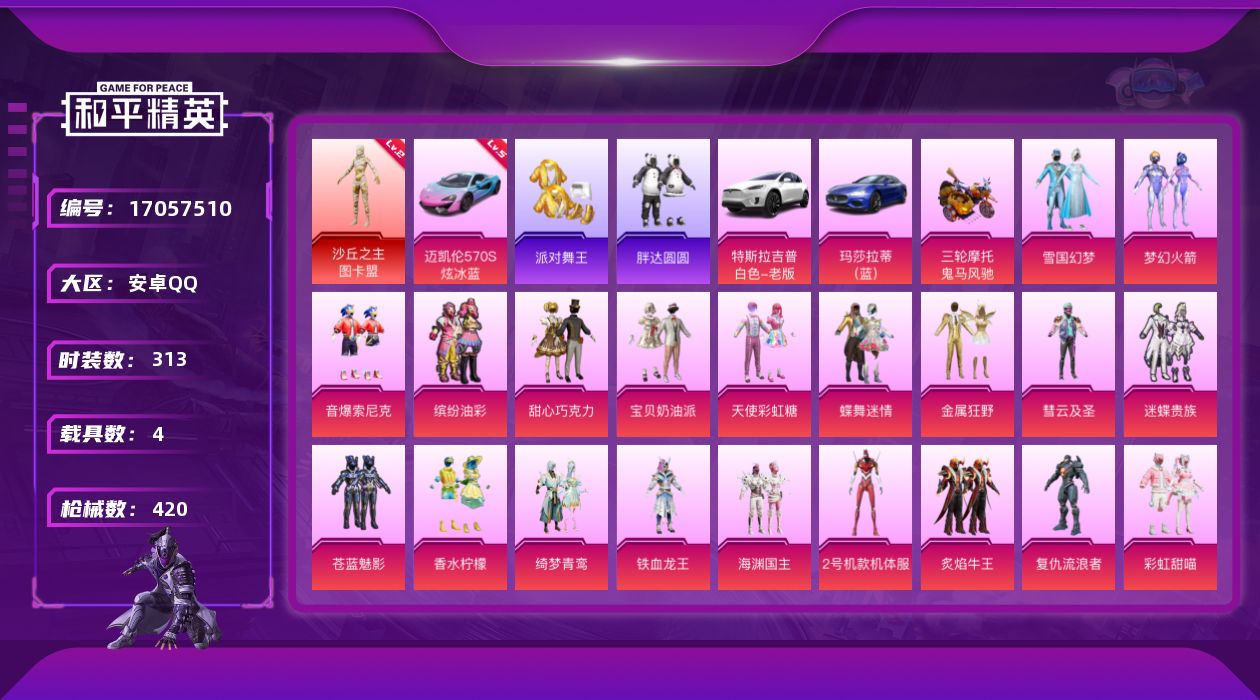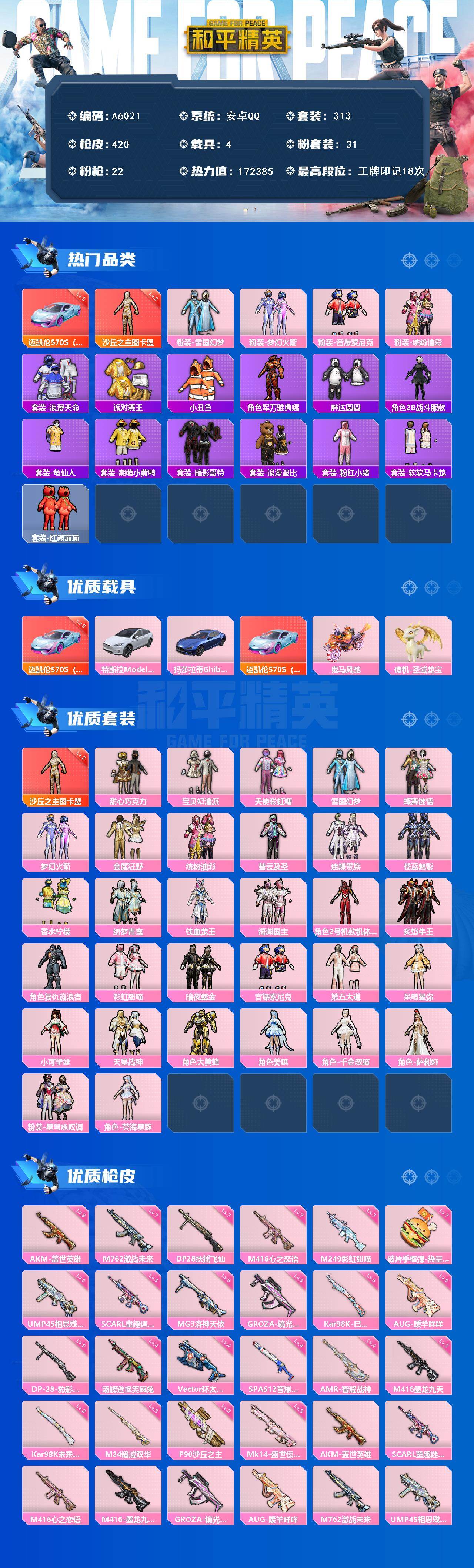【483986】【可二次】【安卓QQ】铁血龙王 雪国梦幻 迈凯伦570S 炫冰蓝 特斯拉X白色 金属狂野 M416-心之恋语 缤纷油彩 浪漫波比 SCAR-童趣迷兔 激萌小黄鸭 蝶舞迷情 慧云及圣 红熊茄茄 M762-激战未来 MG3-洛神天依 甜心巧克力 玛莎拉蒂蓝色 梦幻火箭 鬼马风驰 天使彩虹糖 汤姆逊-怪笑疯兔 UMP45-相思残雪 宝贝奶油派 海渊国主 红螳螂 暗影哥特