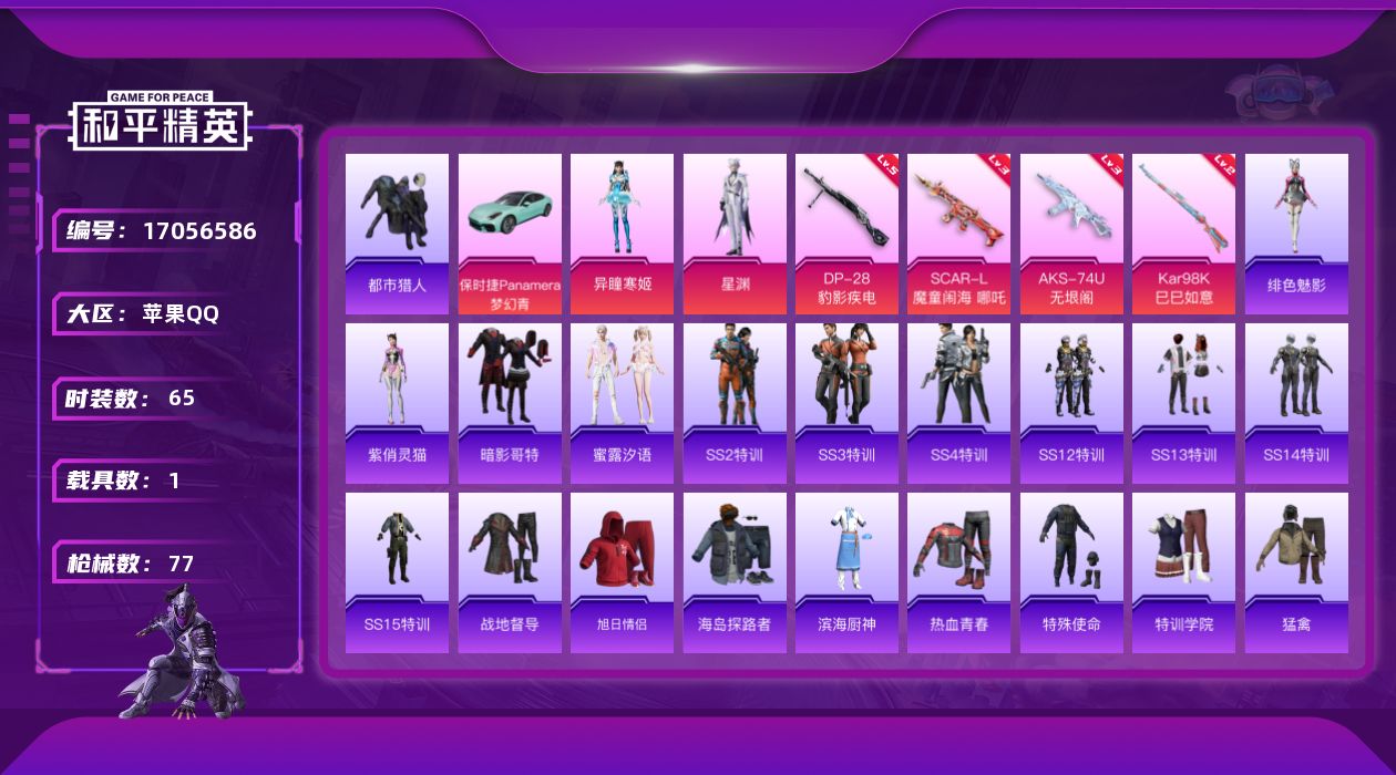 【484300】[17056586]苹果【男神号 套装-都市猎人/套装-暗影哥特/保时捷Panamera(梦幻青)/SCAR-L-魔童闹海 哪吒(三级)/AKS-74U-无垠阁(三级)】 手Q-2粉装-4特效枪-1载具-2粉色飞行器-26012热力值-3王牌印记-65套装-77枪皮【热门品类】:套装-都市猎人,套装-暗影哥特【粉色套装】:角色-星渊,角色-异瞳寒姬【粉色枪皮等级】:SCAR-L-