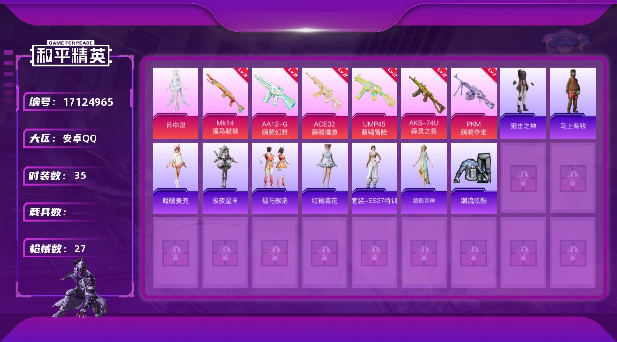 【484312】[17124965]月中灵!云朵驼驼飞行器!特权卡余300天!D11203.安卓QQ.10套装1粉装26枪皮6粉枪1飞行器.5735热力值. 【粉色套装】角色-月中灵 【粉色枪皮】Mk14-福马献瑞[3级]/ACE32-萌骑漫游[2级]/UMP45-萌骑冒险[2级]/AKS-74U-森灵之息[2级]/AA12-G-萌骑幻想[2级]/PKM-萌骑夺宝[1级]