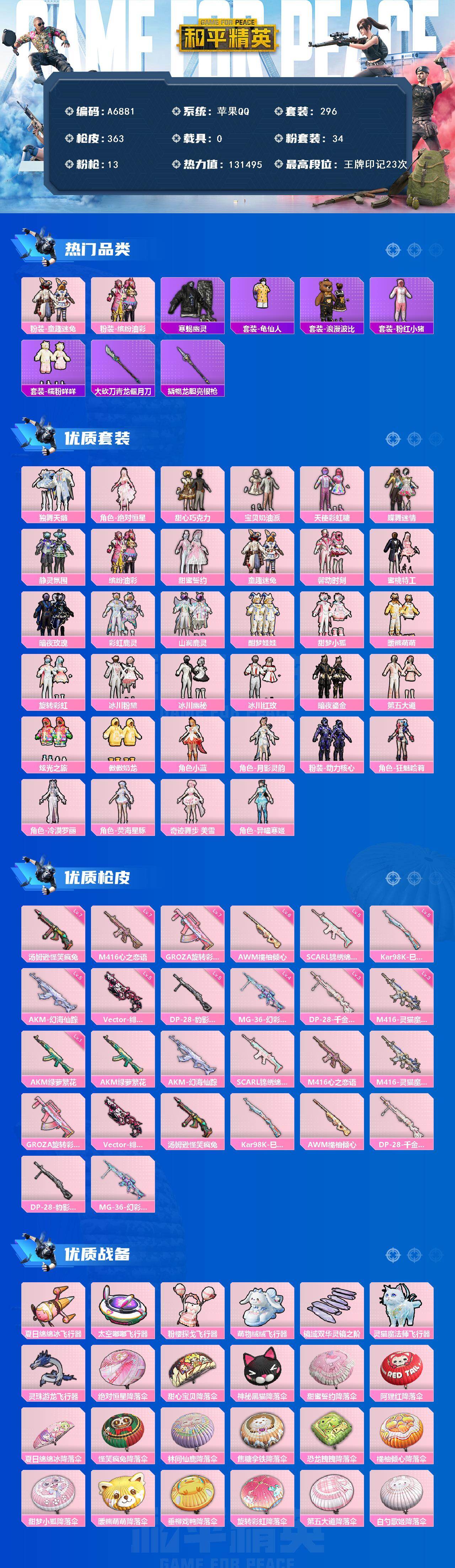 【491069】【可二次】【苹果QQ】酣梦娃娃 甜心巧克力 AWM-橘柚倾心 彩虹鹿灵 蜜桃特工 静灵氛围 暗夜玫瑰 M416-心之恋语 天使彩虹糖 缤纷油彩 汤姆逊-怪笑疯兔 浪漫波比 山涧鹿灵 宝贝奶油派 馨动时刻 蝶舞迷情 甜蜜誓约 独舞天鹅