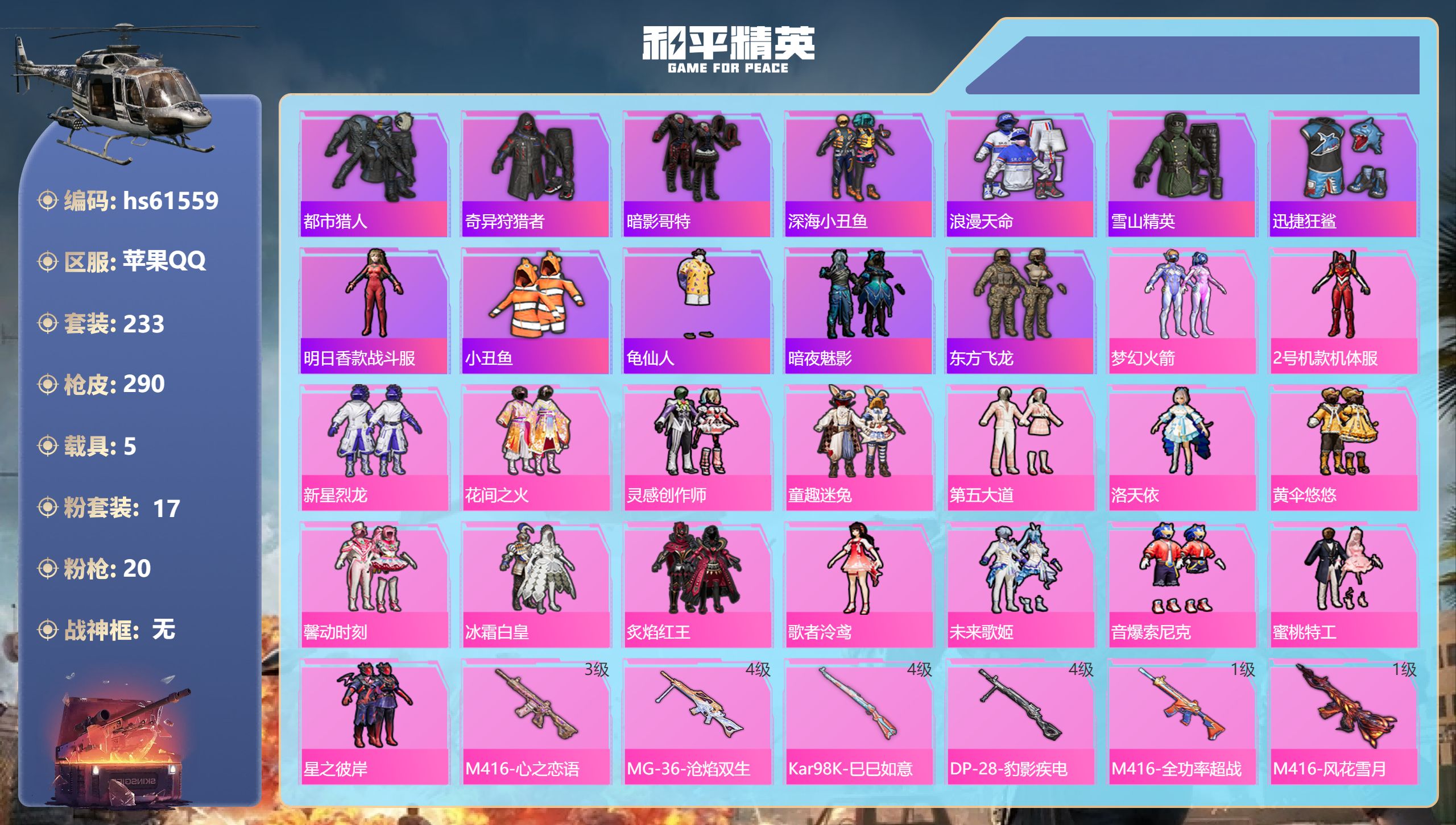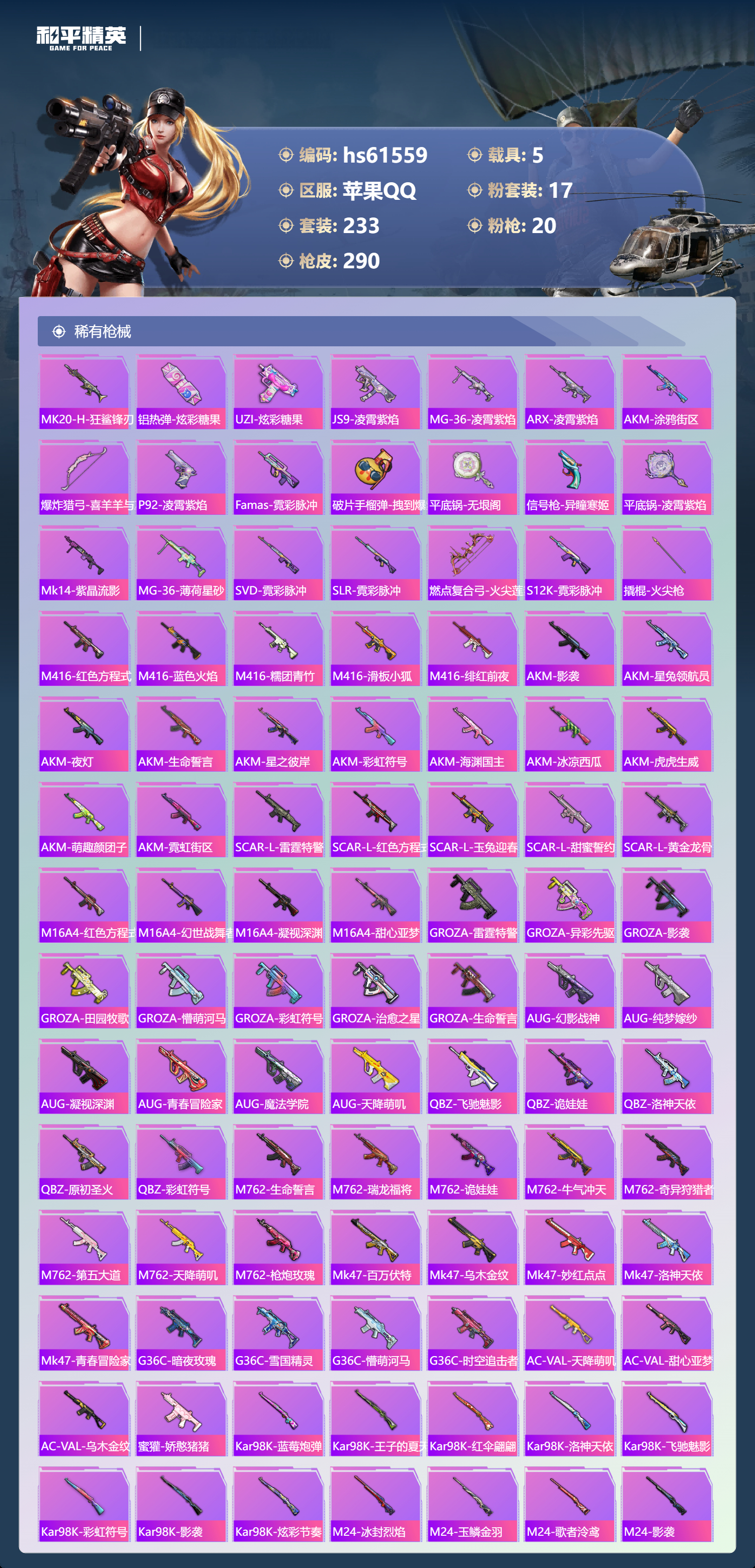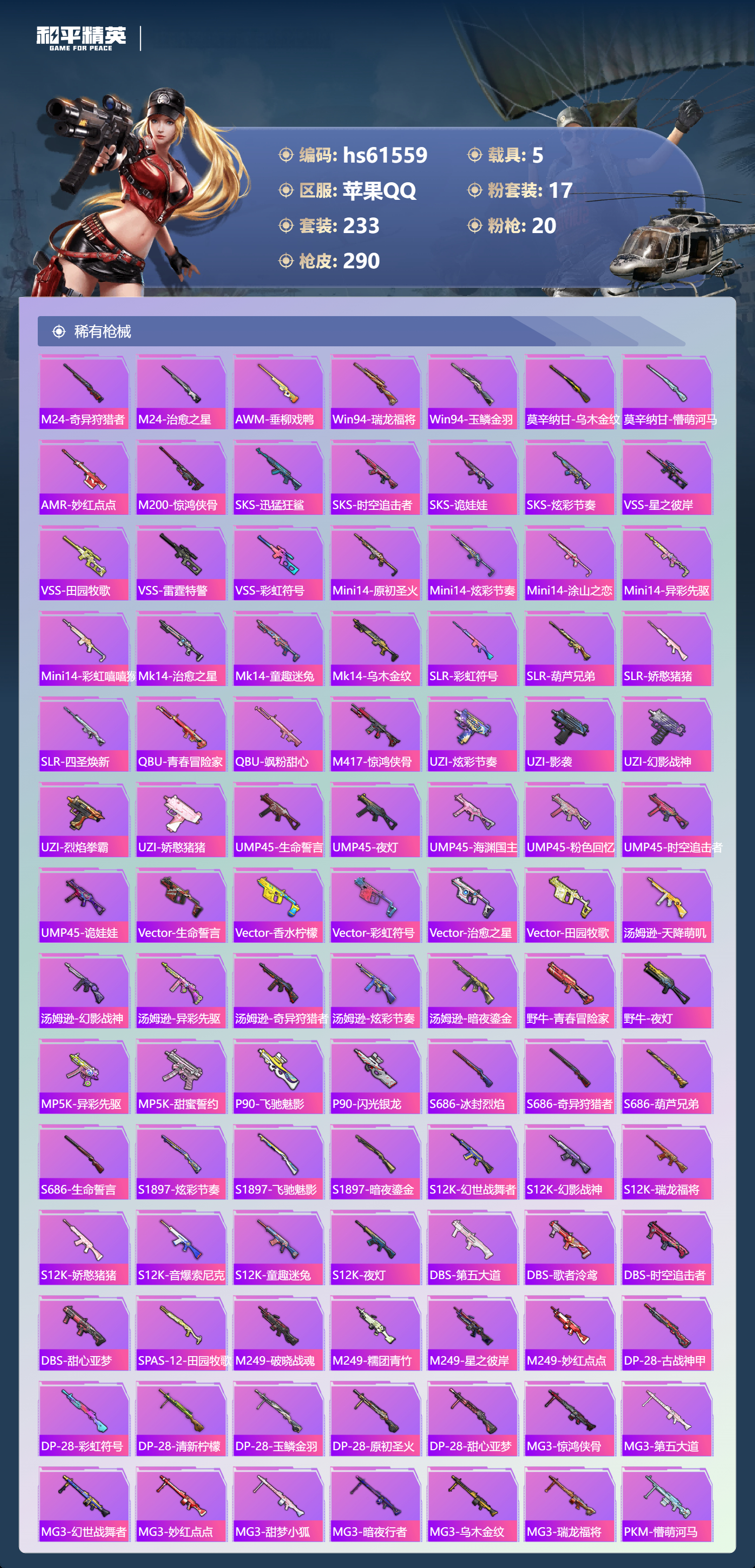 【491920】【不可二次】【苹果QQ】DP-28-枪炮玫瑰 M762-甜蜜誓约 龟仙人 漫步者 花间之火 都市猎人 步尔玛摩托车 M762-奇异狩猎者 M416-暖熊萌萌 M416-心之恋语 深海小丑鱼 馨动时刻 童趣迷兔 特斯拉R水滴蓝 AUG-星之彼岸 醒狮腾龙 纯白誓言 兰博SVJ绿色 迅捷狂鲨 M762-瑞龙福将 SCAR-机甲封神 M417射手步枪 狂沙舞者 音爆索尼克 M416-全
