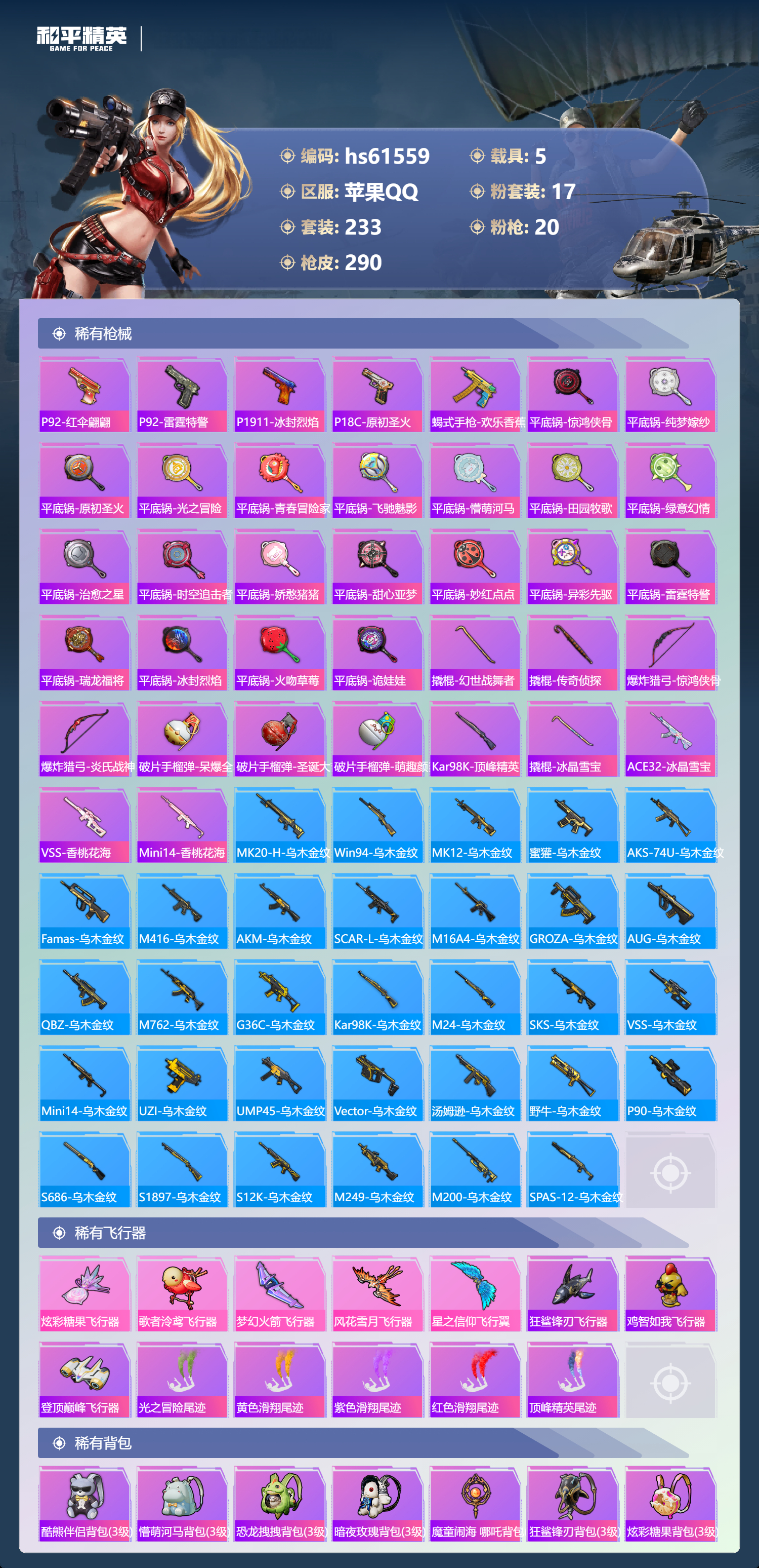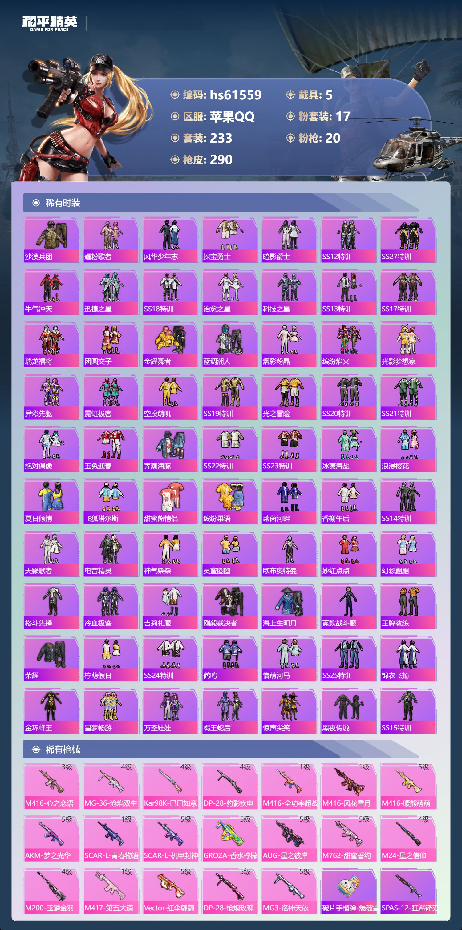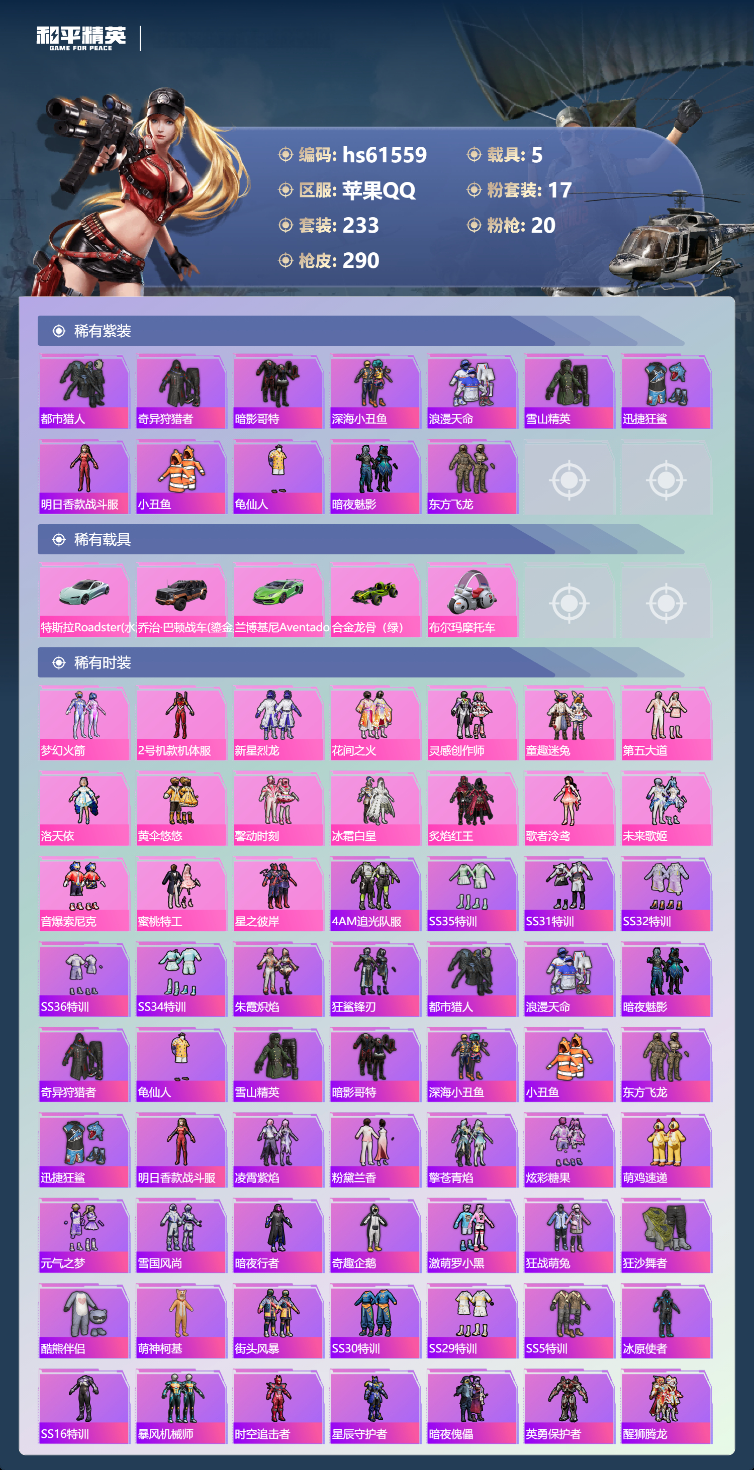 【491920】【不可二次】【苹果QQ】DP-28-枪炮玫瑰 M762-甜蜜誓约 龟仙人 漫步者 花间之火 都市猎人 步尔玛摩托车 M762-奇异狩猎者 M416-暖熊萌萌 M416-心之恋语 深海小丑鱼 馨动时刻 童趣迷兔 特斯拉R水滴蓝 AUG-星之彼岸 醒狮腾龙 纯白誓言 兰博SVJ绿色 迅捷狂鲨 M762-瑞龙福将 SCAR-机甲封神 M417射手步枪 狂沙舞者 音爆索尼克 M416-全