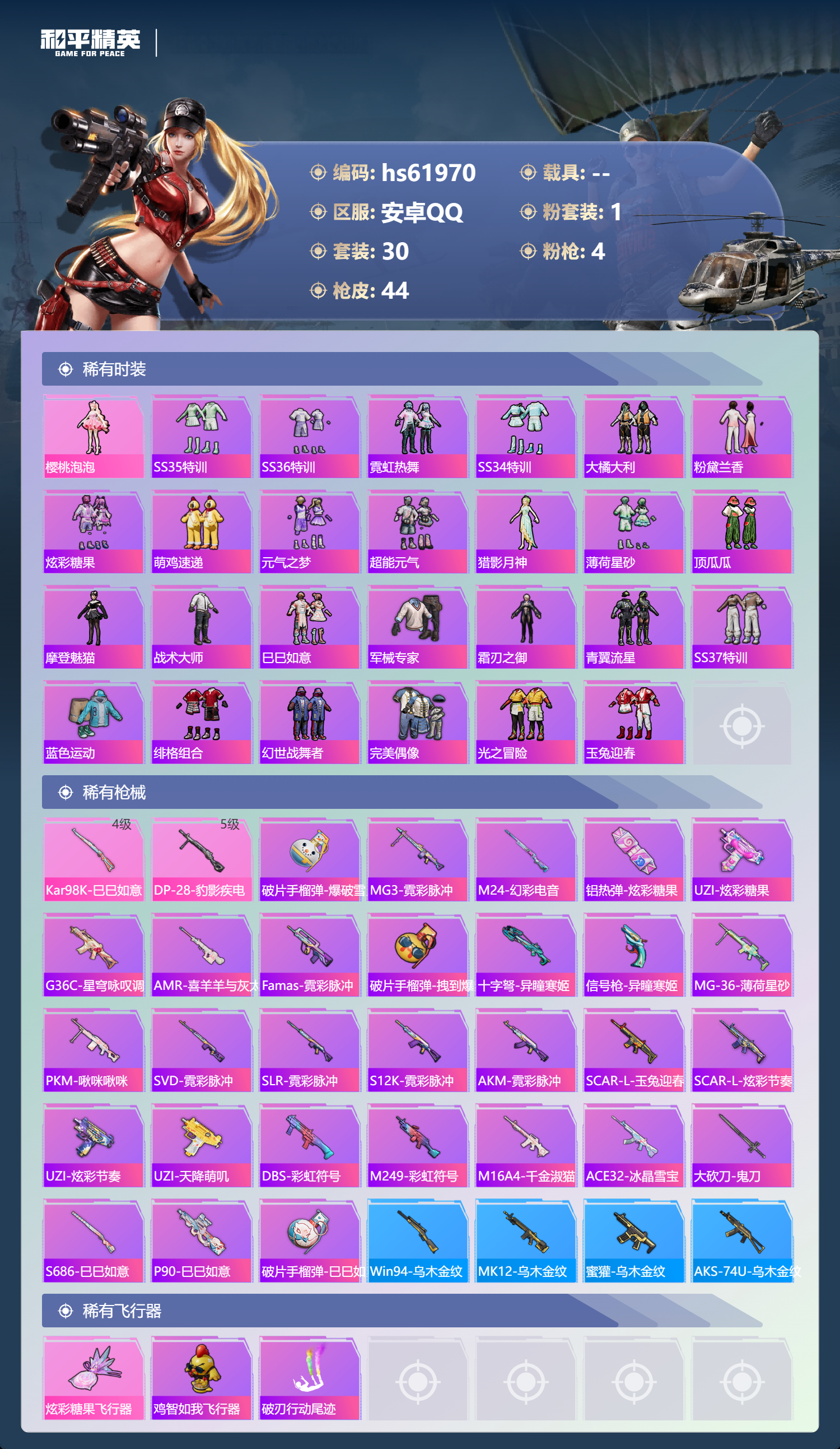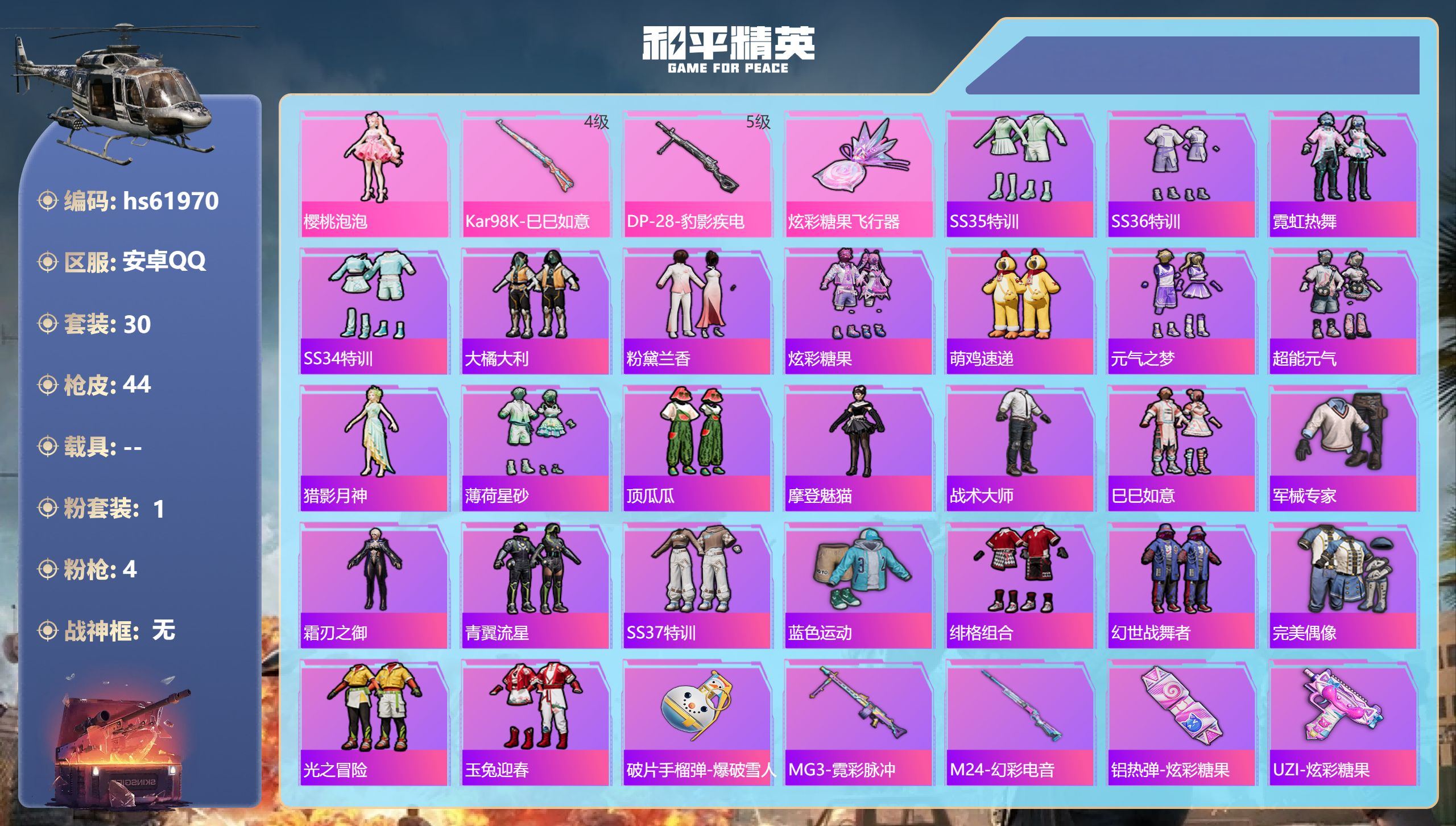 【492194】[17171143]【特价出售】安卓Q-1粉装2特效枪30套装44枪皮 12106热力值 1印记 历史超级王牌 【1粉装】 樱桃泡泡 【2特效枪】 Kar98K-巳巳如意 (4级) DP-28-豹影疾电 (5级)
