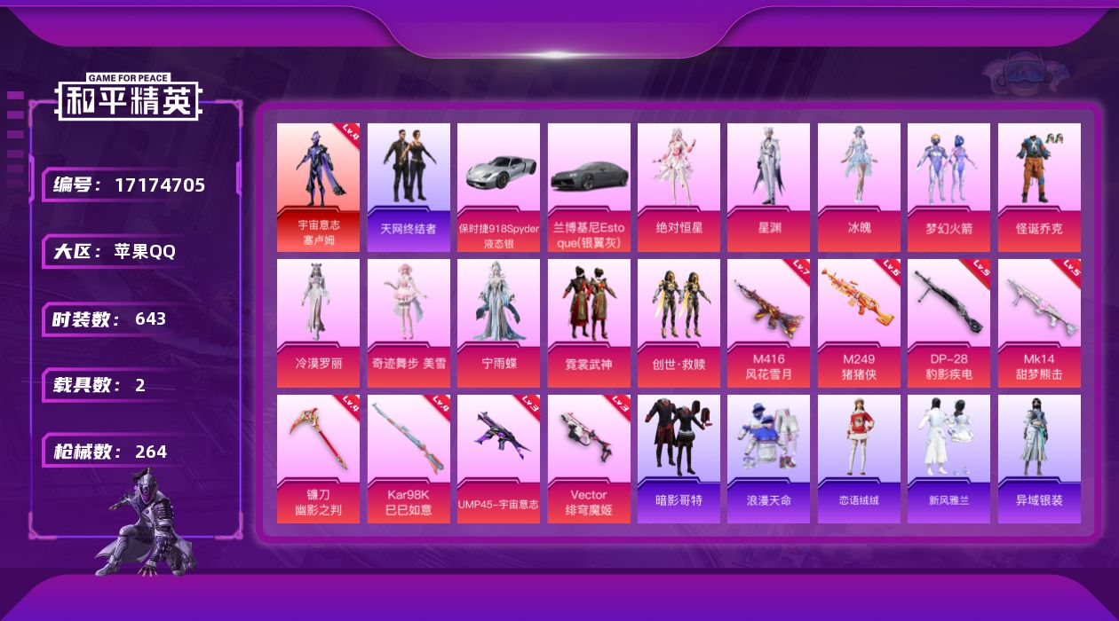 【492587】【可二次】【苹果QQ】龟仙人 怪诞乔克 M762-瑞龙福将 东方飞龙 UMP45-宇宙意志 兰博轿车灰色 极速红龙 豚鼠丹丹 宇宙意志-塞卢姆 庄周梦蝶飞行器 M416-风花雪月 梦幻火箭 浪漫波比 瑞龙福将 M249-猪猪侠 浪漫天命 暗影哥特 团圆交子