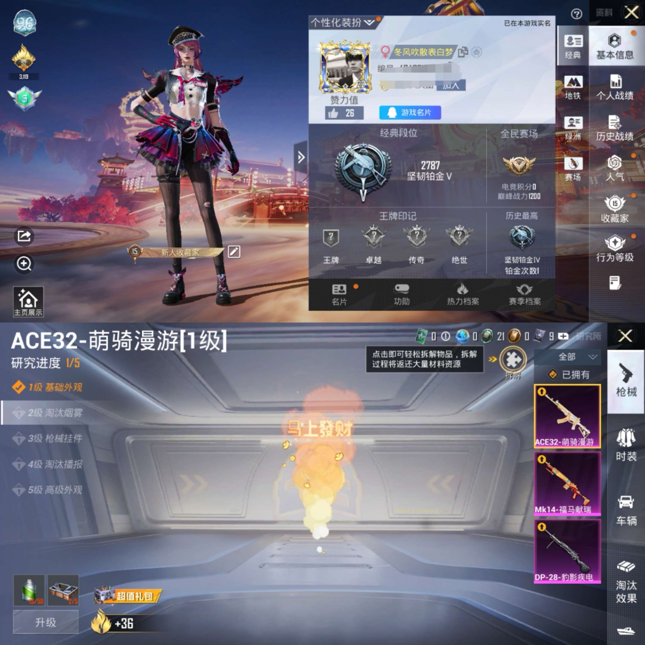 【493381】【1粉装】 角色-罪夜之冕 【3特效枪】 ACE32-萌骑漫游 1级 Mk14-福马献瑞 4级 DP-28-豹影疾电 2级 【热门】 马上有钱 红釉青花 画境星梦 狙击之神 玲珑侠影 鹰眼刺客 有二次 安卓Q-段位铂金 22级 23套装32枪皮