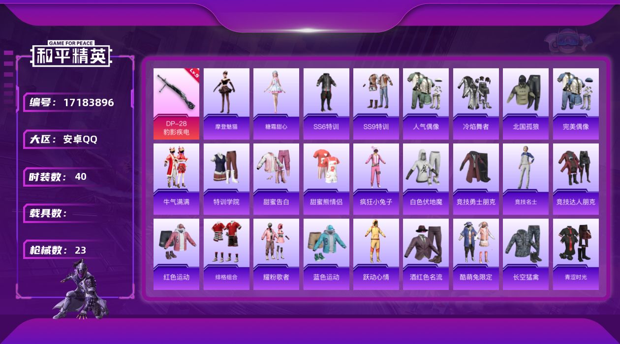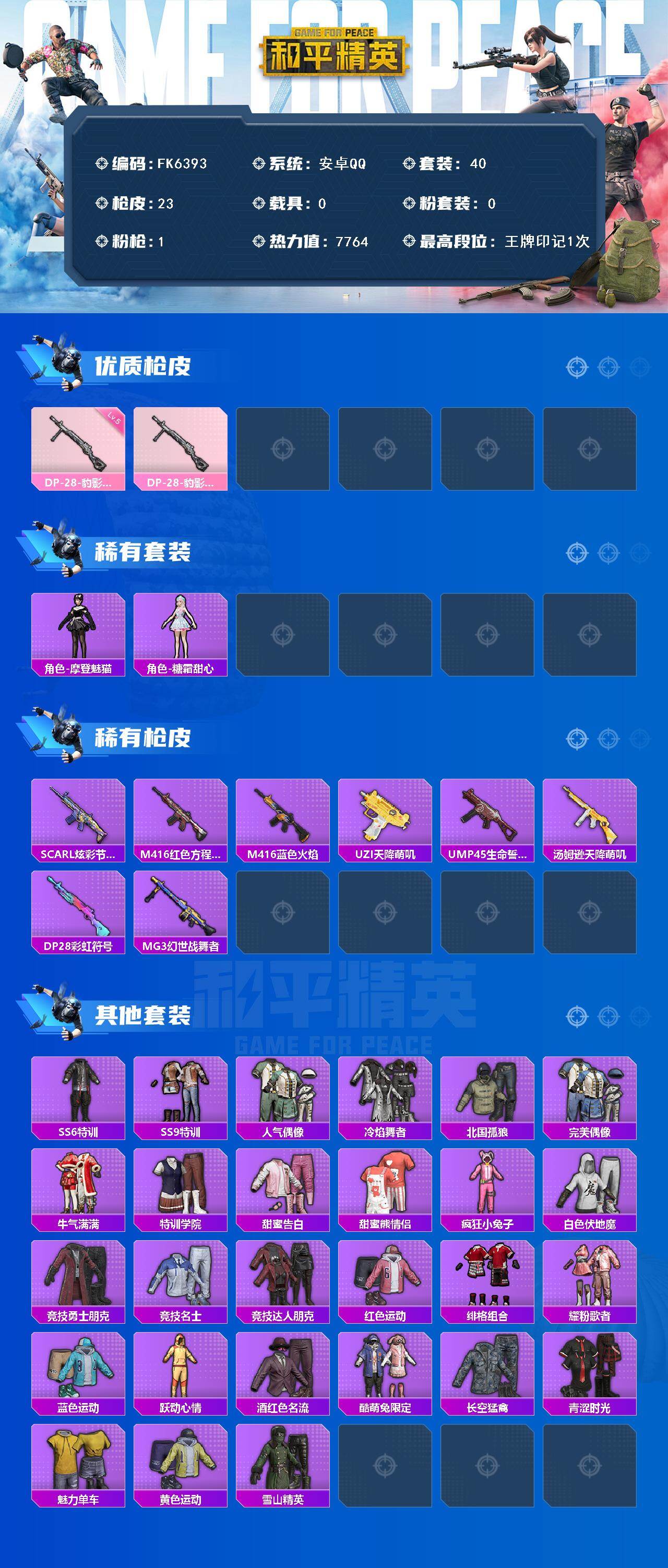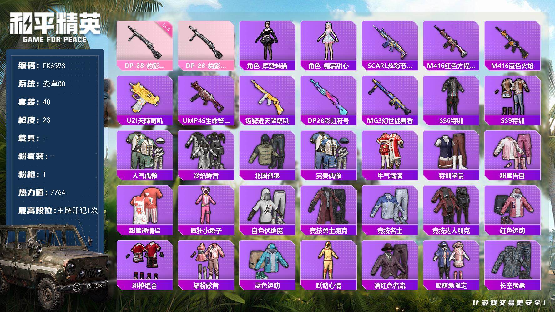 【493977】[17183896]【FK6393】40套装/枪械1/装备21/战备23/王牌印记1/热力值7764/五级DP-28-豹影疾电/DP-28-豹影疾电/摩登魅猫/糖霜甜心/SCAR-L-炫彩节奏/M416-红色方程式/M416-蓝色火焰/UZI-天降萌叽/UMP45-生命誓言/汤姆逊-天降萌叽/DP-28-彩虹符号/MG3-幻世战舞者/SS6特训/SS9特训/人气偶像/冷焰舞者/北