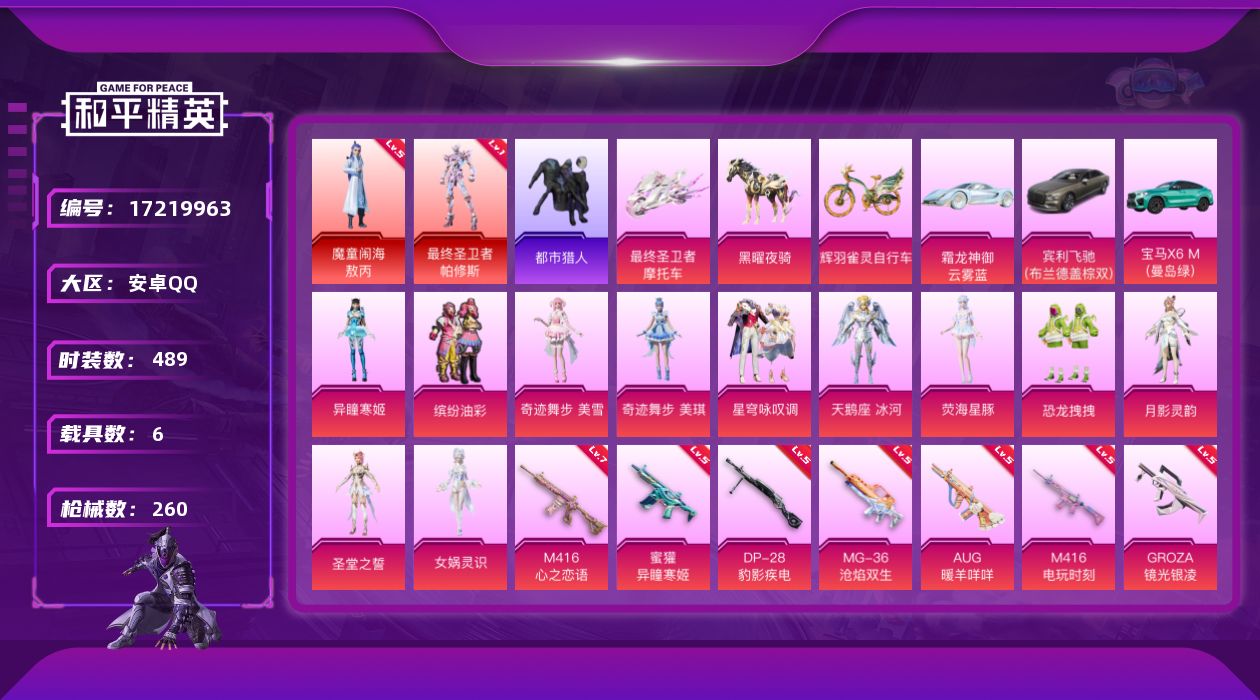 【498602】【不可二次】【安卓QQ】M416-电玩时刻 龟仙人 魔童闹海-敖丙 恐龙拽拽 漫步者 M416-心之恋语 都市猎人 迅捷狂鲨 缤纷油彩 最终圣卫者-帕修斯