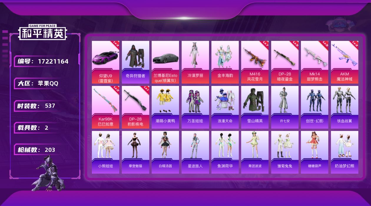 【498927】【可二次】【苹果QQ】水银刺客 暗夜契约 奇异狩猎者 M762-瑞龙福将 潮萌小黄鸭 兰博轿车灰色 AKM-魔法神域 仰望U9(雷霆紫) 空客蔚蓝之翼 DP-28-暗夜鎏金 M416-风花雪月 粉红小猪 瑞龙福将 激萌小黄鸭 风华少年志 浪漫天命 雪山精英 团圆交子