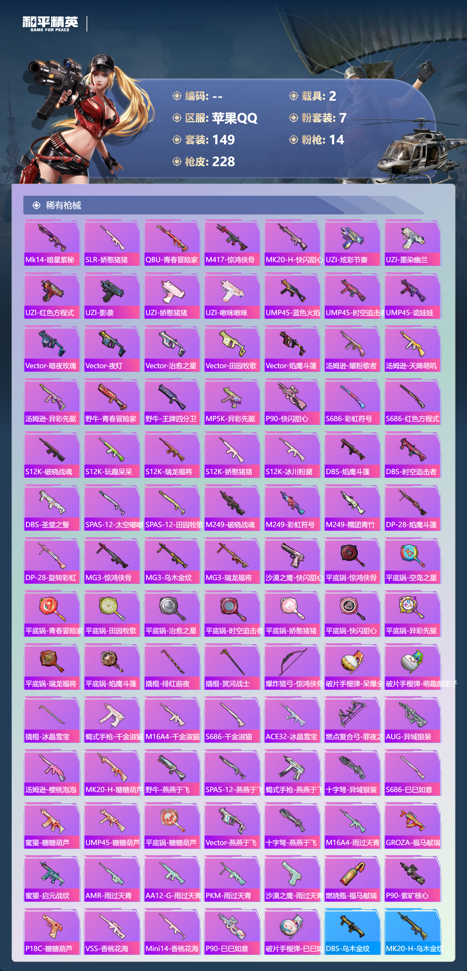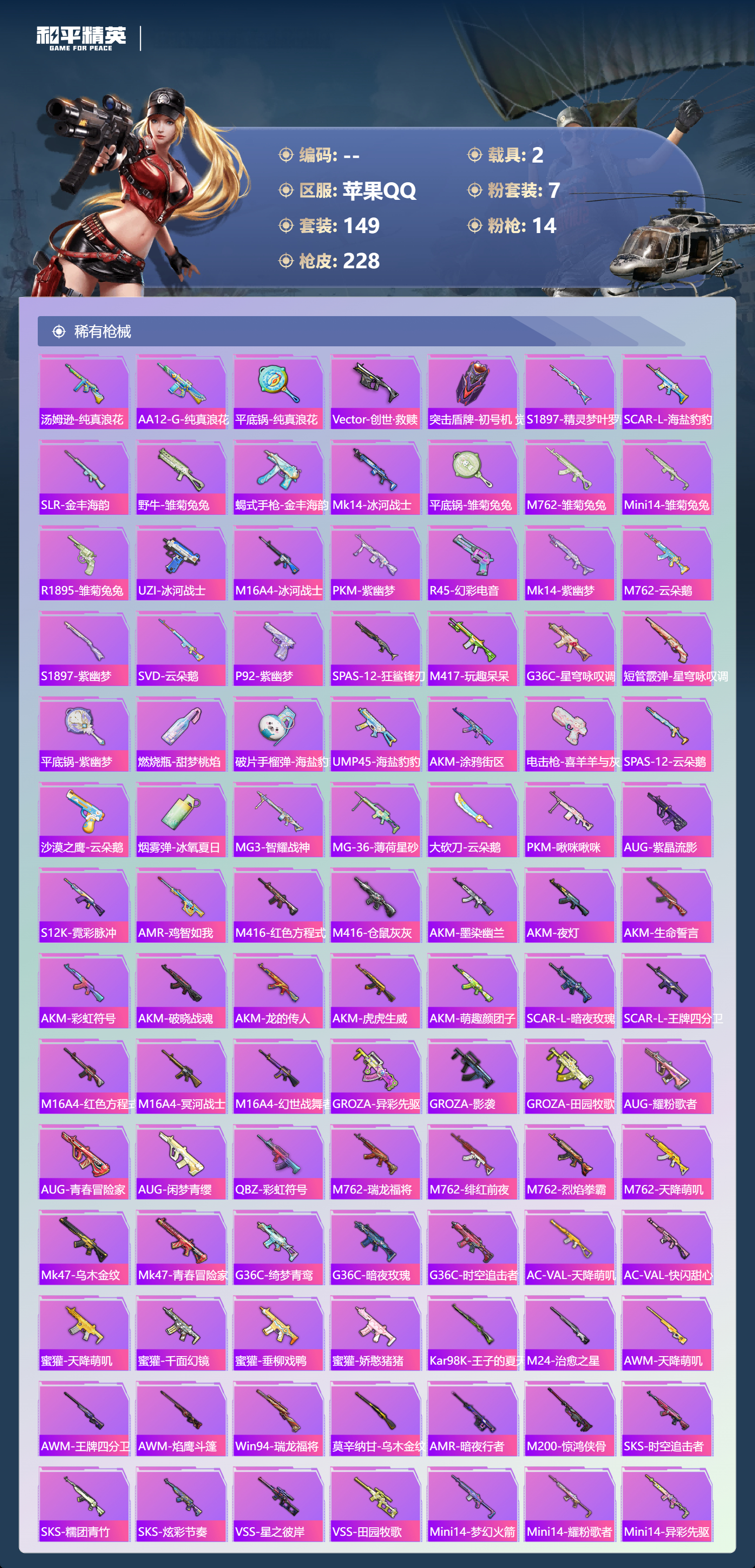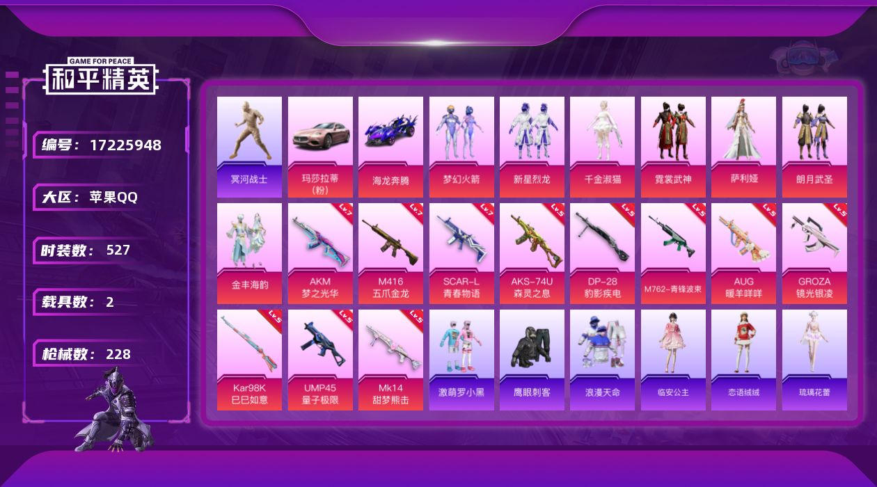 【499560】【不可二次】【苹果QQ】木乃伊 M762-青锋波束 M416-五爪金龙 漫步者 新星烈龙 M762-瑞龙福将 海龙奔腾 太空嘟嘟飞行器 UMP45-量子极限 梦幻火箭 AKM-梦之光华 M416-仓鼠灰灰 瑞龙福将 玛莎拉蒂粉色 浪漫天命 SCAR-L-青春物语 梦幻火箭飞行器 激萌罗小黑 团圆交子