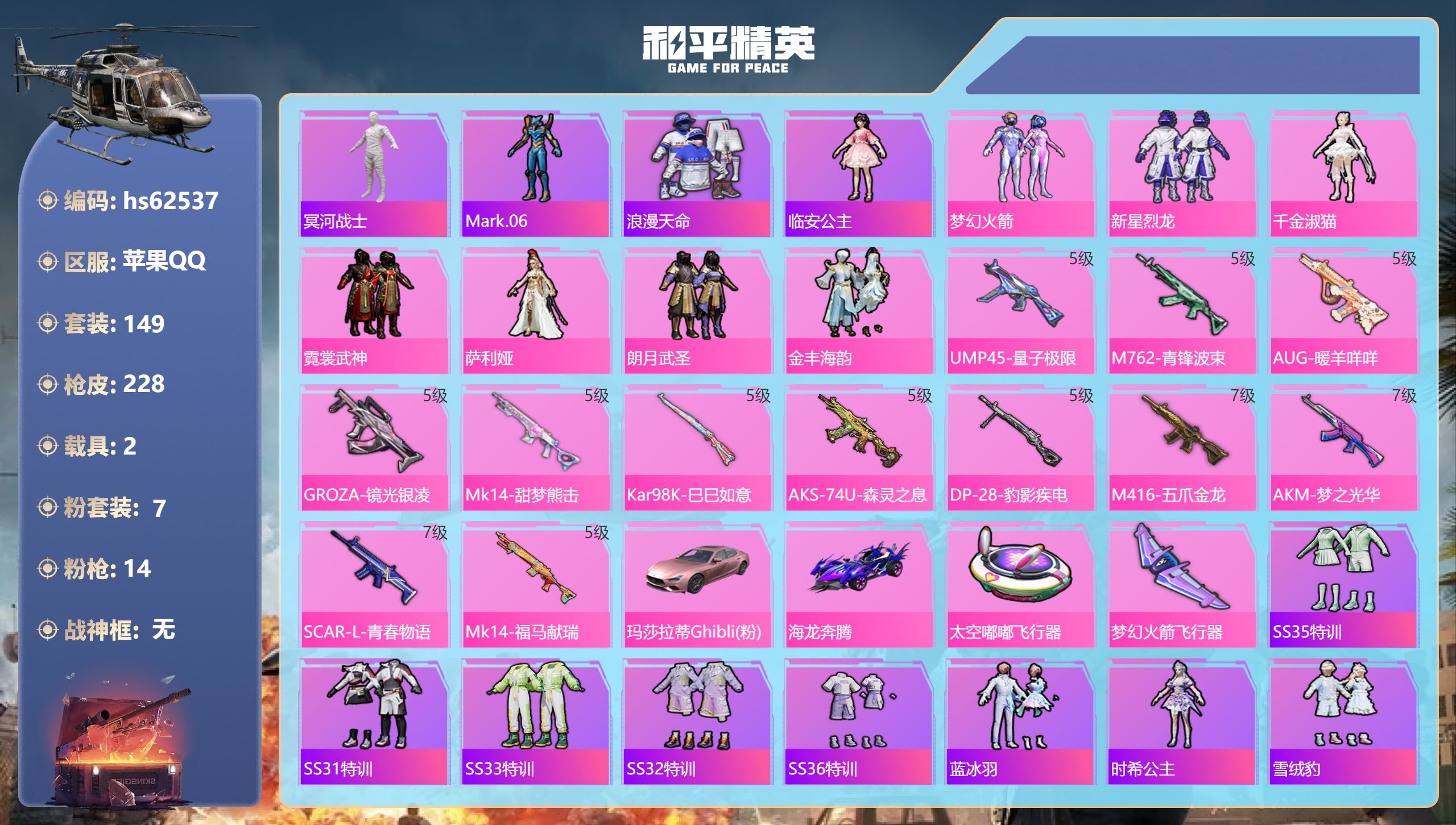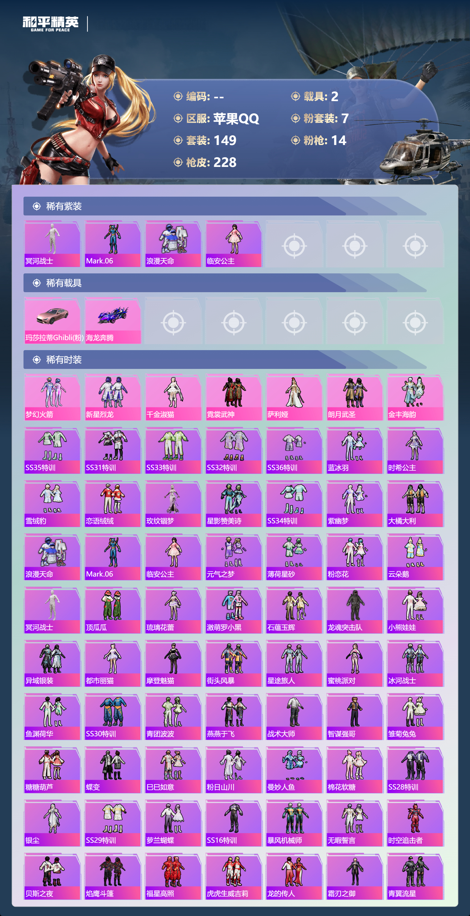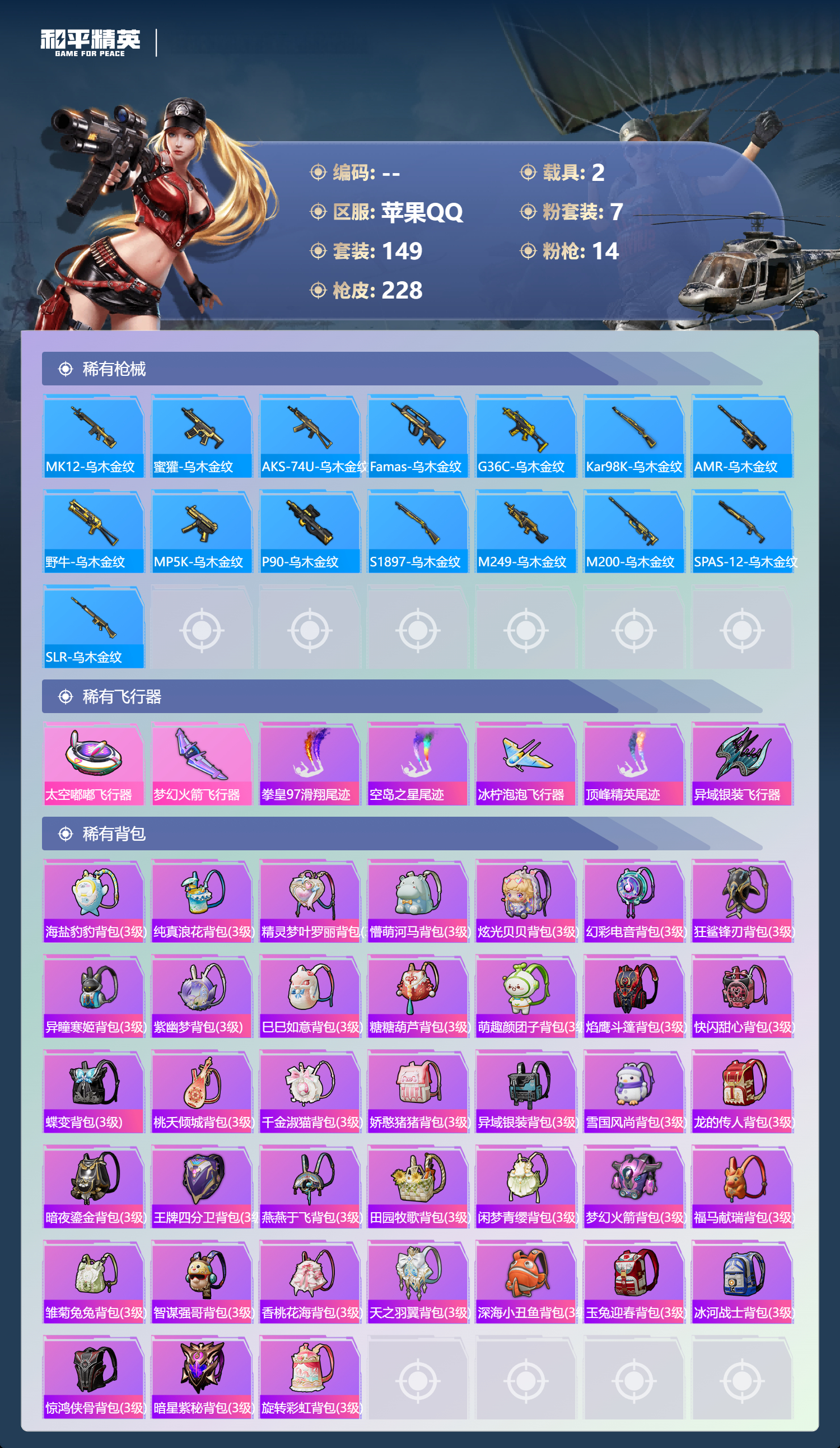 【499560】【不可二次】【苹果QQ】木乃伊 M762-青锋波束 M416-五爪金龙 漫步者 新星烈龙 M762-瑞龙福将 海龙奔腾 太空嘟嘟飞行器 UMP45-量子极限 梦幻火箭 AKM-梦之光华 M416-仓鼠灰灰 瑞龙福将 玛莎拉蒂粉色 浪漫天命 SCAR-L-青春物语 梦幻火箭飞行器 激萌罗小黑 团圆交子
