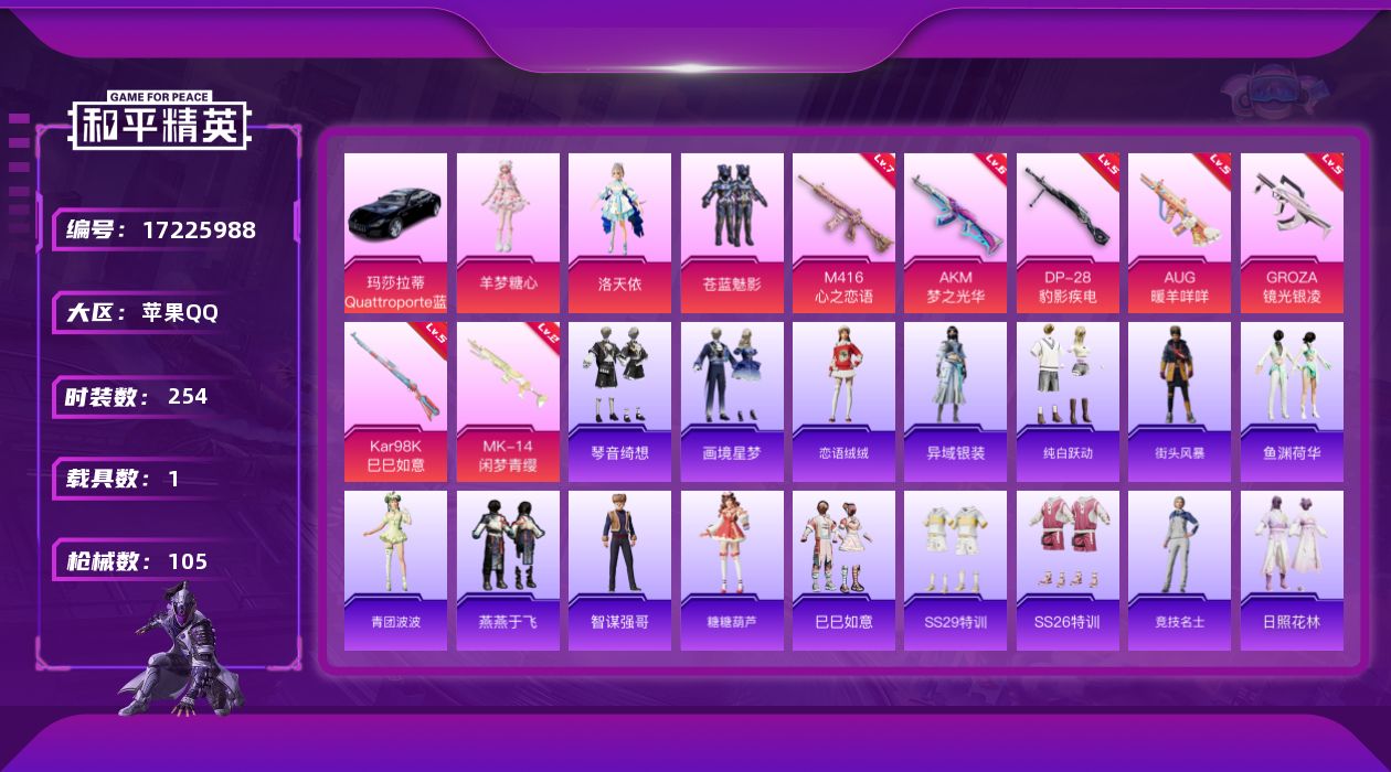 【499564】【不可二次】【苹果QQ】暗夜之虎 AKM-梦之光华 M416-心之恋语 AKM-缤纷海域 苍蓝魅影 粉红小猪 洛天依 MK14-闲梦青缨