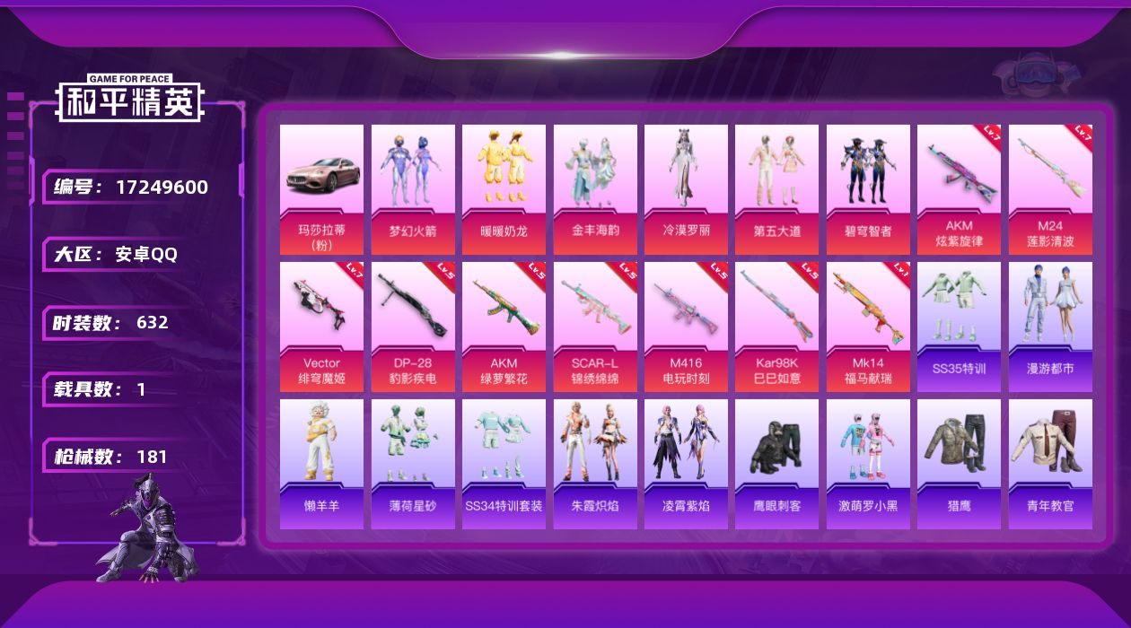 【502515】【可二次】【安卓QQ】龟仙人 漫步者 狂沙舞者 极速红龙 金羽特工 摩登艾咪 SCAR-L-锦绣绵绵 AKM-炫紫旋律 摄影小熊猫 梦幻火箭 玛莎拉蒂粉色 浪漫天命 激萌罗小黑