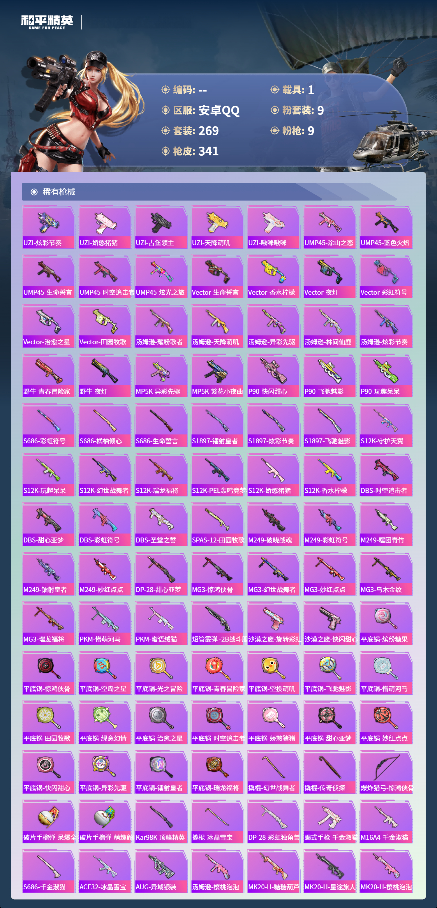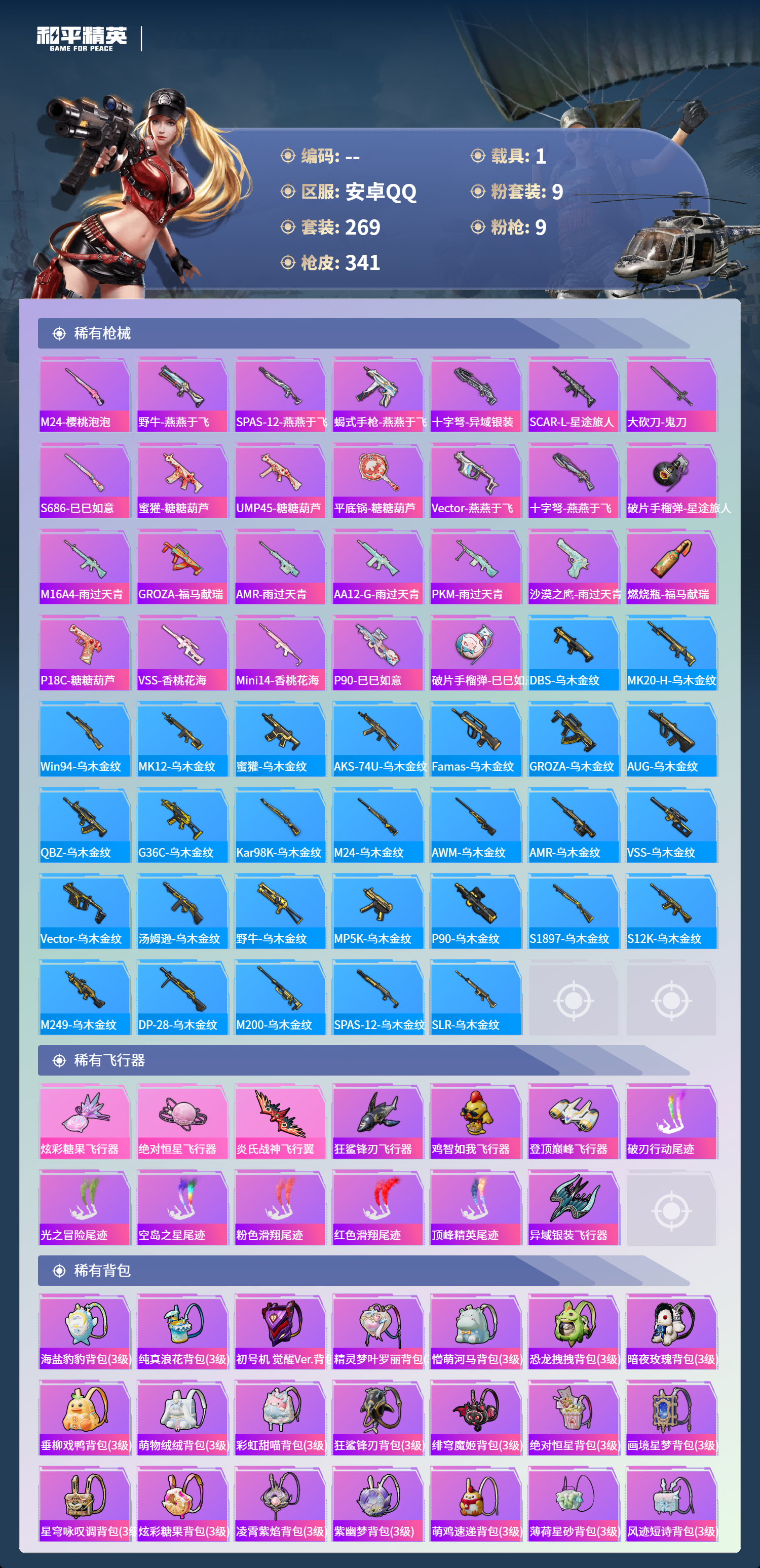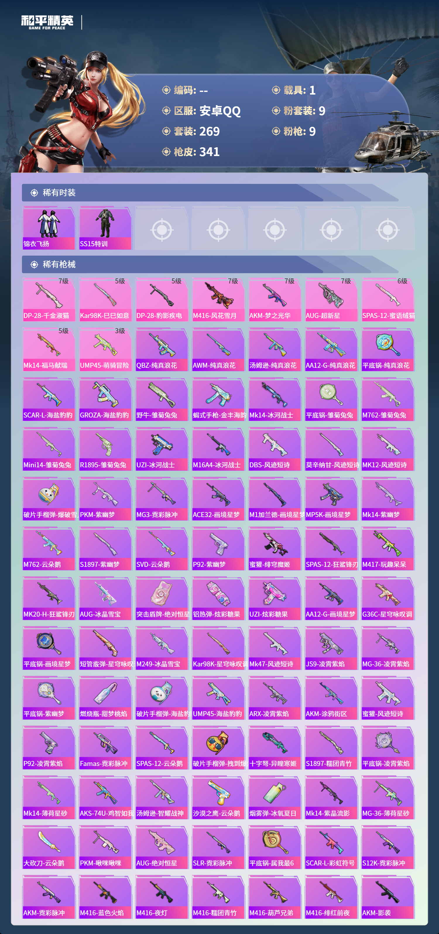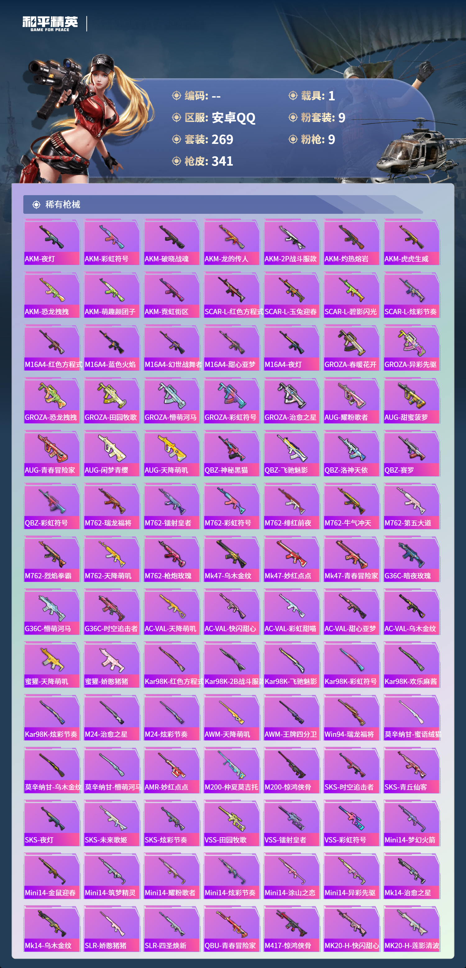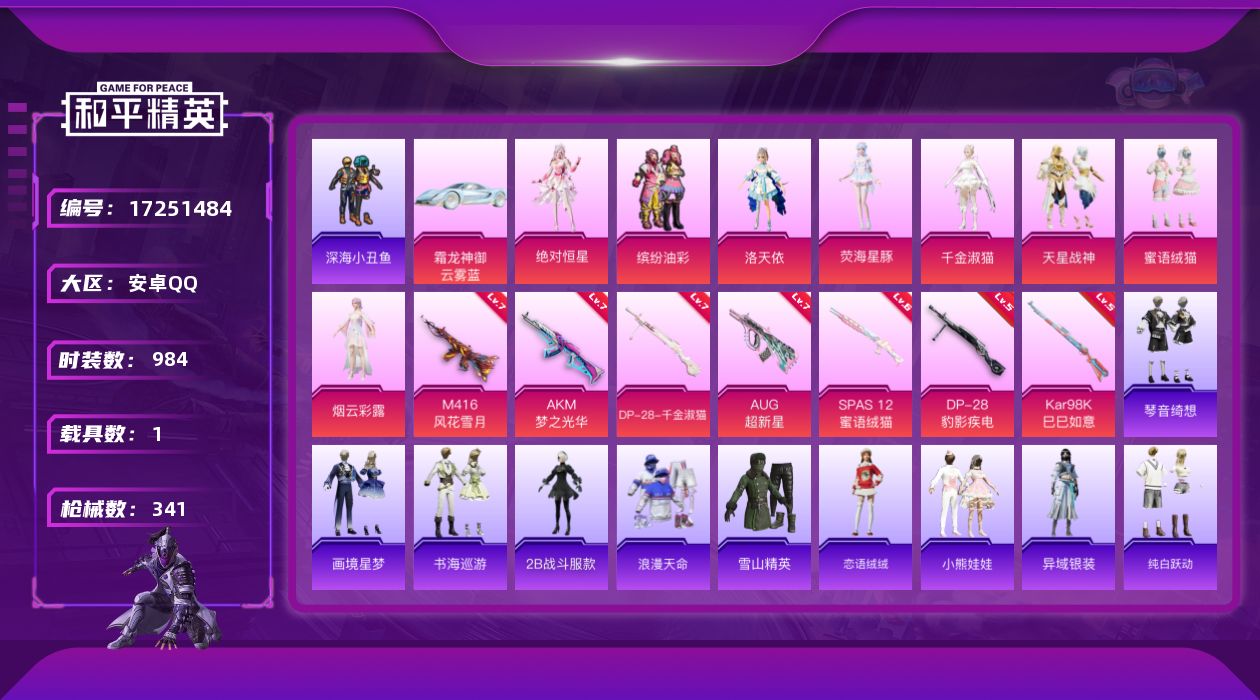 【503033】【可二次】【安卓QQ】龟仙人 大橘为重 M762-瑞龙福将 AUG-超新星 洛天依 极速红龙 豚鼠丹丹 炎氏战神飞行翼 汤姆逊-林间仙鹿 M416-风花雪月 AKM-梦之光华 缤纷油彩 深海小丑鱼 瑞龙福将 抹茶蜜豆 醒狮腾龙 浪漫天命 雪山精英 纯白誓言 团圆交子