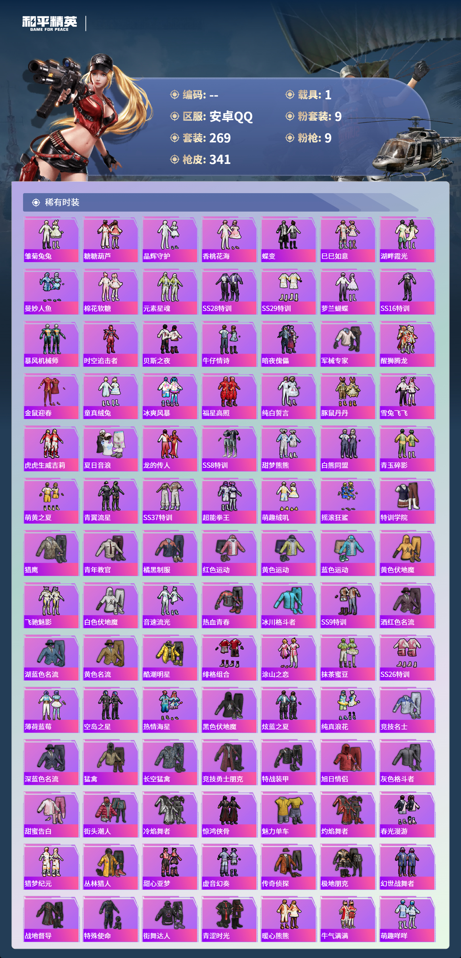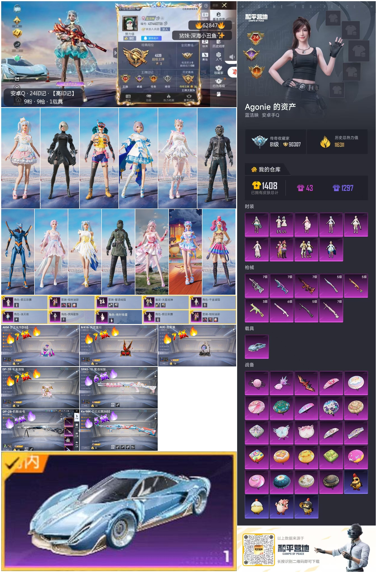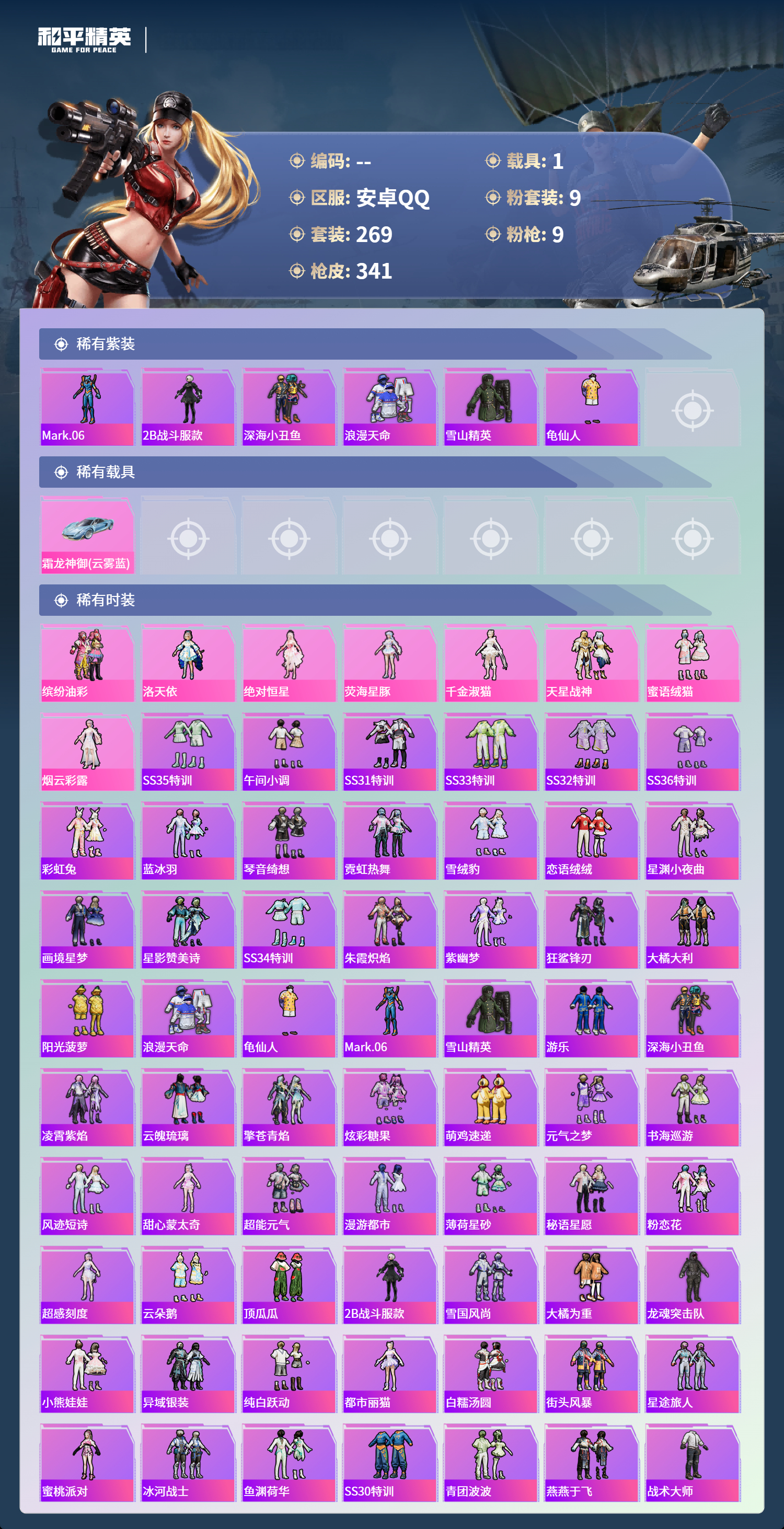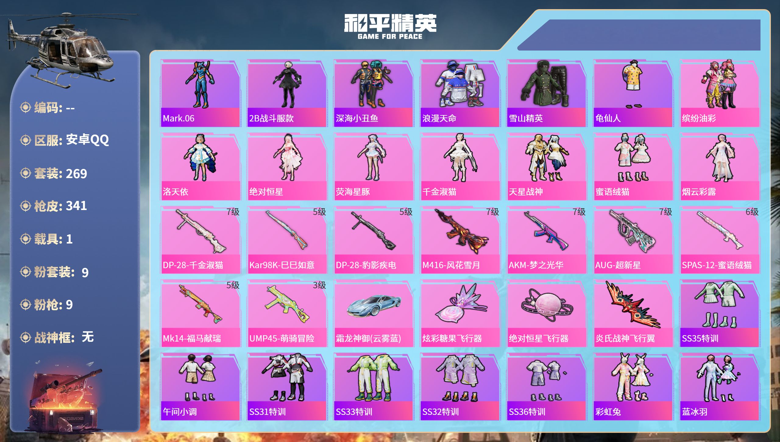 【503033】【可二次】【安卓QQ】龟仙人 大橘为重 M762-瑞龙福将 AUG-超新星 洛天依 极速红龙 豚鼠丹丹 炎氏战神飞行翼 汤姆逊-林间仙鹿 M416-风花雪月 AKM-梦之光华 缤纷油彩 深海小丑鱼 瑞龙福将 抹茶蜜豆 醒狮腾龙 浪漫天命 雪山精英 纯白誓言 团圆交子