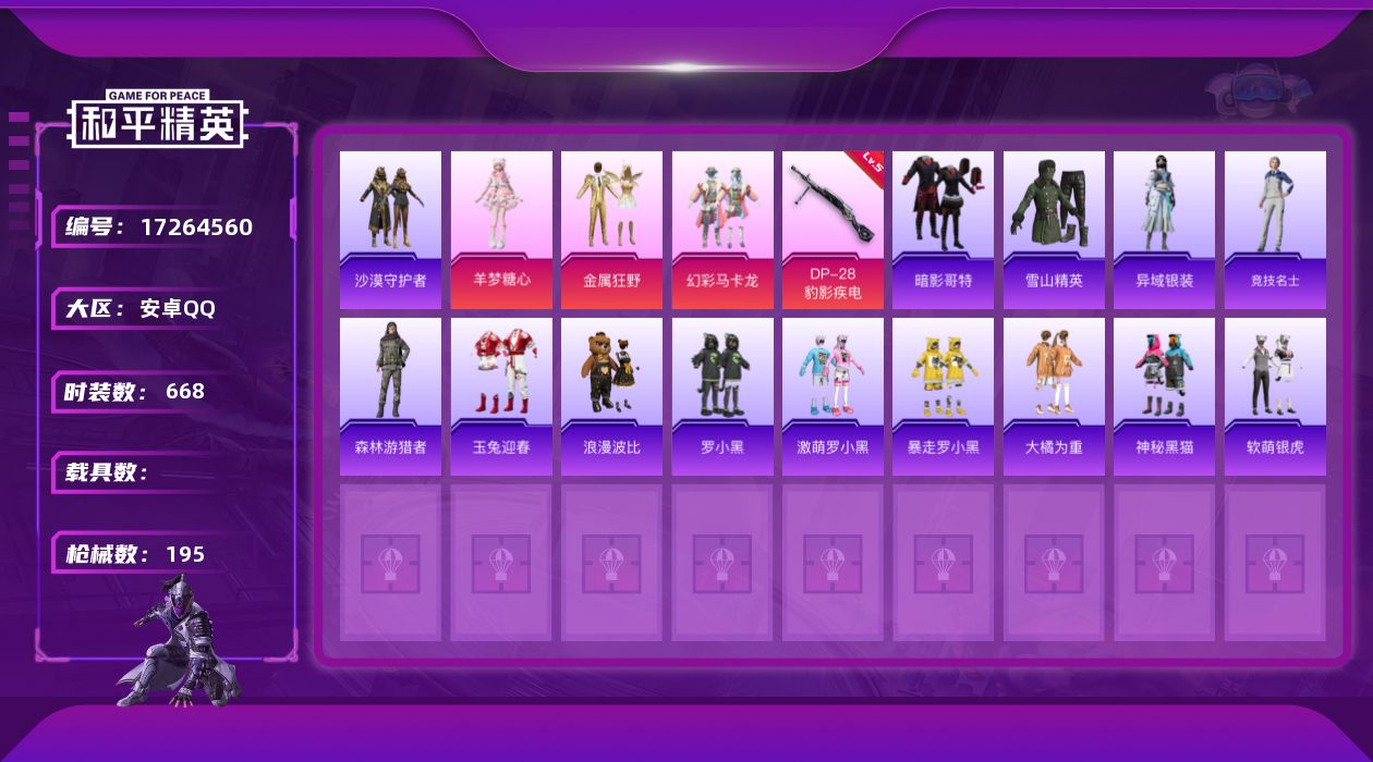 【504557】【不可二次】【安卓QQ】软萌银虎 幻彩马卡龙 大橘为重 M249-古堡领主 机械英豪 金属狂野 极速红龙 忍者信条 罗小黑 白月香洋装 神秘黑猫飞行器 浪漫波比 风华少年志 沙漠守护者 神秘黑猫 暗影哥特 雪山精英 激萌罗小黑