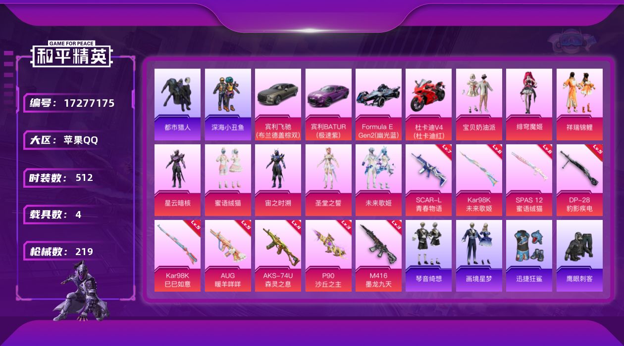 【506264】【可二次】【苹果QQ】龟仙人 Formula E Gen2(蓝) 漫步者 P90-沙丘之主 都市猎人 迅捷狂鲨 Kar98k-未来歌姬 M416-墨龙九天 AKM-缤纷海域 深海小丑鱼 宝贝奶油派 绝色倾城飞行器 浪漫天命 SCAR-L-青春物语 梦幻火箭飞行器 暗影哥特 镜光幻境飞行翼