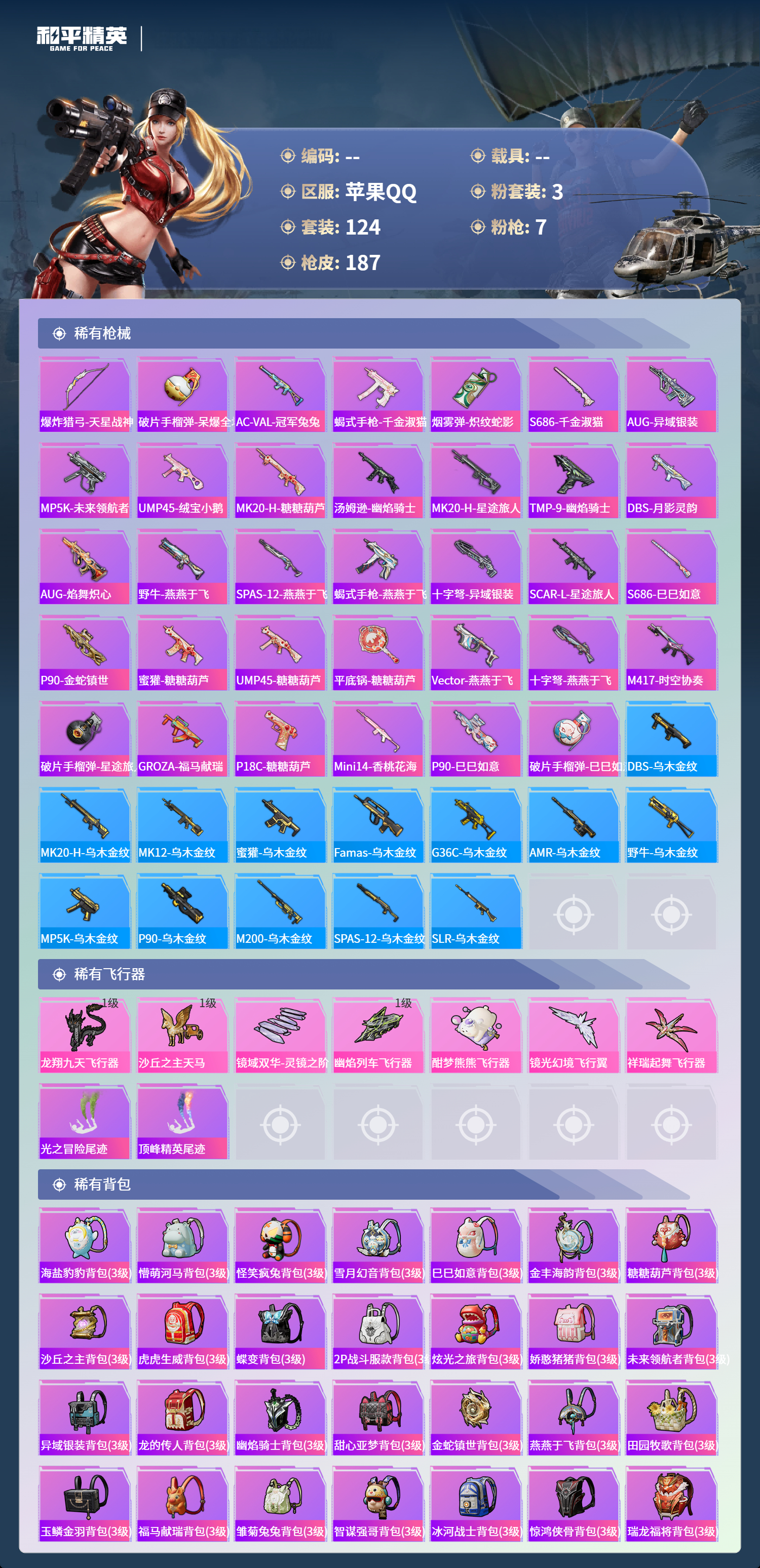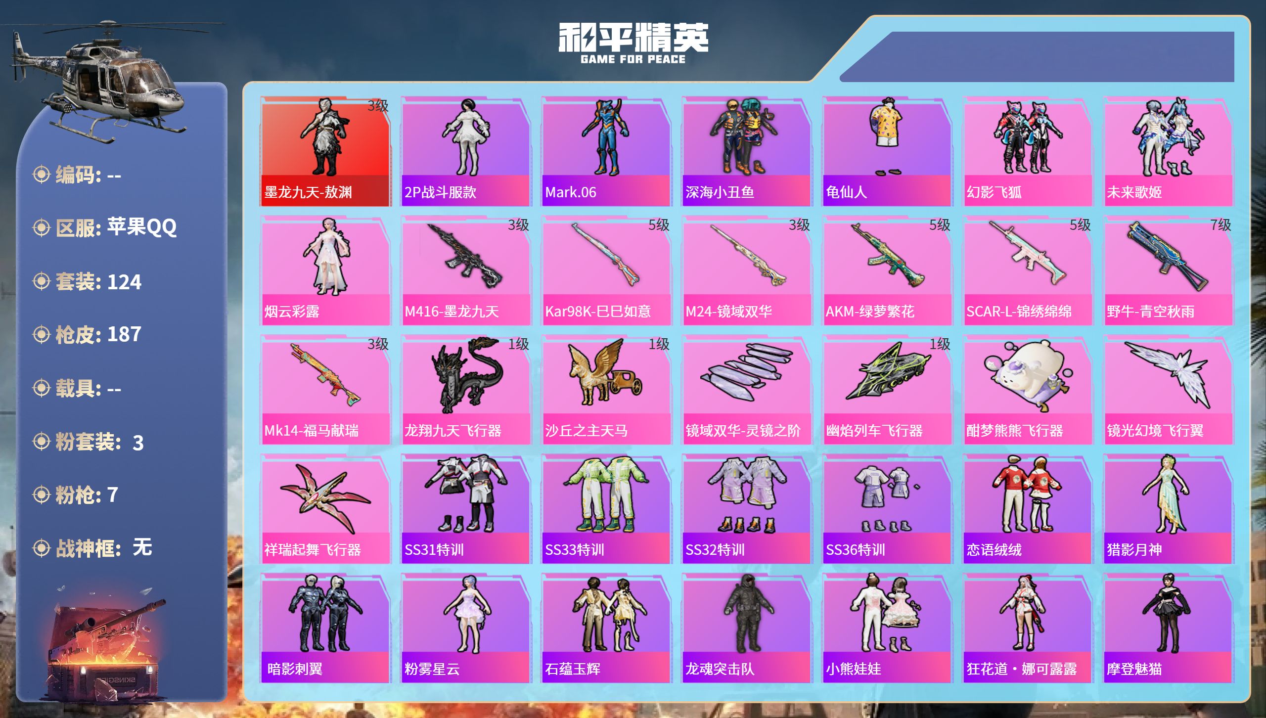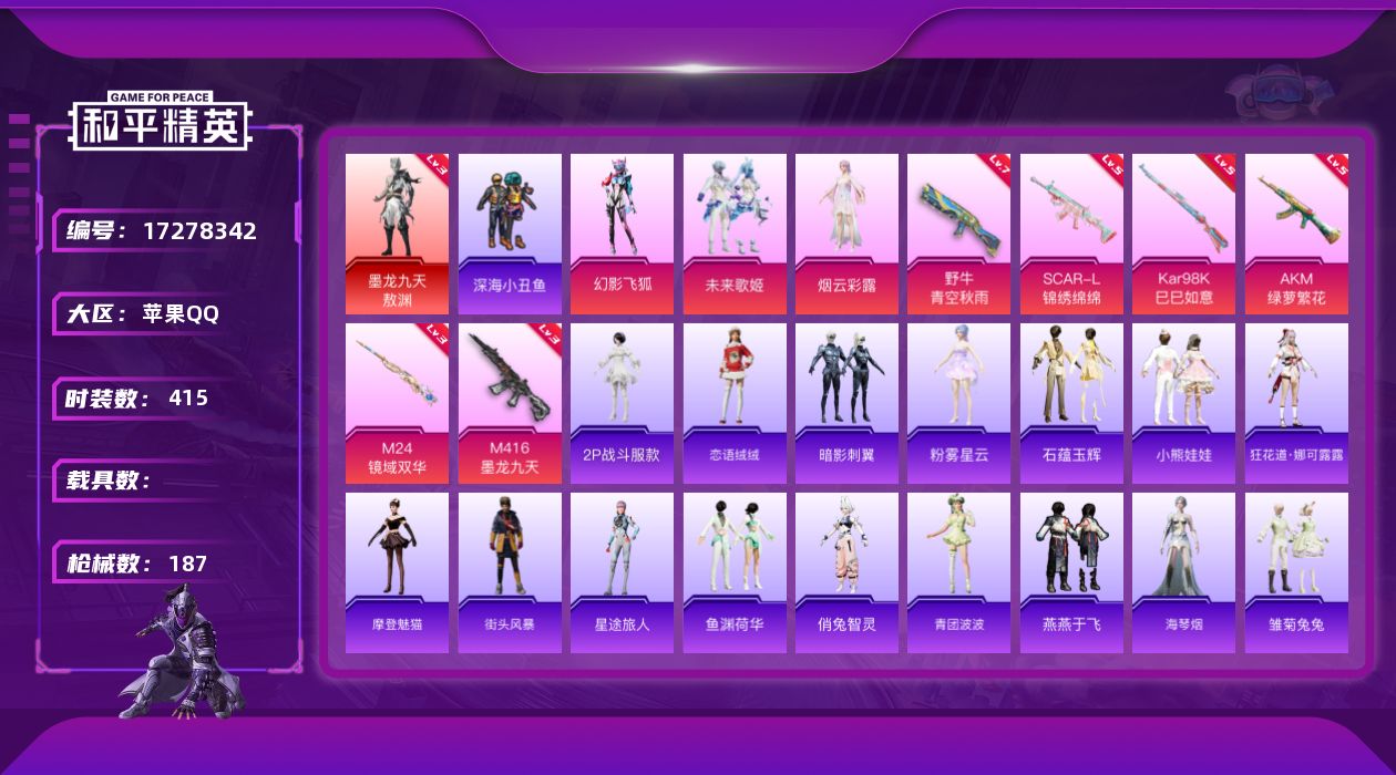 【506670】【不可二次】【苹果QQ】龟仙人 AKM-绿萝繁花 M24-镜域双华 M762-瑞龙福将 龙翔九天飞行器 M416-墨龙九天 SCAR-L-锦绣绵绵 野牛-青空秋雨 墨龙九天-敖渊 粉红小猪 深海小丑鱼 瑞龙福将 抹茶蜜豆 风华少年志 镜光幻境飞行翼 团圆交子