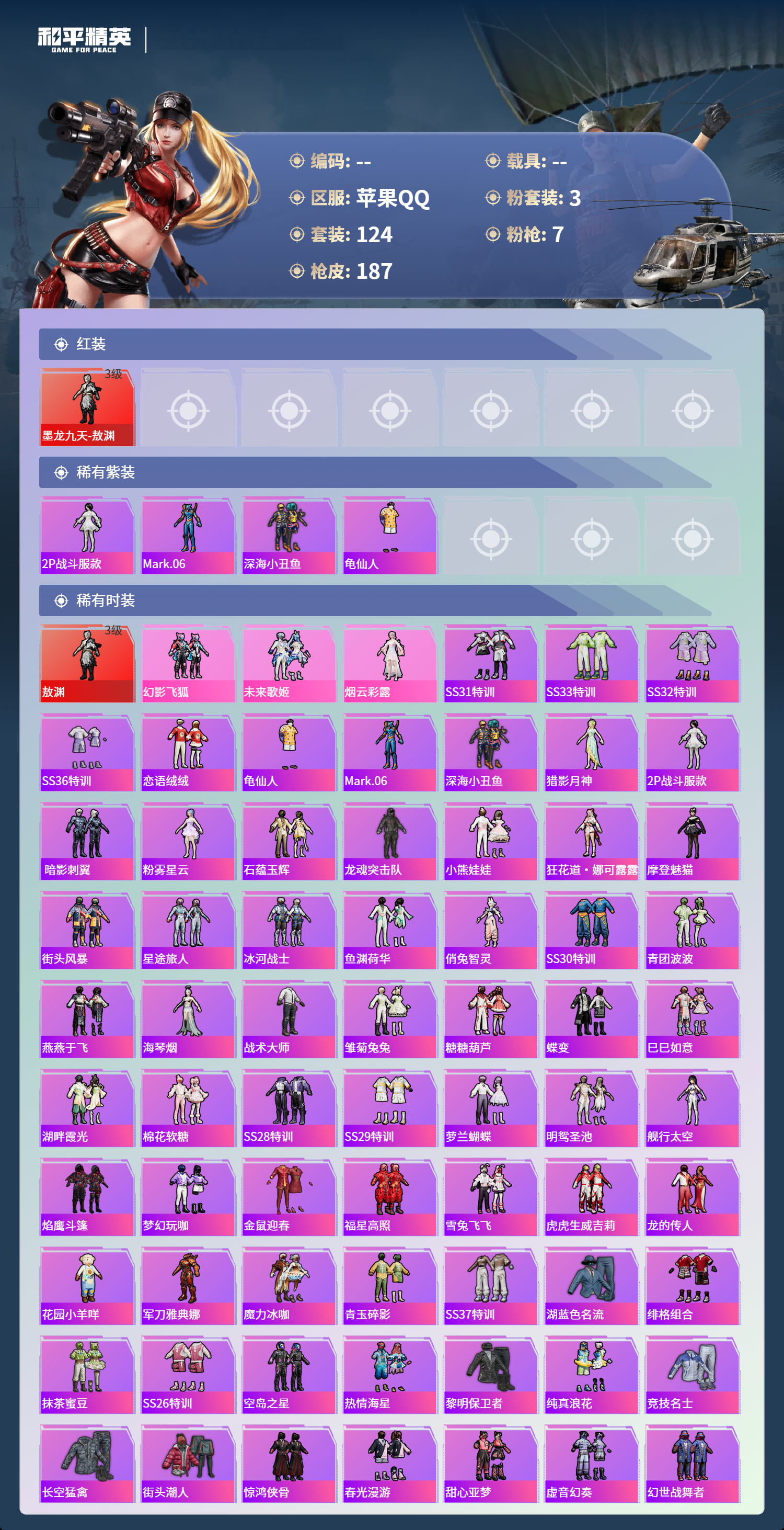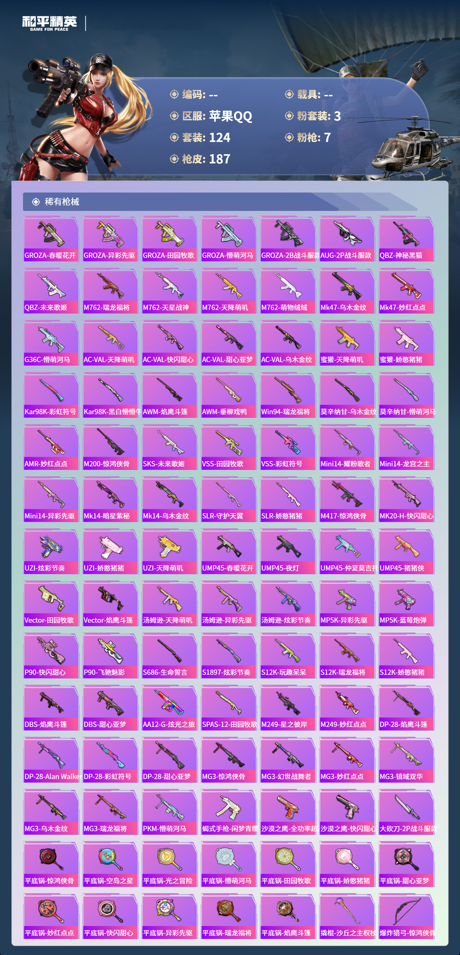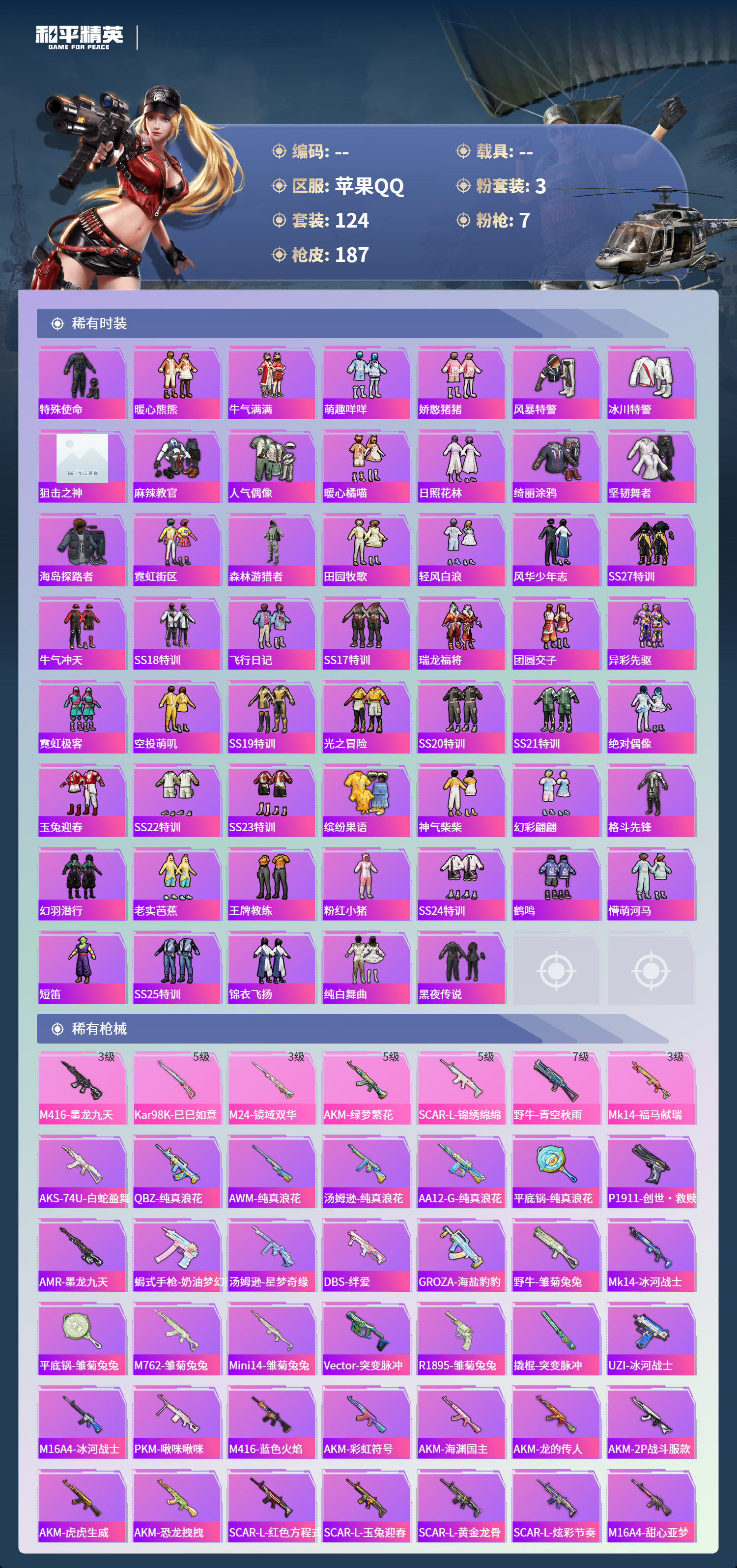 【506670】【不可二次】【苹果QQ】龟仙人 AKM-绿萝繁花 M24-镜域双华 M762-瑞龙福将 龙翔九天飞行器 M416-墨龙九天 SCAR-L-锦绣绵绵 野牛-青空秋雨 墨龙九天-敖渊 粉红小猪 深海小丑鱼 瑞龙福将 抹茶蜜豆 风华少年志 镜光幻境飞行翼 团圆交子